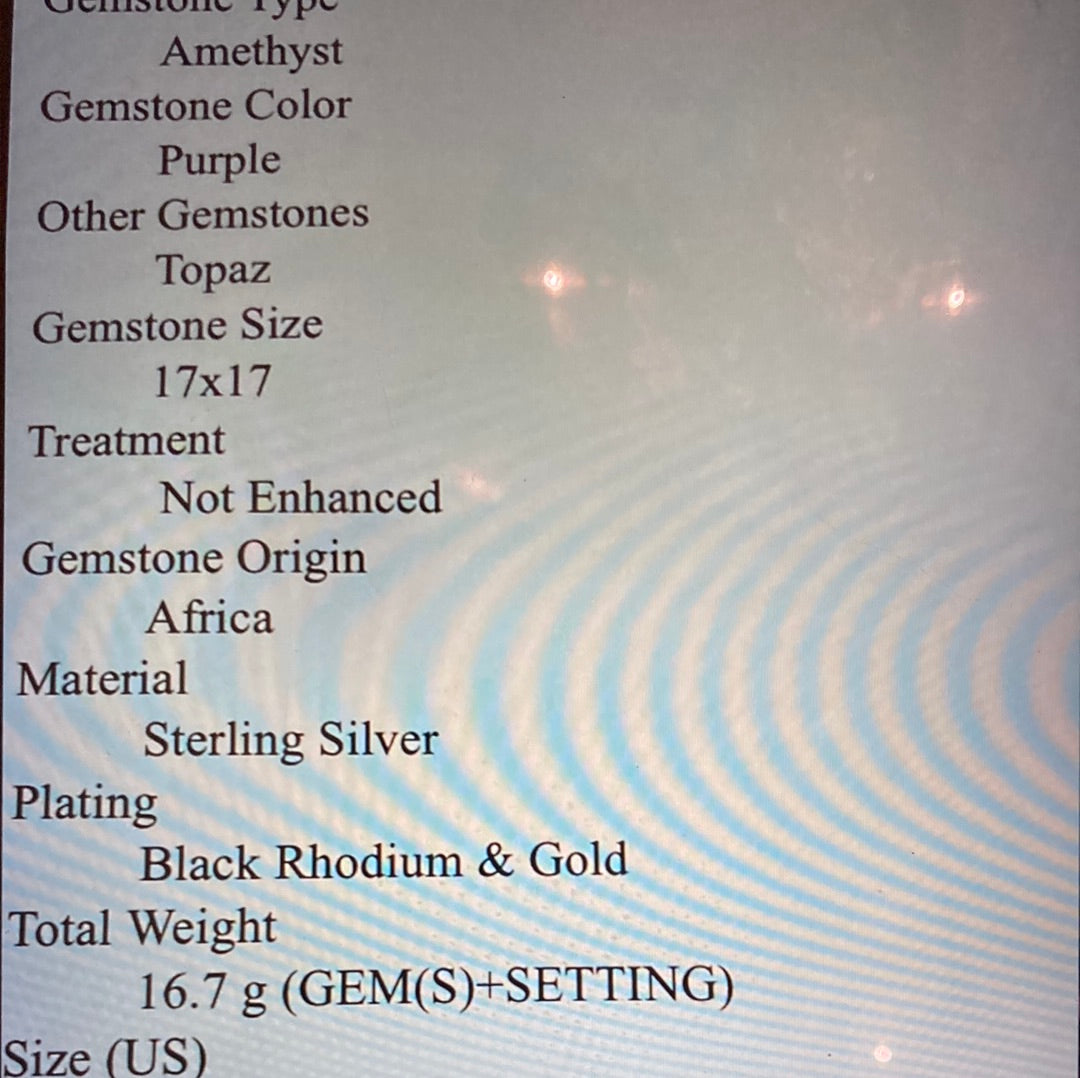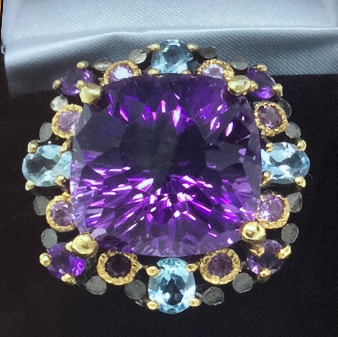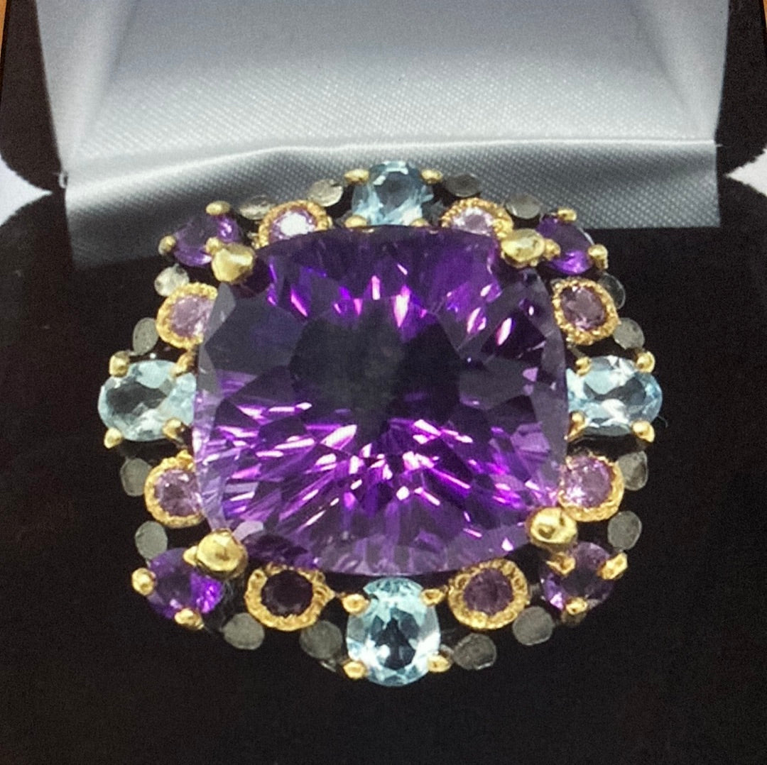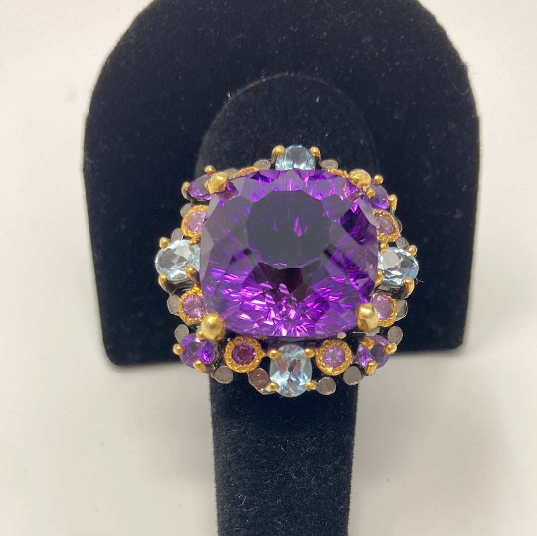 Top of the line, over 30+ CTW of Genuine Amethyst, a over the top ring for those who demand the best. Accented with genuine Topaz, set in a solid .925 sterling silver with Rhodium and 14K gold overlay. A true unique work of art and a one of a kind custom designed creation. Size 8 1/2