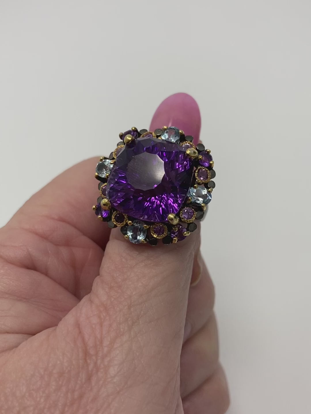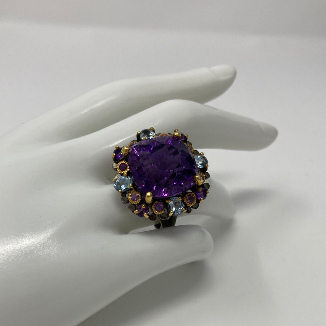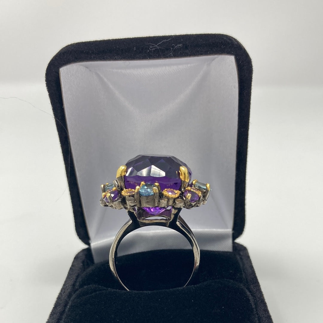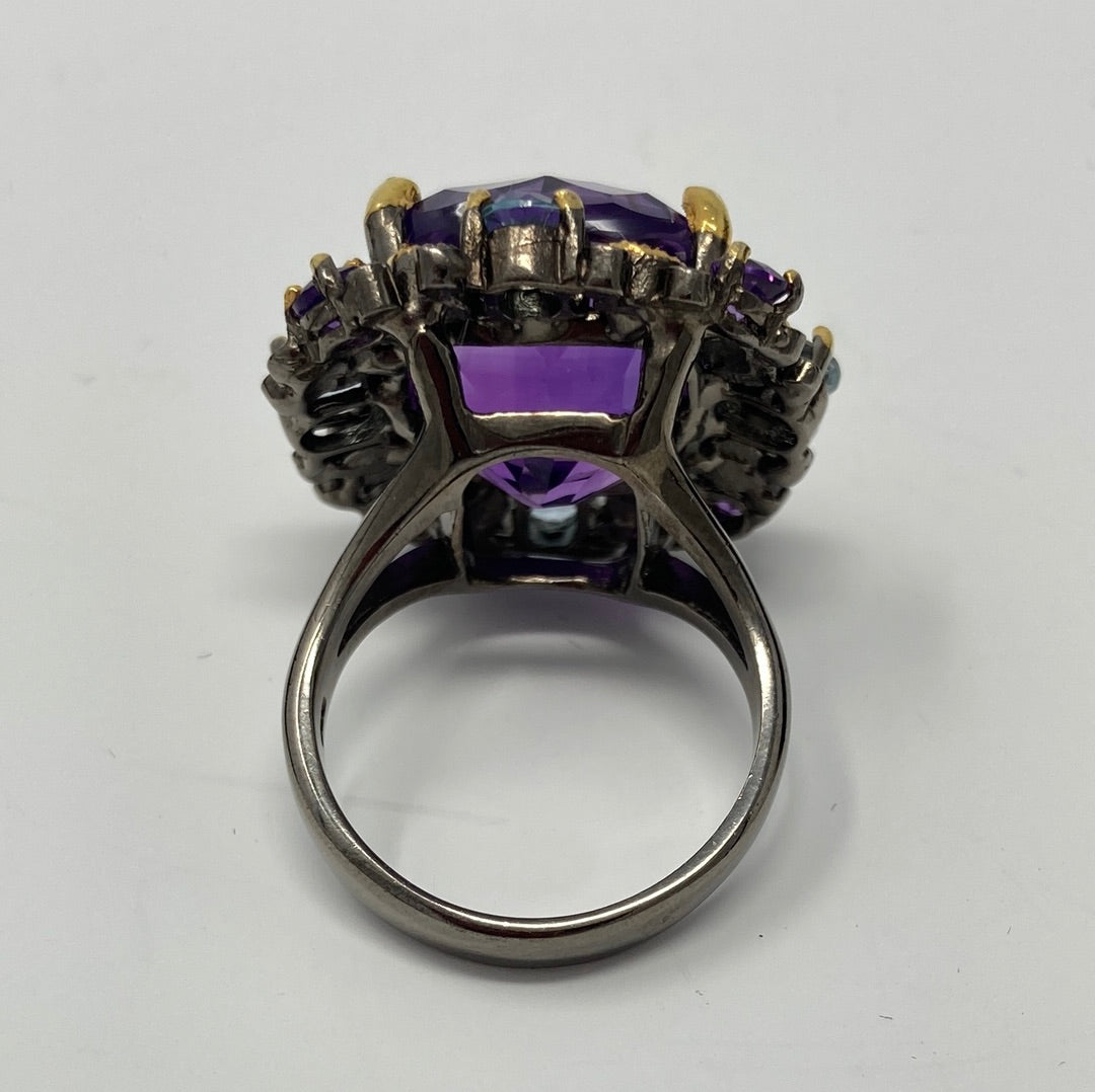 Top of the line, over 30+ CTW of Genuine Amethyst, a over the top ring for those who demand the best. Accented with genuine Topaz, set in a solid .925 sterling silver with Rhodium and 14K gold overlay. A true unique work of art and a one of a kind custom designed creation. Size 8 1/2