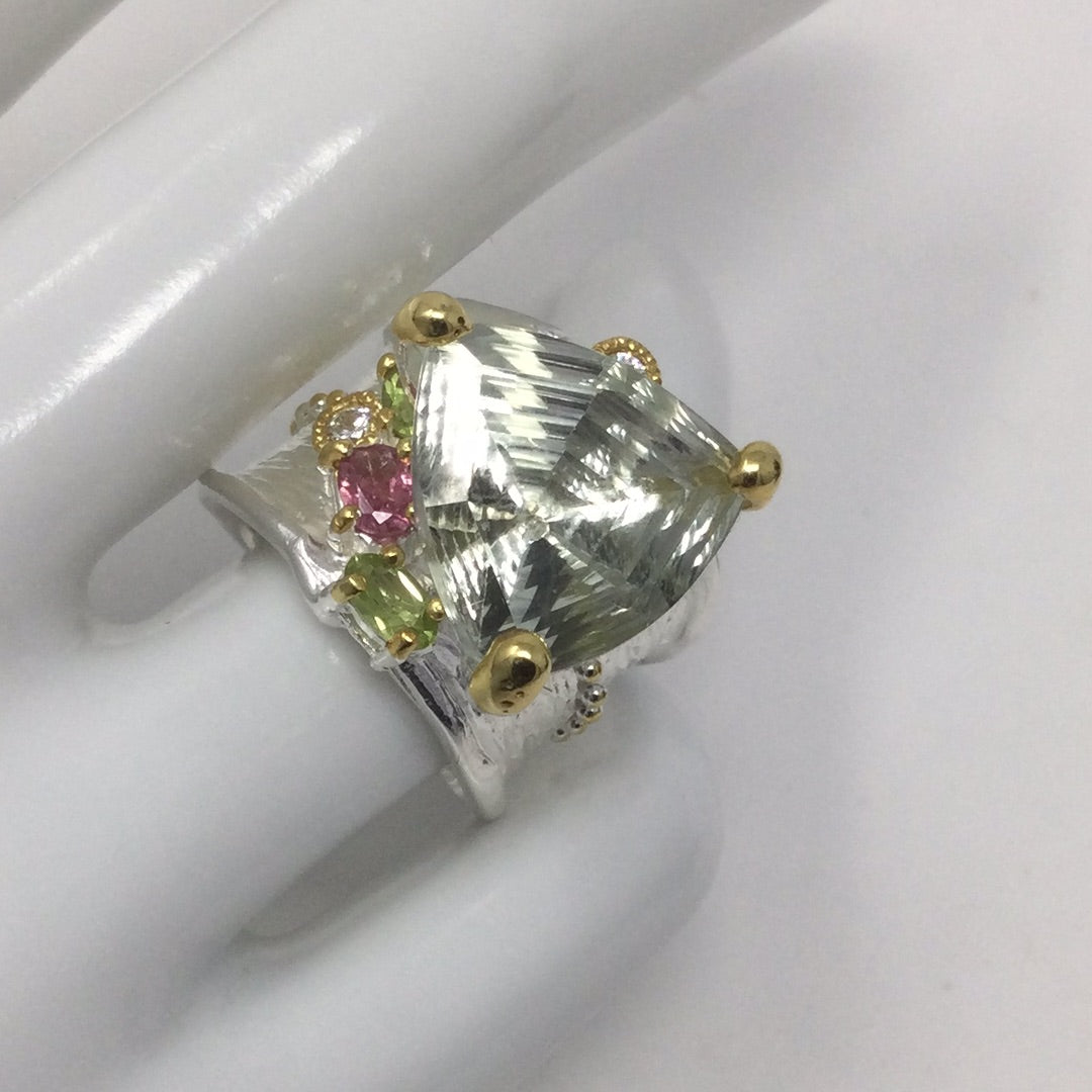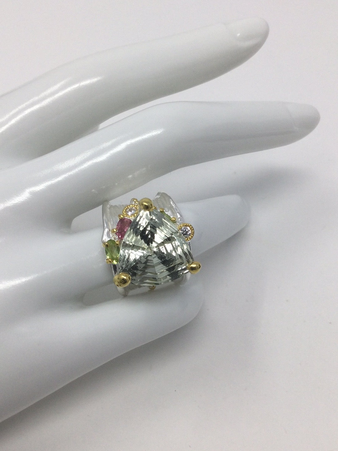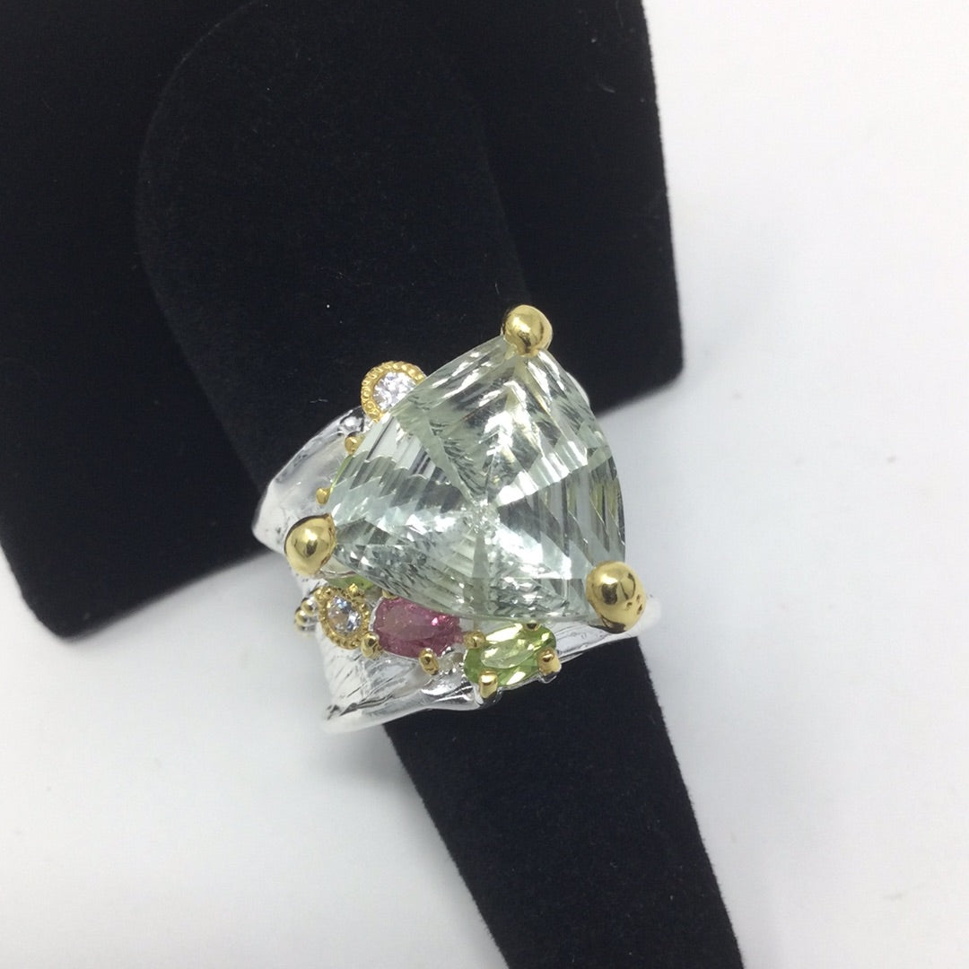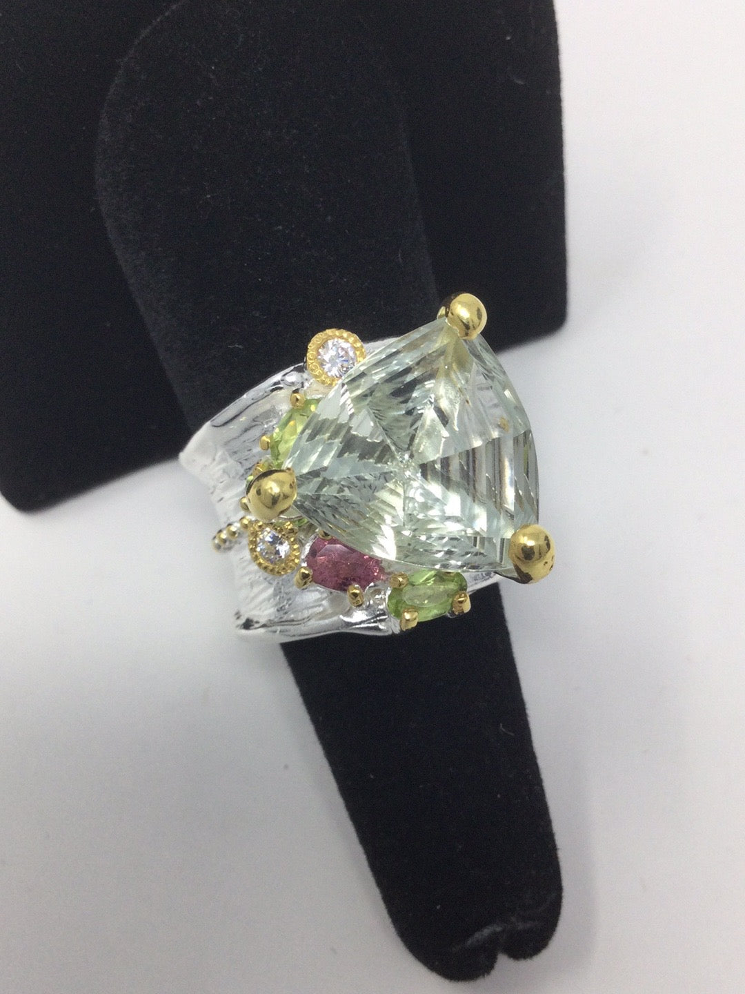 A extra special top quality genuine Green Amethyst hand selected to be artfully faceted in this exceptional artistic trillion cut with fancy carving that resembles an infinity cut. It’s so striking and the gemologist is showing off his brilliant talents with this gemstone. A contemporary styling and accented with a genuine Pink Tourmaline and Peridot. Set in .925 sterling silver in this wide band with a 14K white and yellow gold overlay. It’s just breathtaking, a one of a kind custom crafted artistic treasure you won’t find anyone else wearing. Size 7 1/2