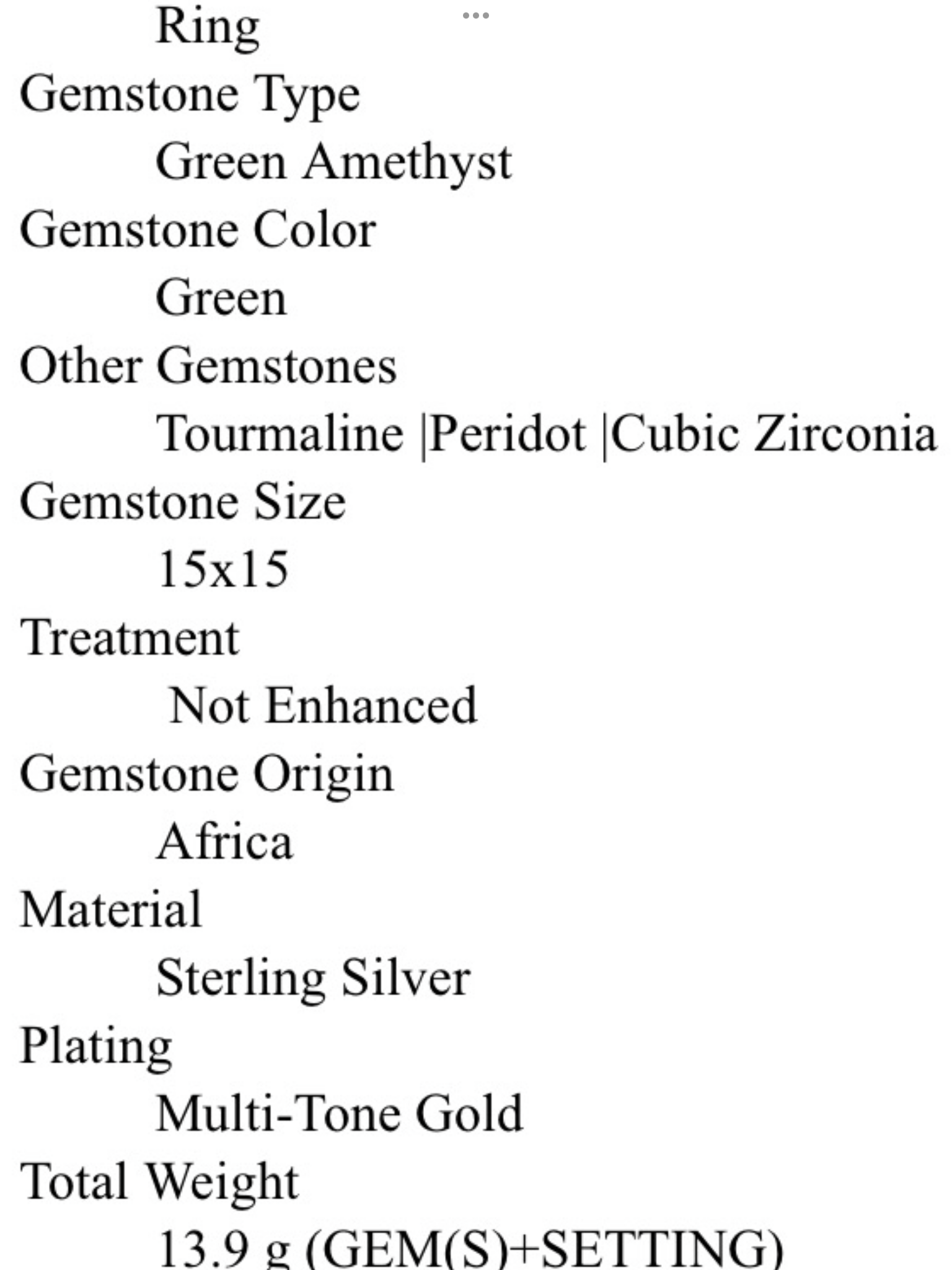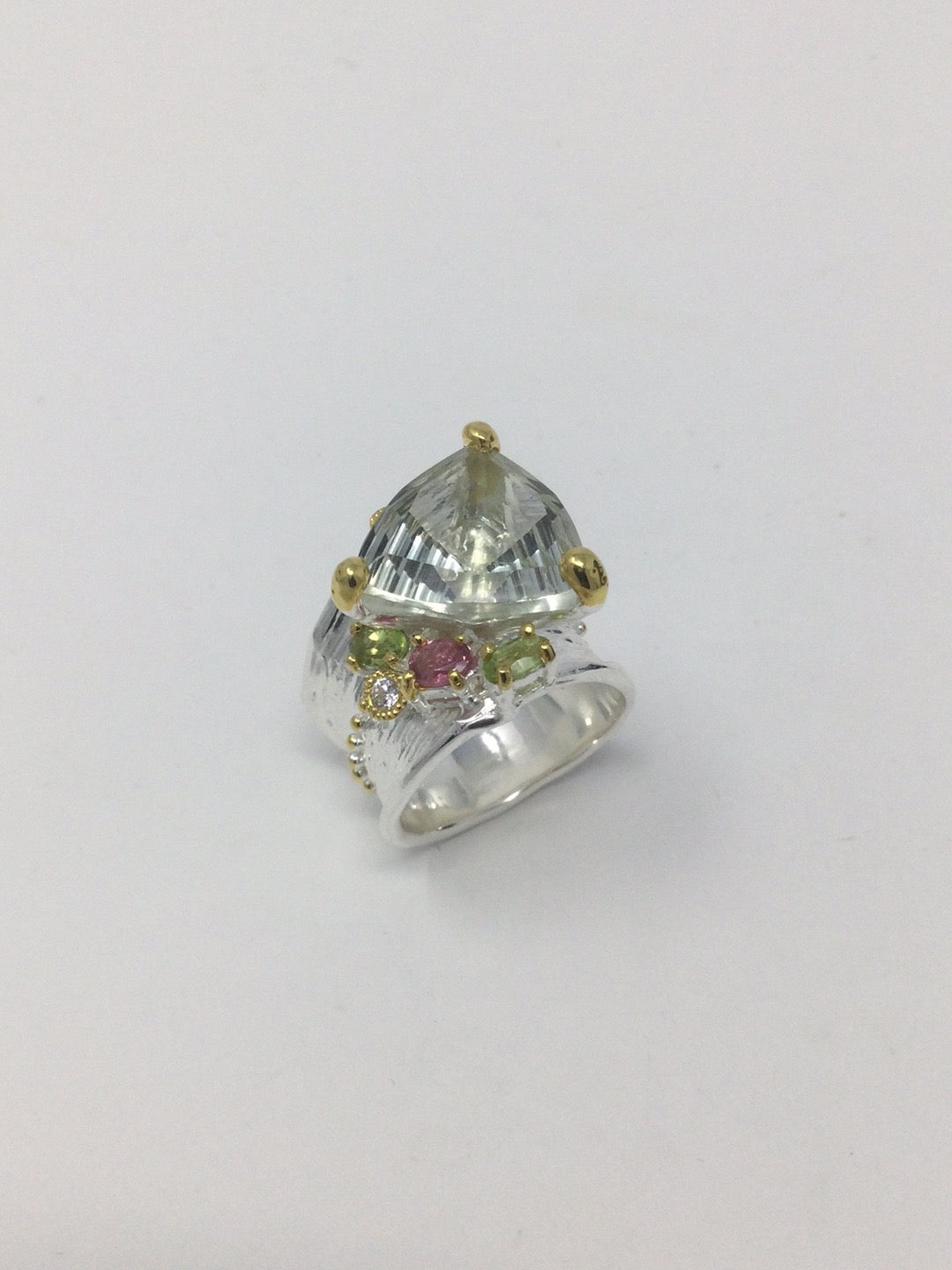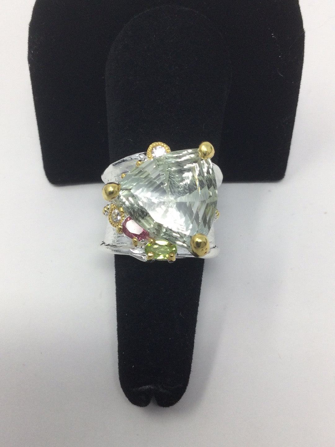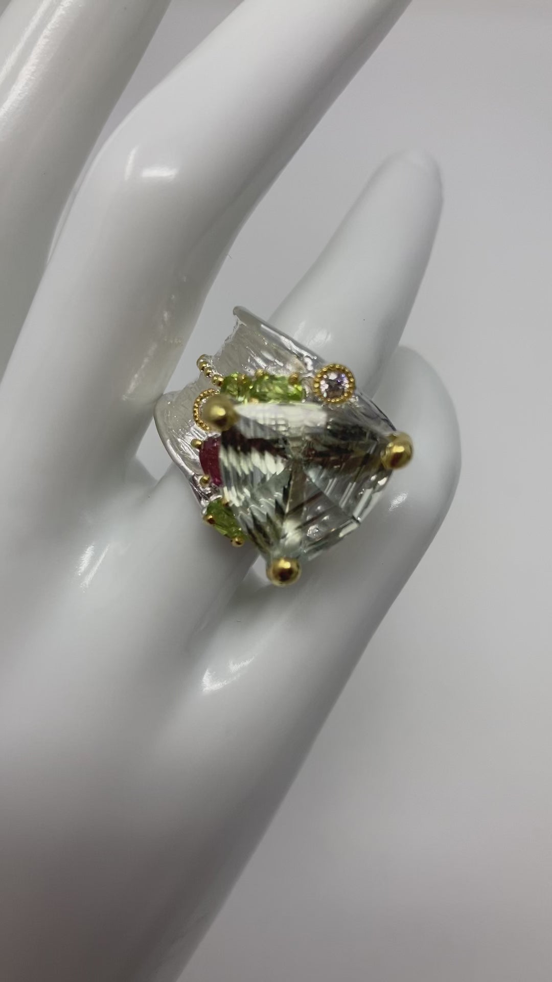 A extra special top quality genuine Green Amethyst hand selected to be artfully faceted in this exceptional artistic trillion cut with fancy carving that resembles an infinity cut. It’s so striking and the gemologist is showing off his brilliant talents with this gemstone. A contemporary styling and accented with a genuine Pink Tourmaline and Peridot. Set in .925 sterling silver in this wide band with a 14K white and yellow gold overlay. It’s just breathtaking, a one of a kind custom crafted artistic treasure you won’t find anyone else wearing. Size 7 1/2