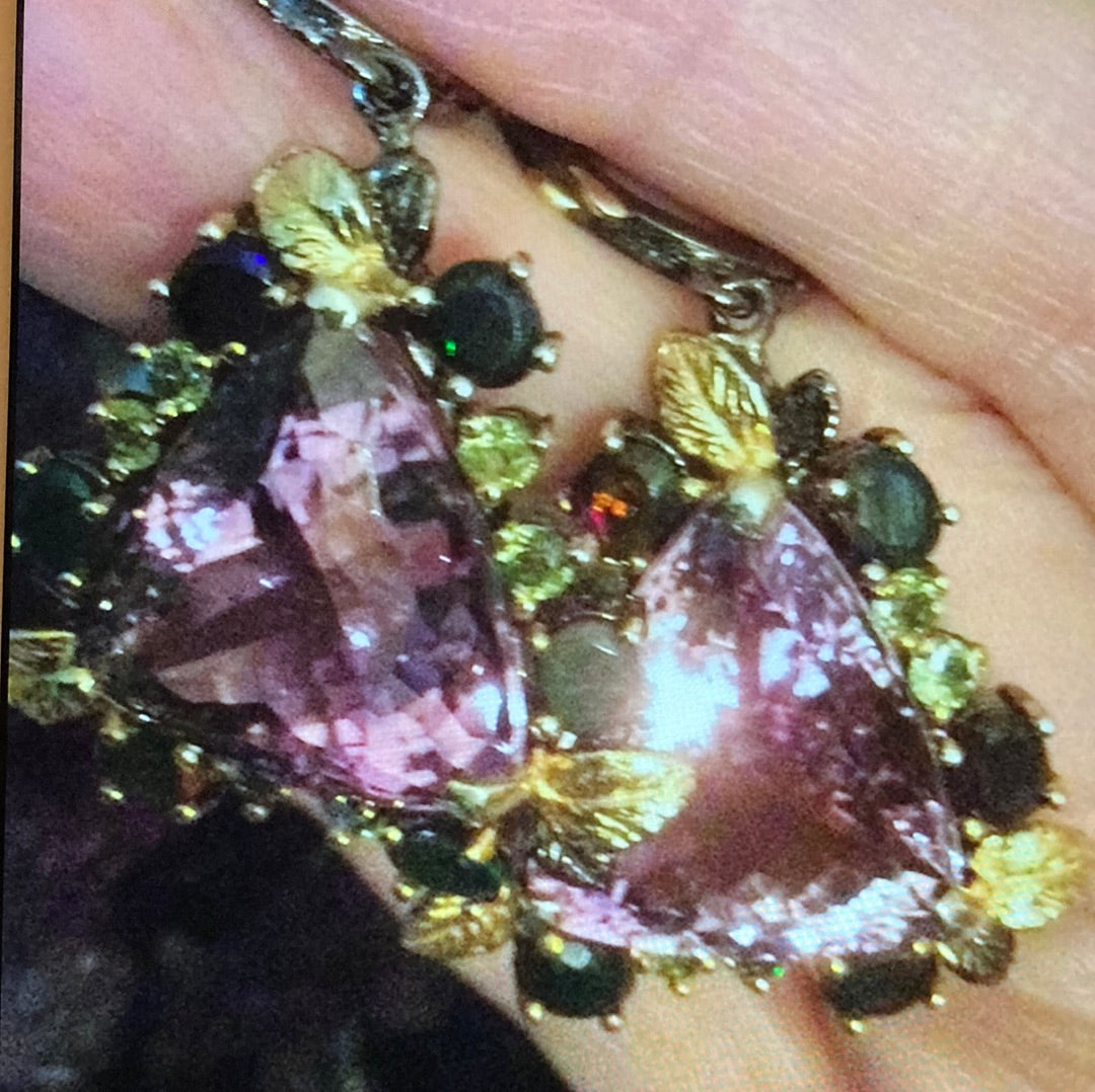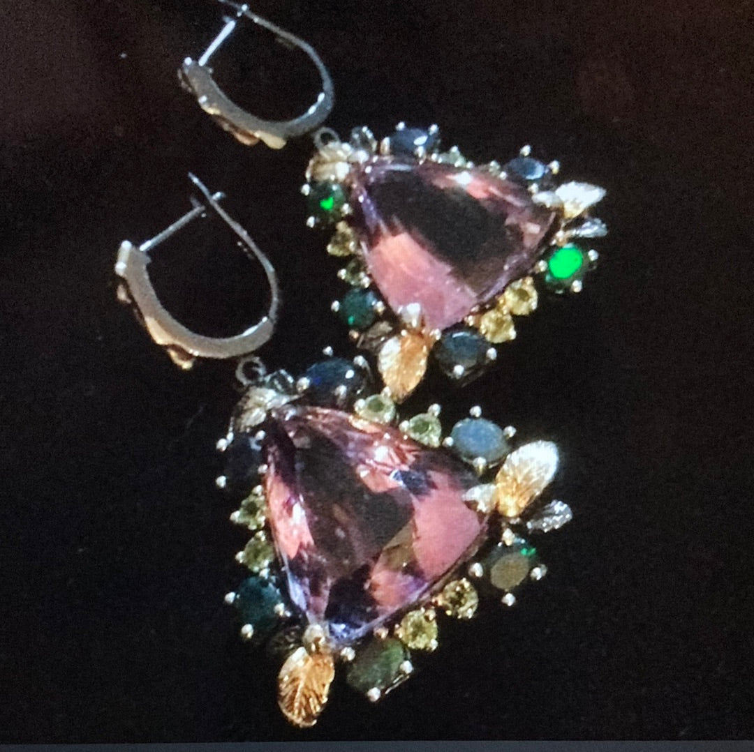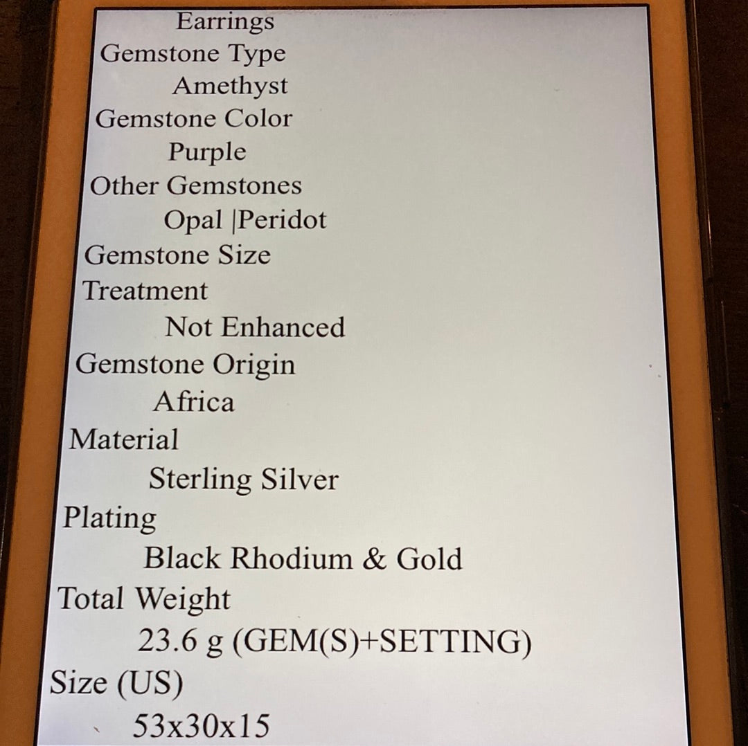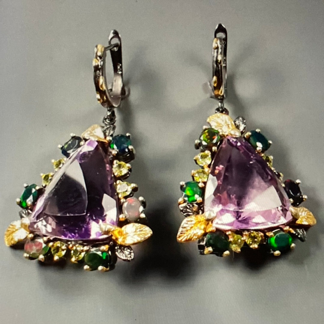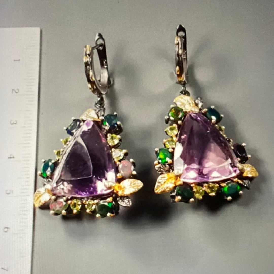 Super stunning and unique, genuine Amethysts combined 56 CTW, amazingly sizable genuine gemstones in that highly desirable trillion cut. These remarkable earrings are custom made, one of a kind and encrusted with genuine Black Opals and Peridot. A masterpiece that will become a future family heirloom. Set in .925 with a Rhodium finish for durability and beauty. Invest in genuine gemstones. Approximately 2” long.
