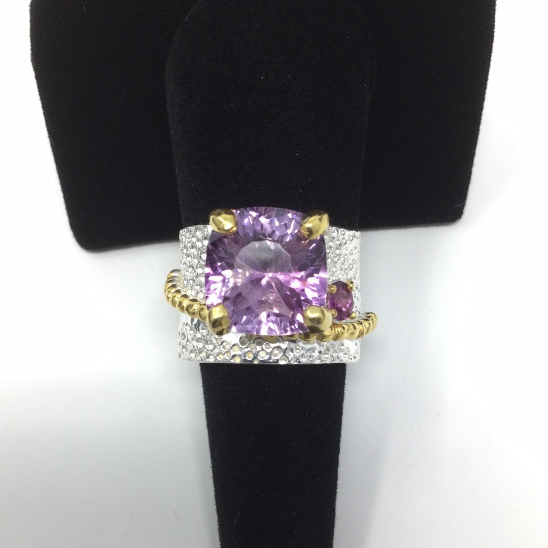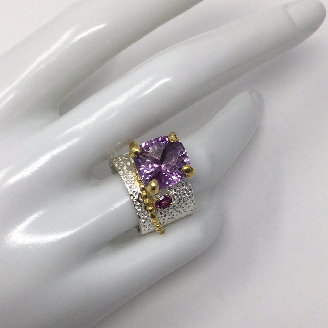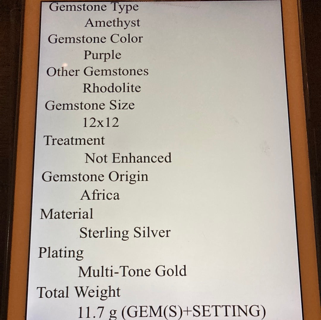 A ring that brings edge in contemporary design, featuring a magnificent 12mm by 12mm genuine Amethyst. This high quality gem sits in this custom made, one of a kind .925 sterling silver setting with 14K gold accents. This ring has an impactful yet very classy presence, accented with genuine Rhodolite Garnets. Invest in genuine gemstones that are everlasting treasures. Size 8, Resize at your jeweler.