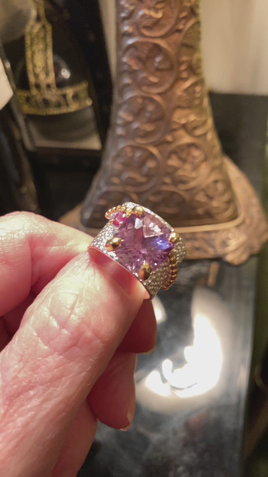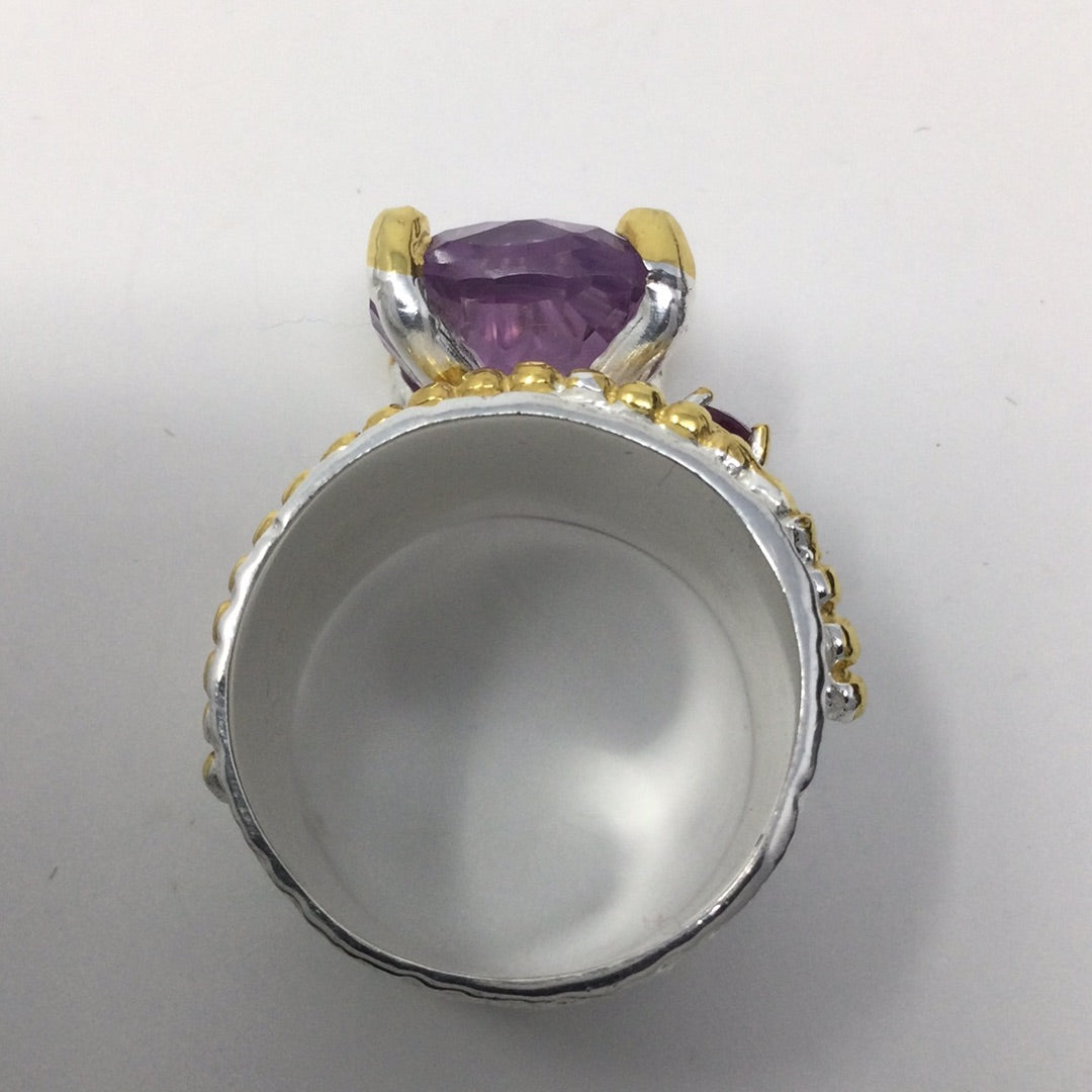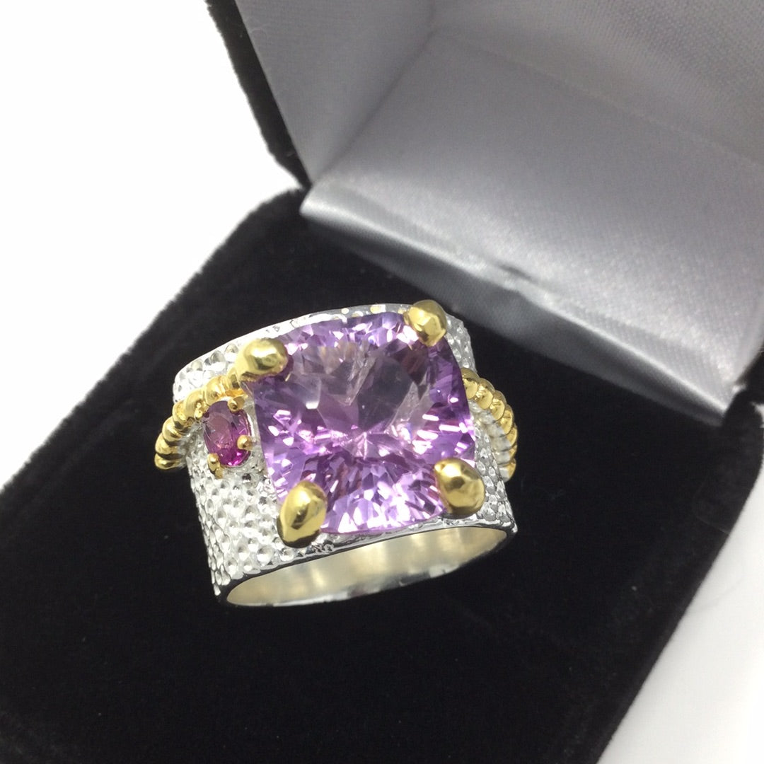 A ring that brings edge in contemporary design, featuring a magnificent 12mm by 12mm genuine Amethyst. This high quality gem sits in this custom made, one of a kind .925 sterling silver setting with 14K gold accents. This ring has an impactful yet very classy presence, accented with genuine Rhodolite Garnets. Invest in genuine gemstones that are everlasting treasures. Size 8, Resize at your jeweler.