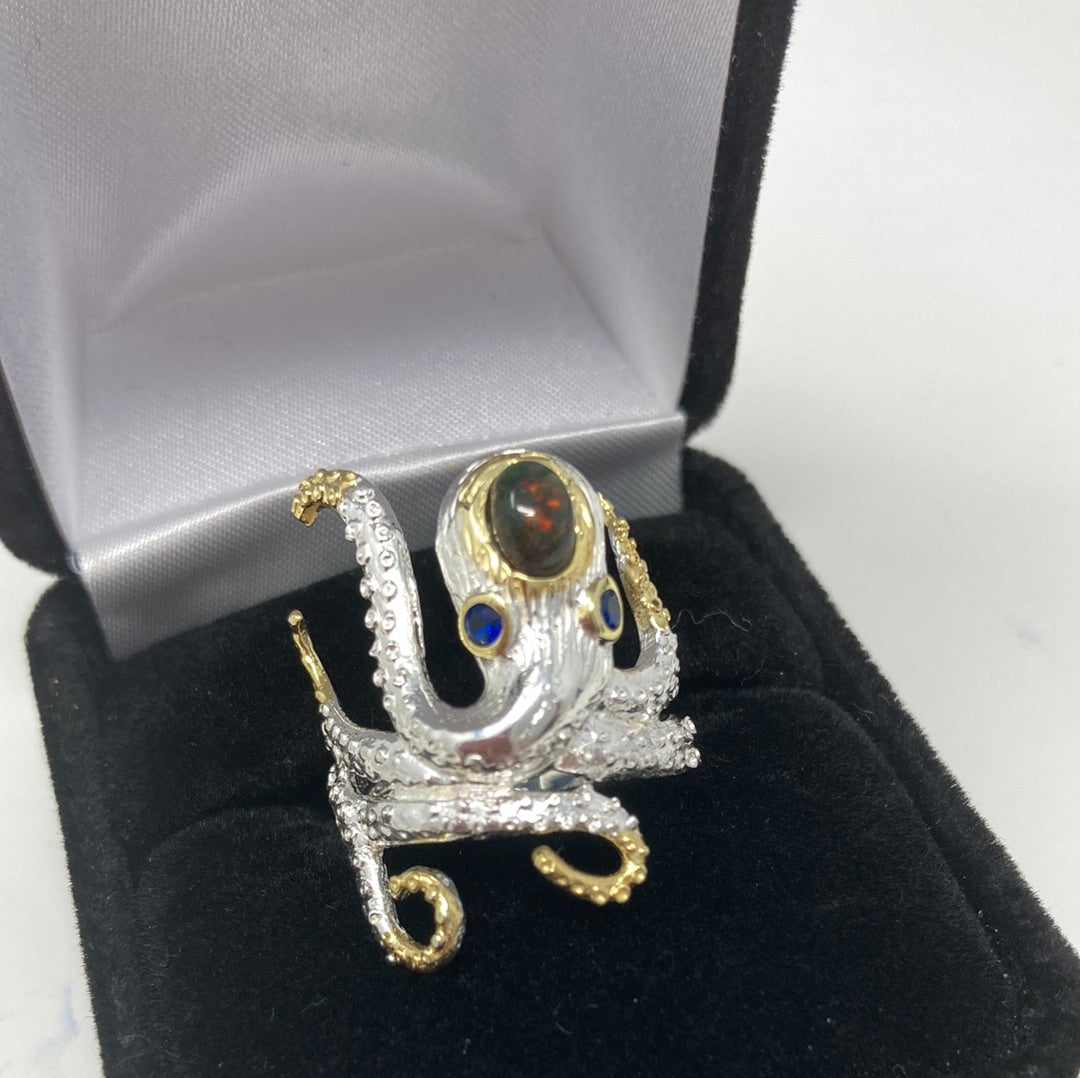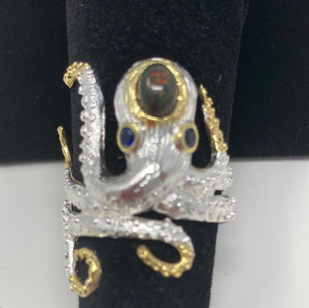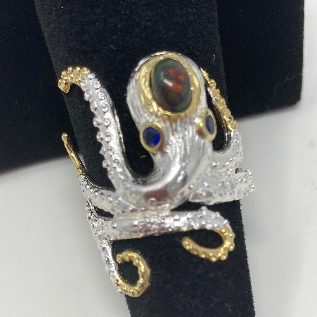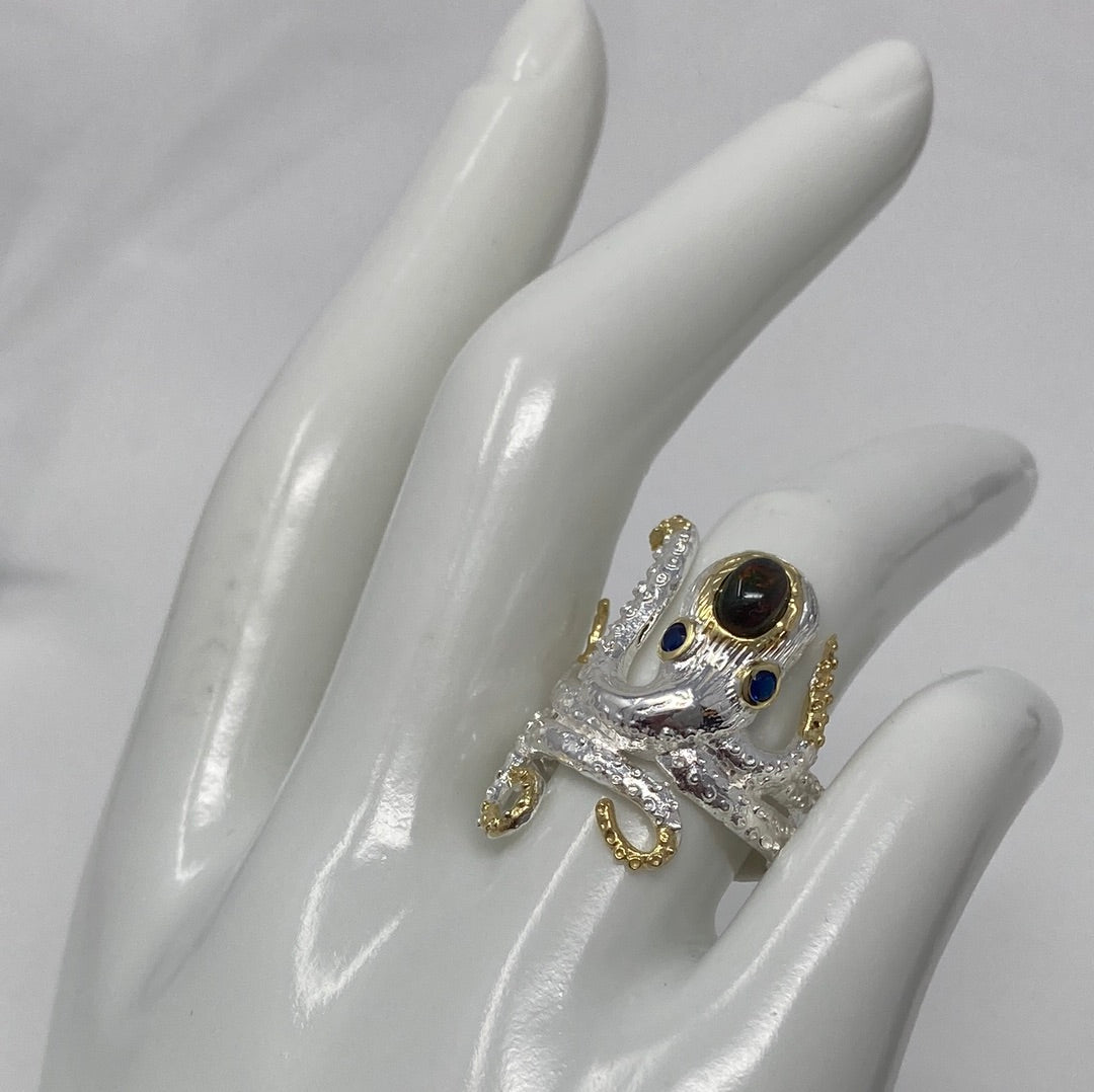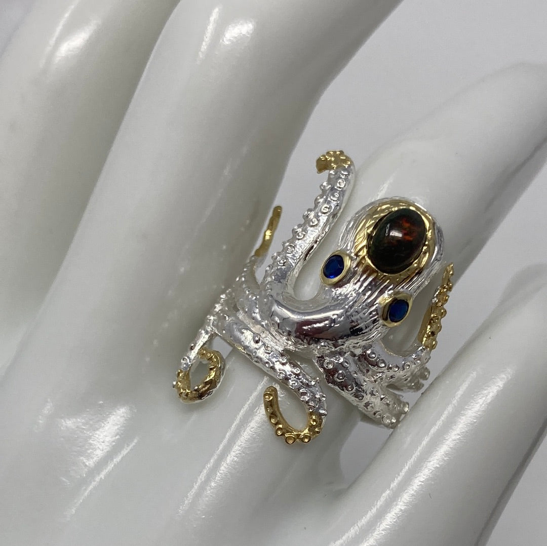Super unusual and very artfully crafted in this special lovable octopus ring. The genuine, high quality Black Opal measures 6mm by 4mm and hand crafted in .925 sterling silver with a white and yellow gold overlay for durability and beauty. Notice the detailed workmanship even in his little suction cup tentacles. I just love ‘em. Size7