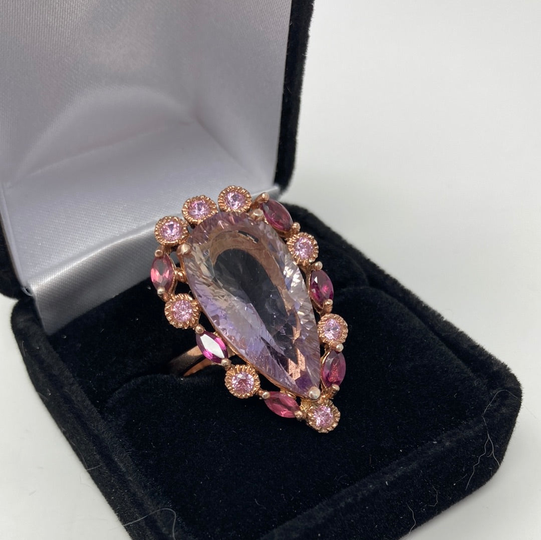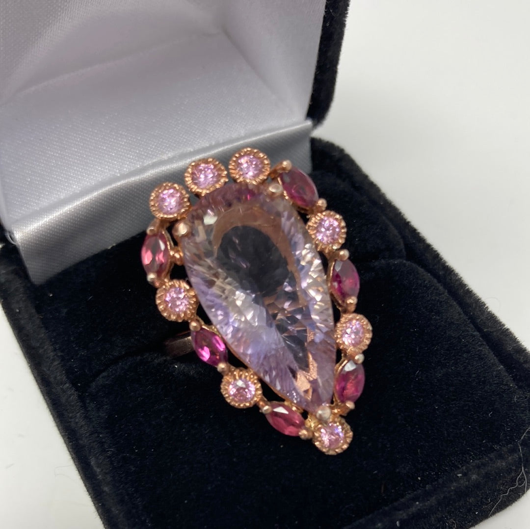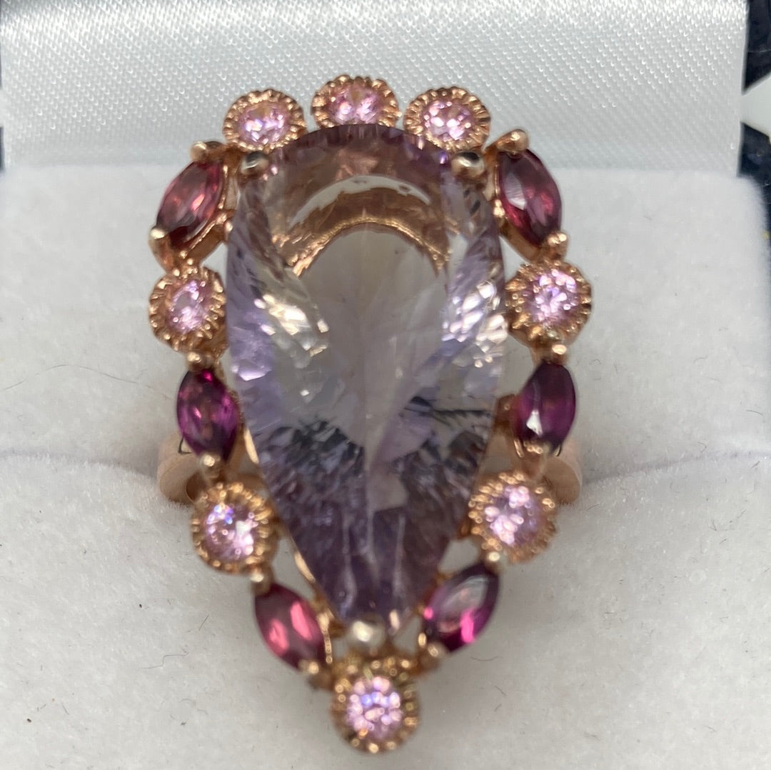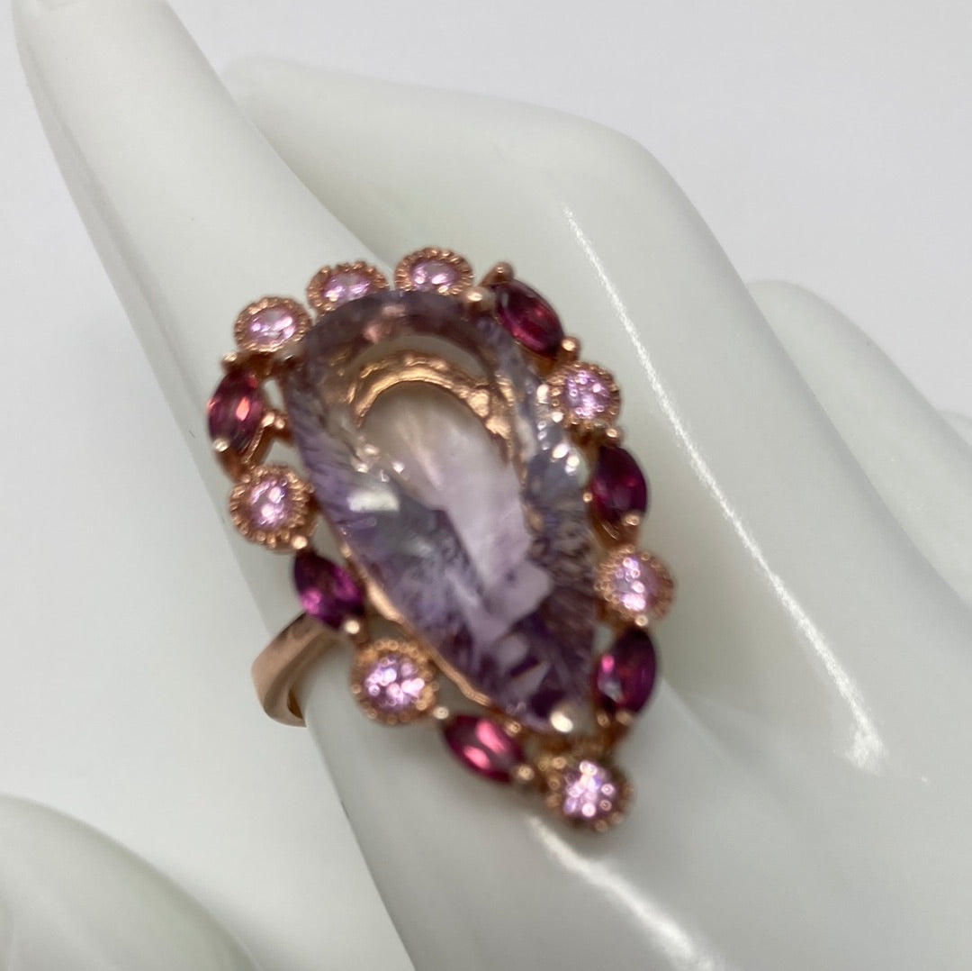 The soft hues of this gemstone is a wonderland of of sighs. The marriage of Amethyst and Citrine is a beautiful, treasured unique gemstone. This gorgeous genuine Ametrine was hand selected for excellence, this has it all, cut, color and clarity. This stone is that perfect pear shaped cut, accented with genuine Rhodolite Garnets too. All set in .925 sterling silver with a Rose Gold overlay. Size 8 1/2, Resize at your jeweler or use a ring guard.