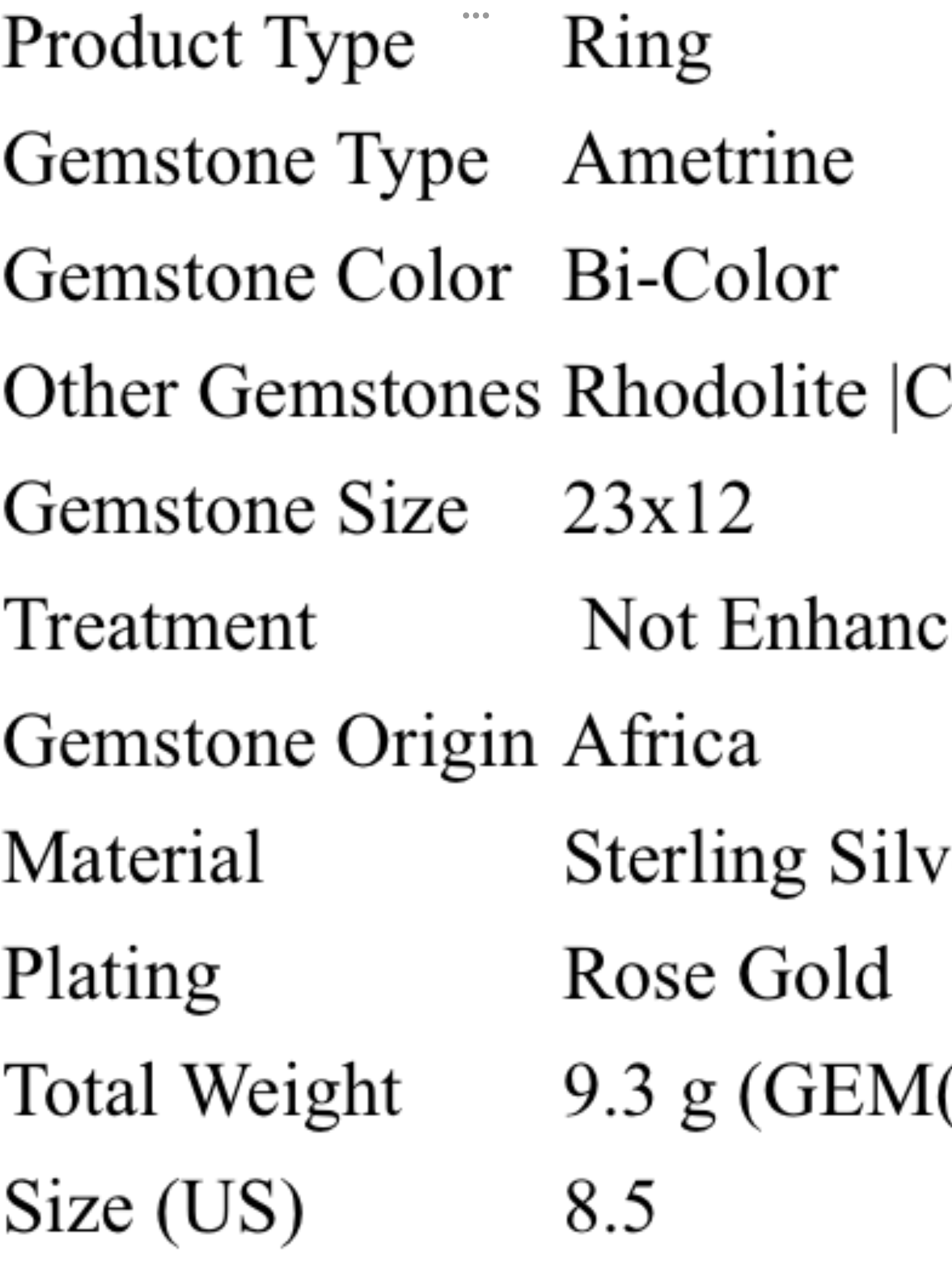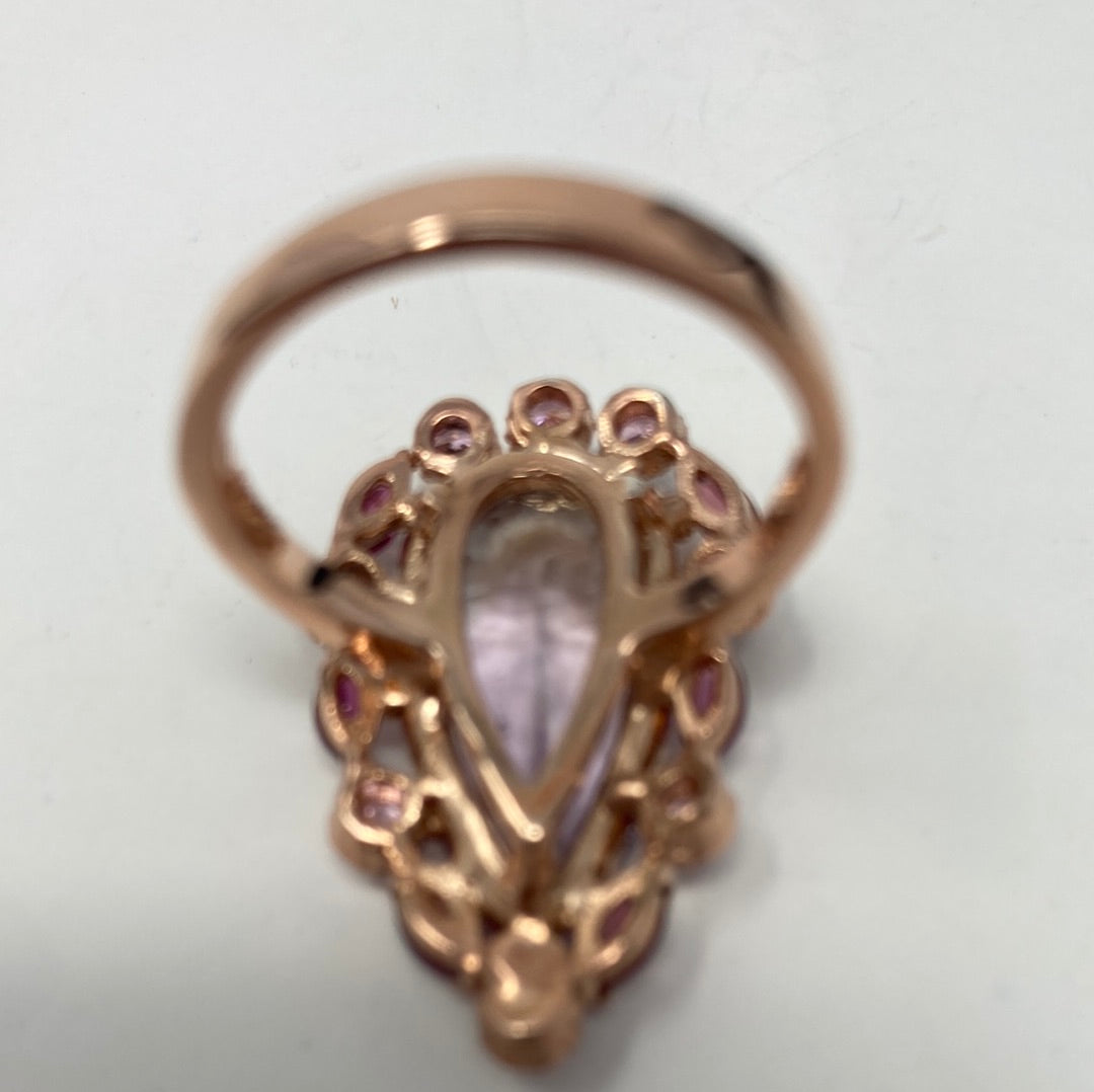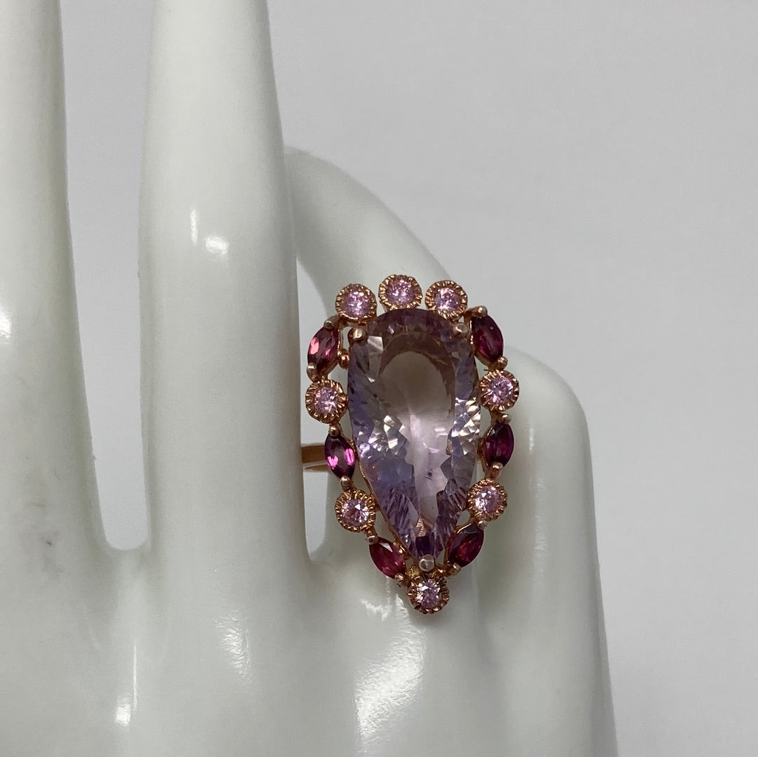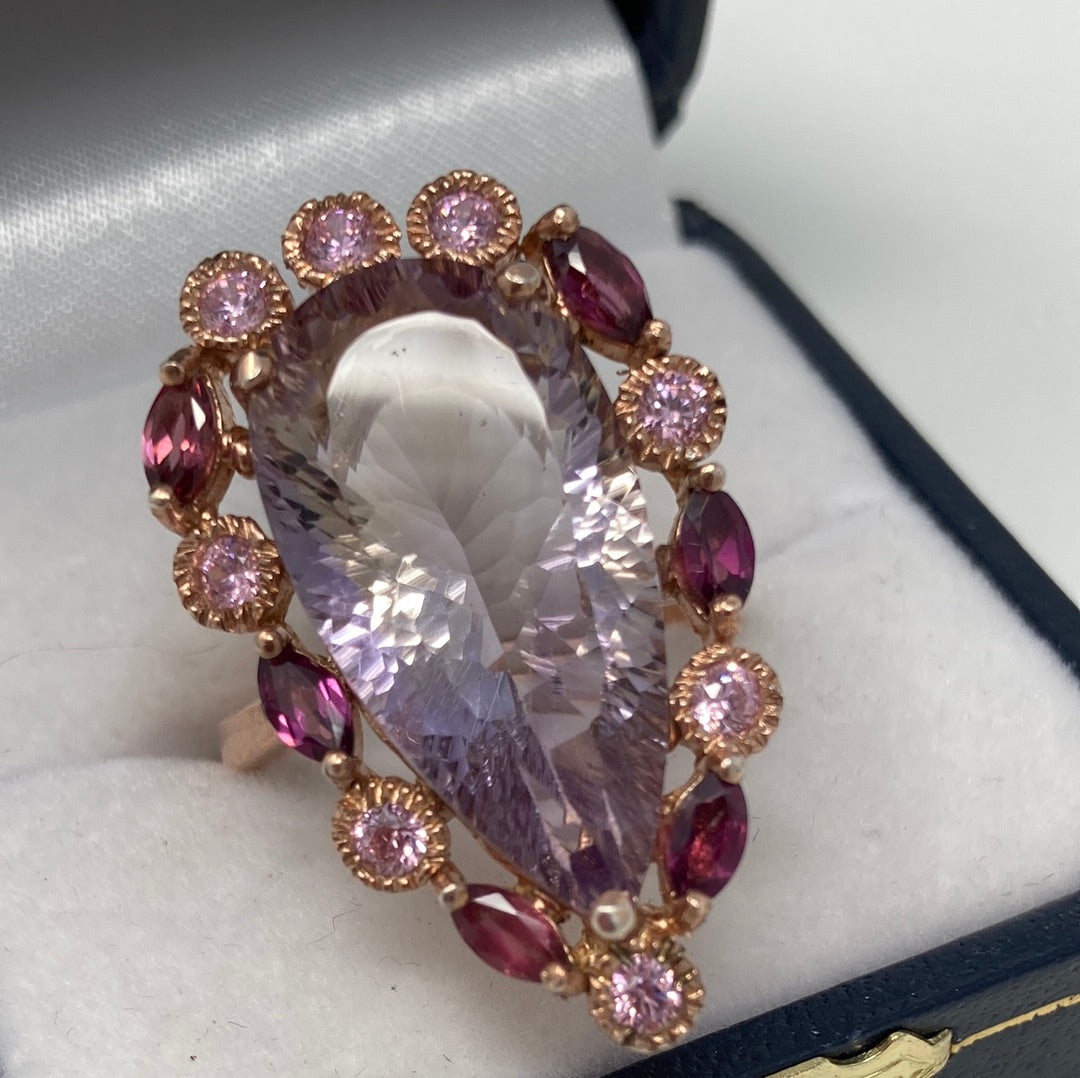 The soft hues of this gemstone is a wonderland of of sighs. The marriage of Amethyst and Citrine is a beautiful, treasured unique gemstone. This gorgeous genuine Ametrine was hand selected for excellence, this has it all, cut, color and clarity. This stone is that perfect pear shaped cut, accented with genuine Rhodolite Garnets too. All set in .925 sterling silver with a Rose Gold overlay. Size 8 1/2, Resize at your jeweler or use a ring guard.