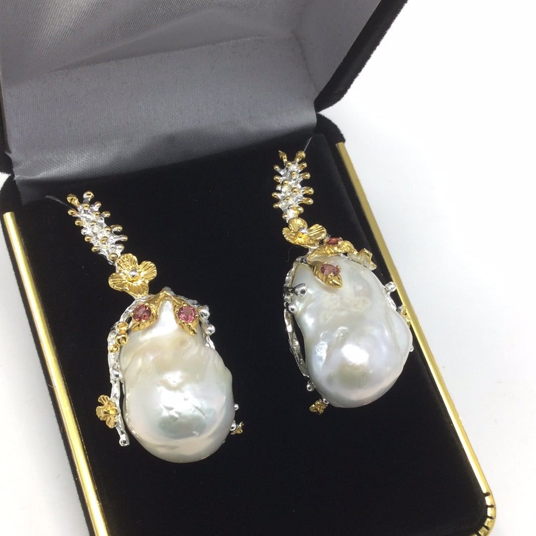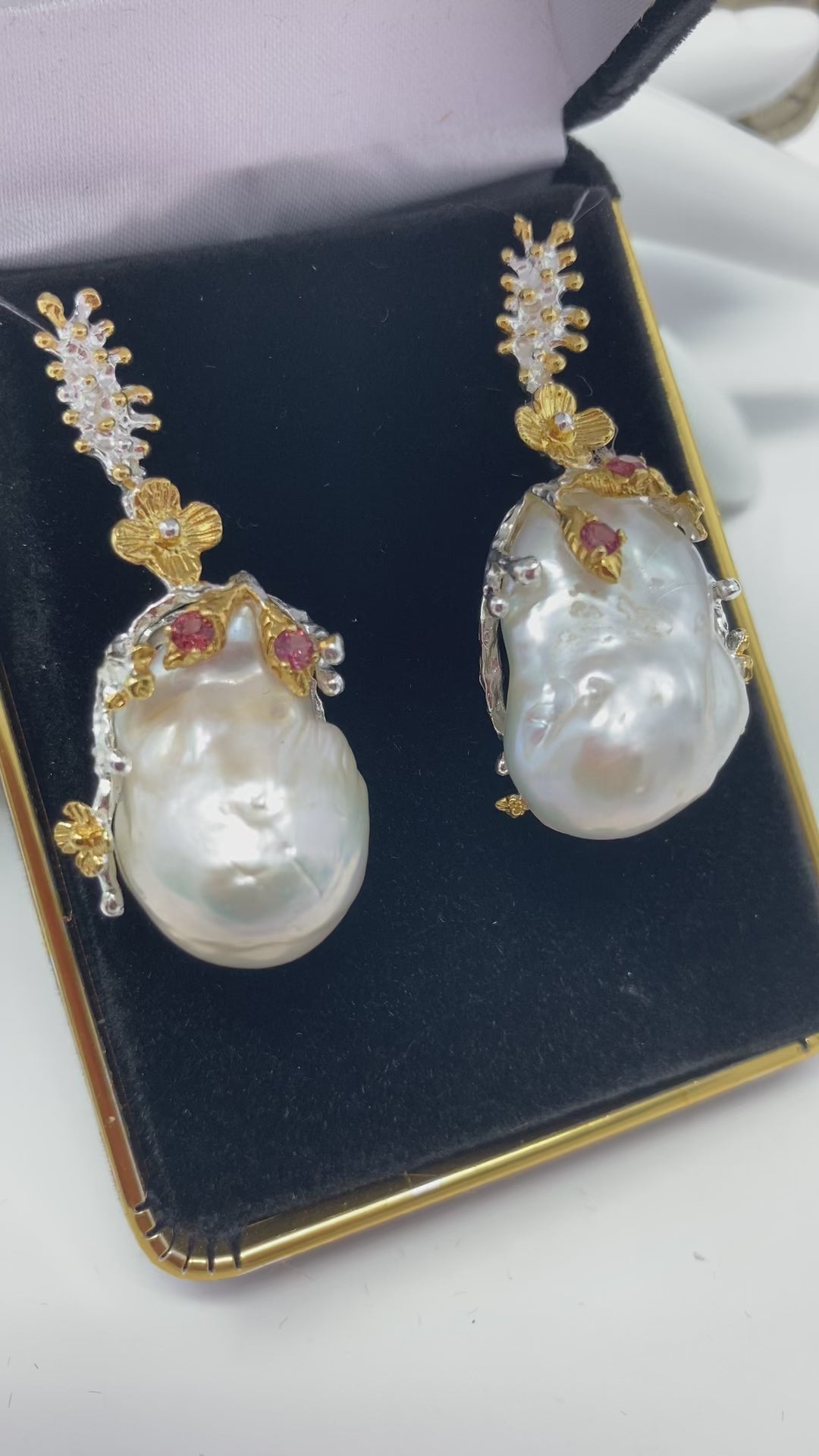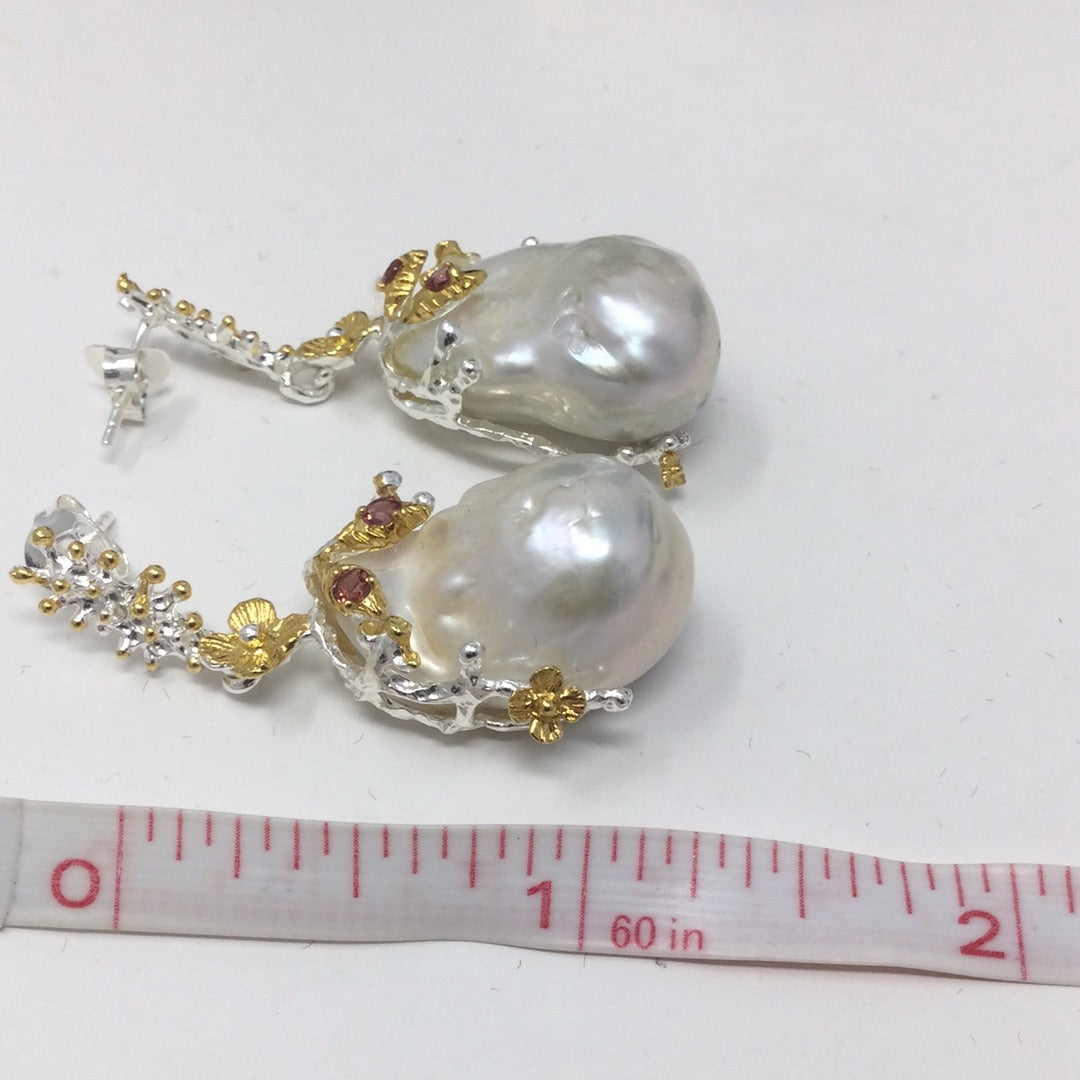 Exceptional genuine Baroque Pearl earrings, amazing specimens. Baroque pearls have been highly prized throughout history for their beauty and have adorned many royal crowns. These particular pearls are accented with twinkling genuine Garnets, set in .925 sterling silver with a 14K white and yellow gold overlay. A beautiful way to frame your face in a luxurious luminescence. A custom made set, all hand selected for natural luster and shape. The epitome of elegance. Approximately 1” long.