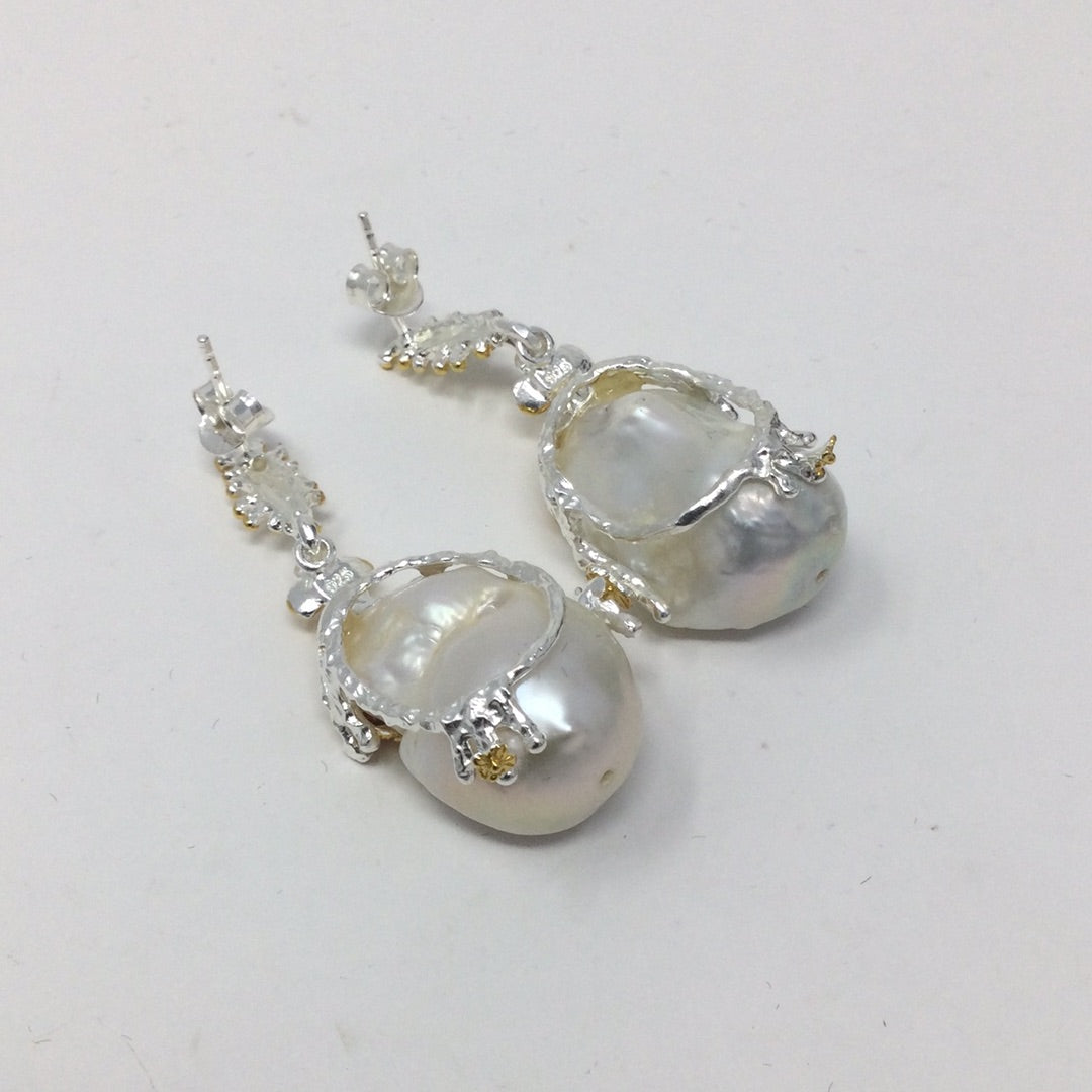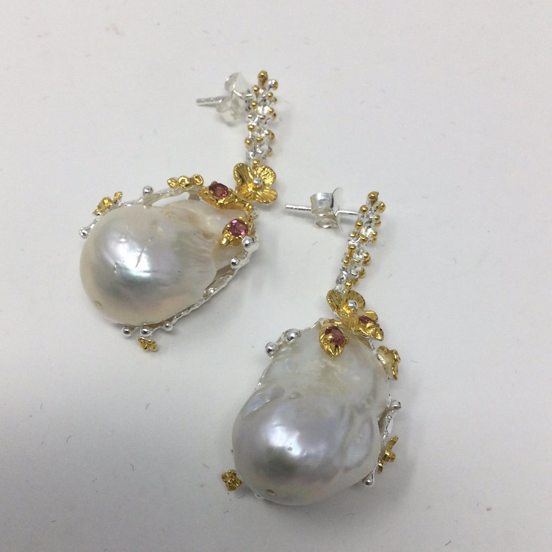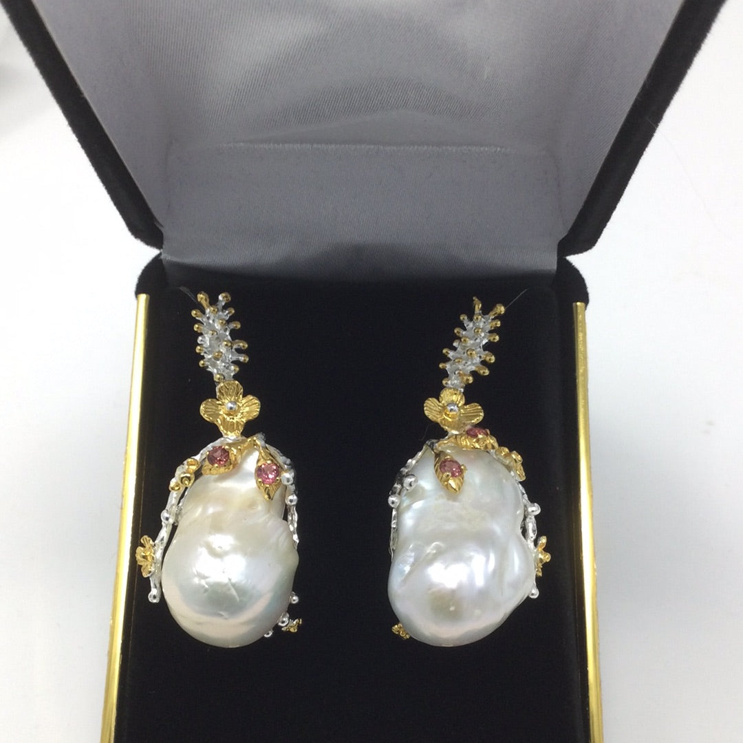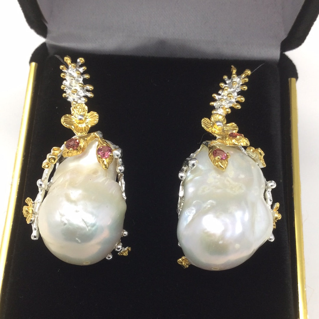 Exceptional genuine Baroque Pearl earrings, amazing specimens. Baroque pearls have been highly prized throughout history for their beauty and have adorned many royal crowns. These particular pearls are accented with twinkling genuine Garnets, set in .925 sterling silver with a 14K white and yellow gold overlay. A beautiful way to frame your face in a luxurious luminescence. A custom made set, all hand selected for natural luster and shape. The epitome of elegance. Approximately 1” long.
