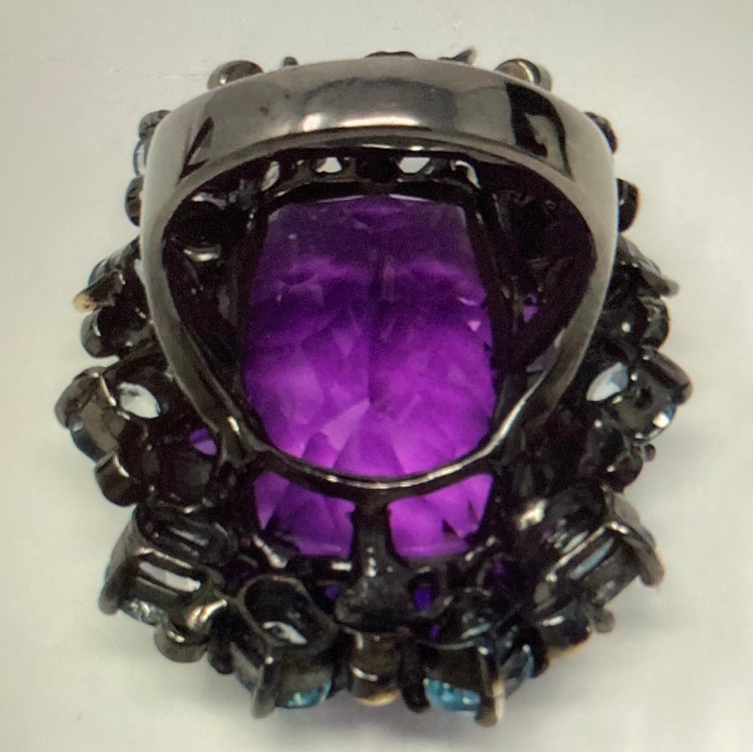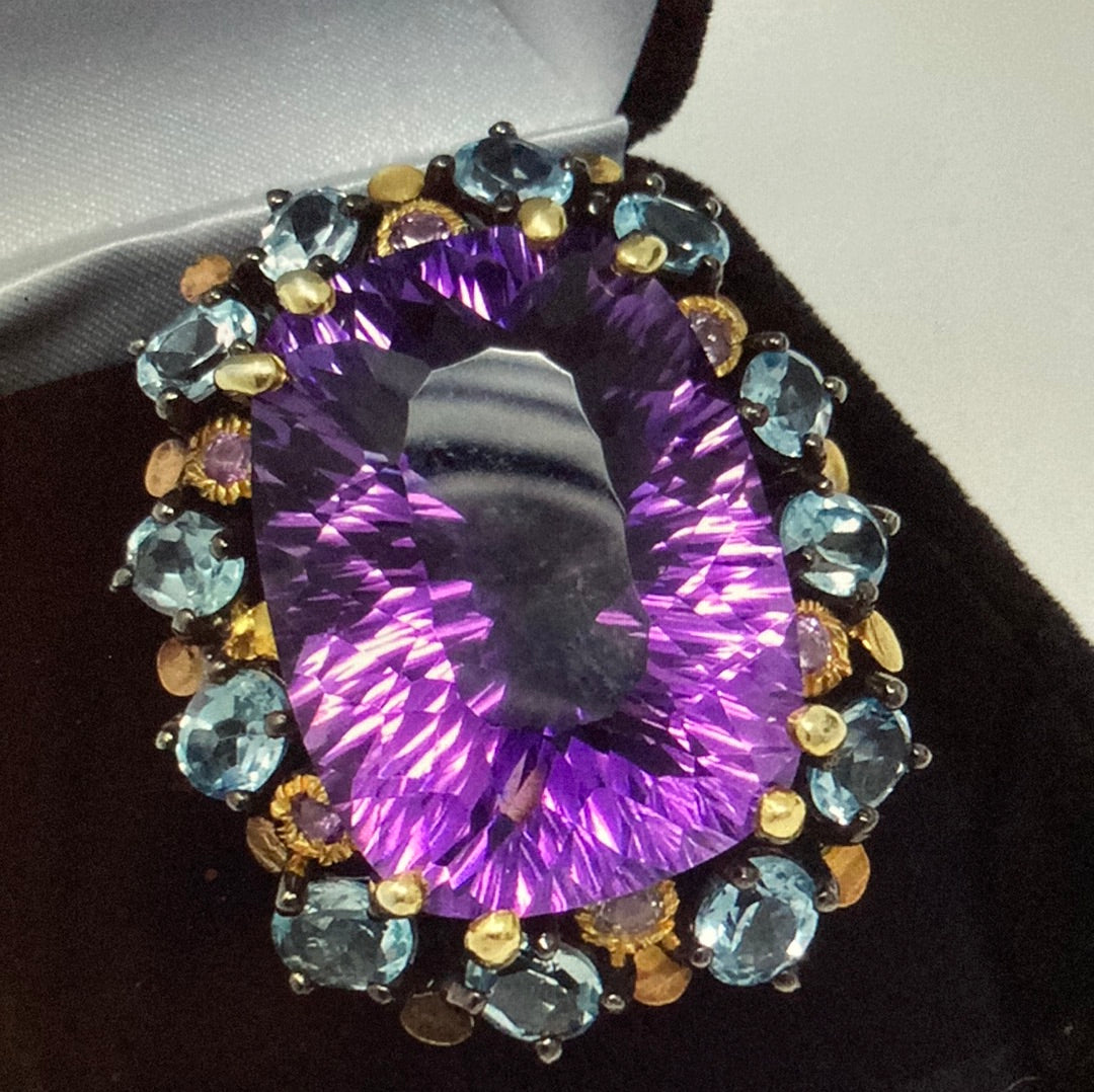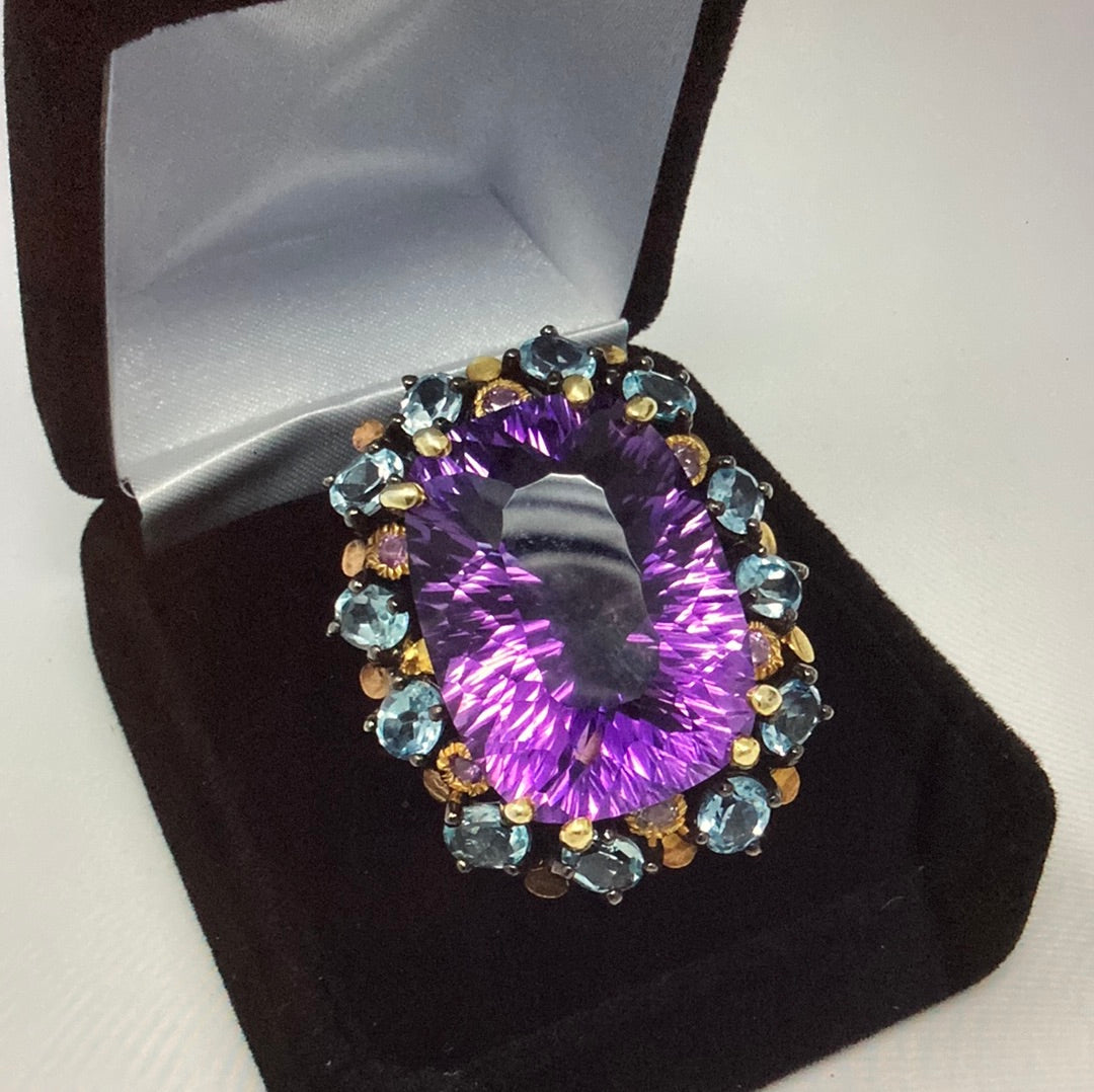 One in a lifetime mega AAA+ Genuine Amethyst p, look at the faceting on this bad boy ! Surrounded by genuine Topaz, this custom made one of a kind museum quality gemstone ring. It simply takes your breath awa with its powerful, majestic presence. Set in a solid .925 setting with Rhodium overlay. Invest in the best ! Size 7