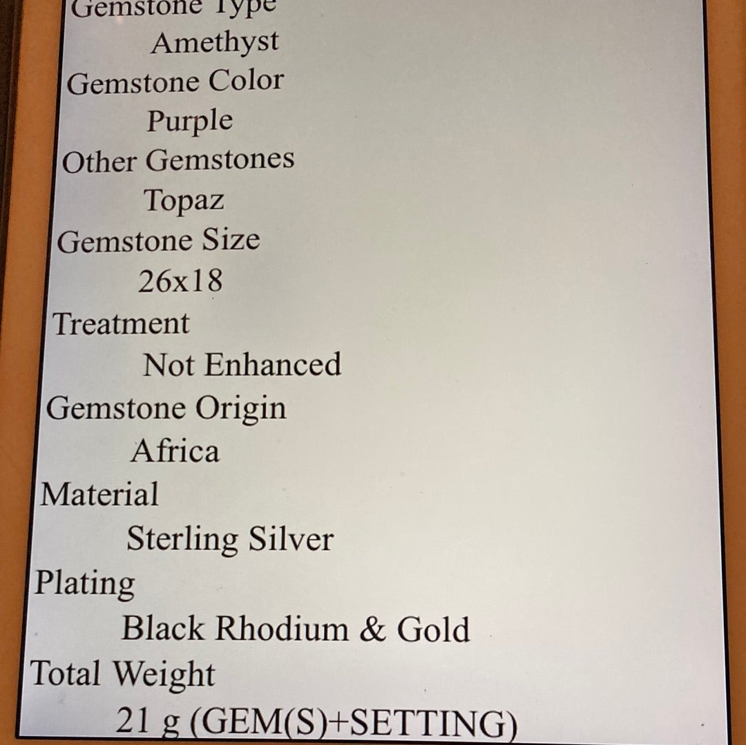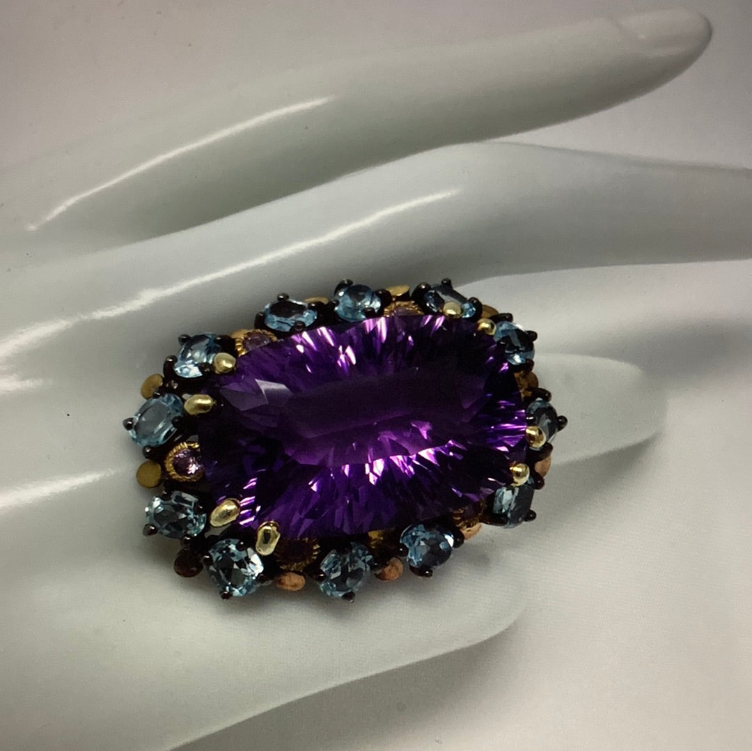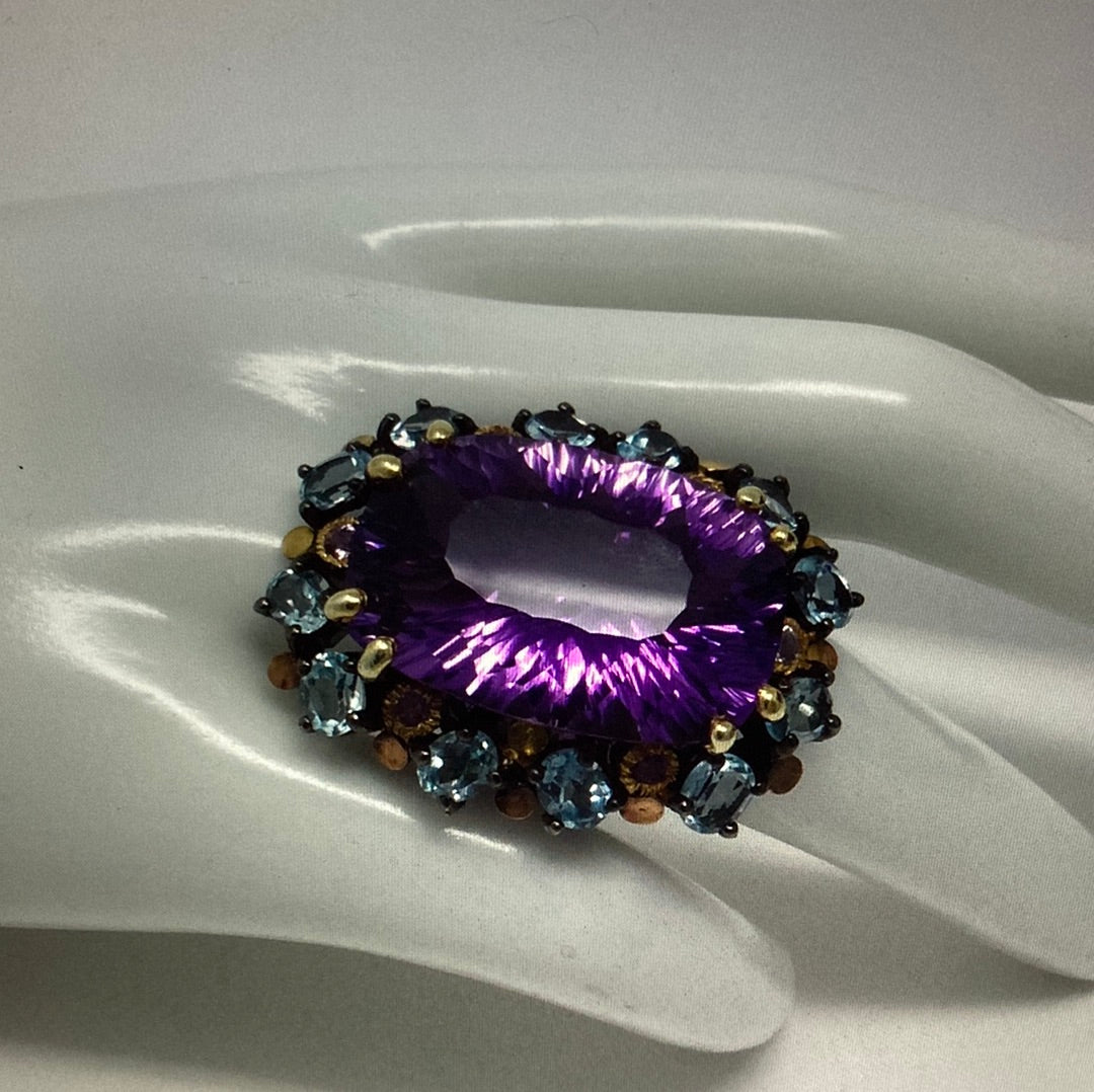 One in a lifetime mega AAA+ Genuine Amethyst p, look at the faceting on this bad boy ! Surrounded by genuine Topaz, this custom made one of a kind museum quality gemstone ring. It simply takes your breath awa with its powerful, majestic presence. Set in a solid .925 setting with Rhodium overlay. Invest in the best ! Size 7