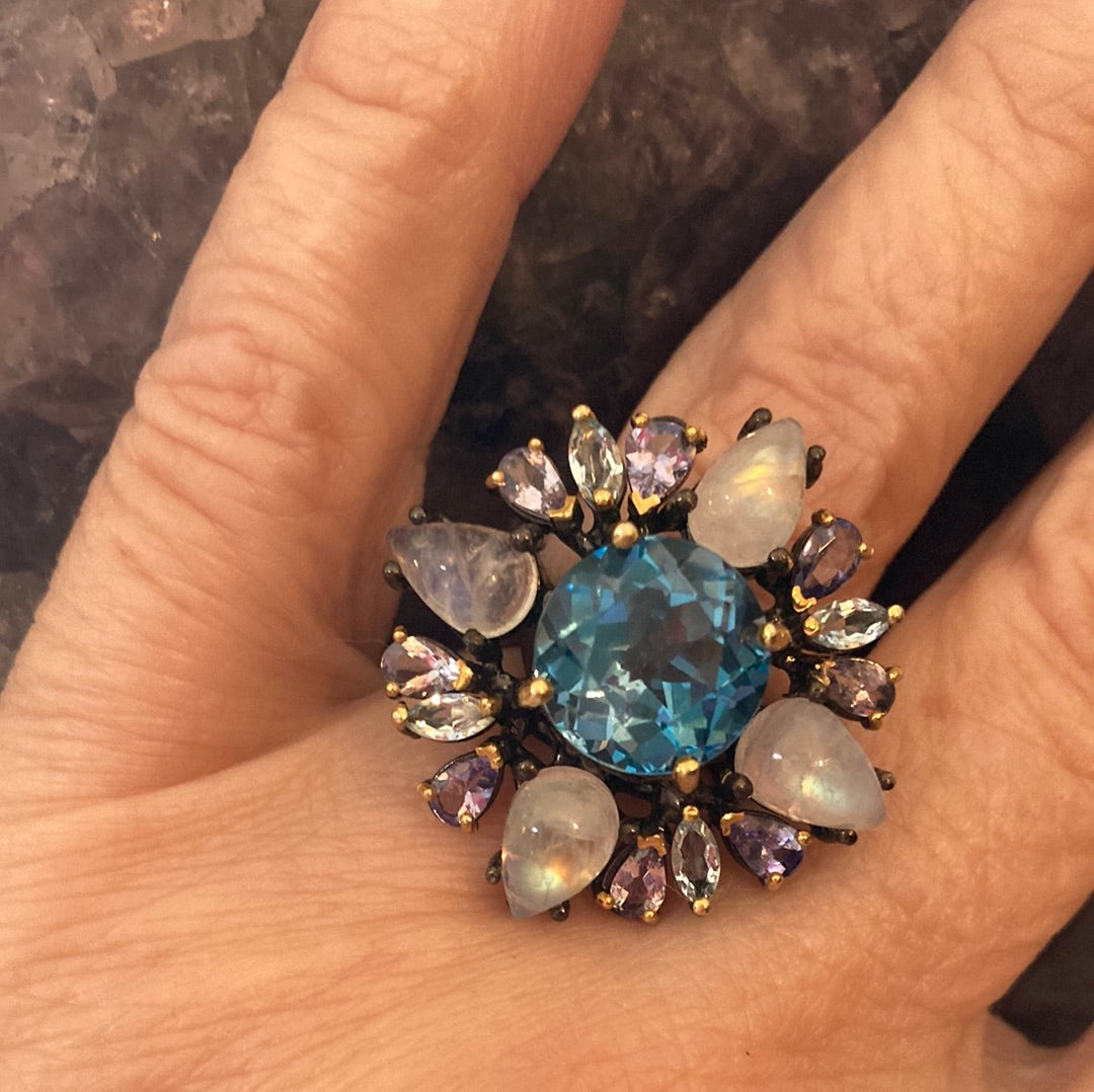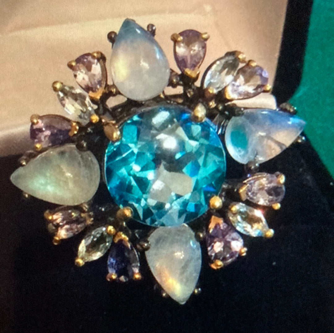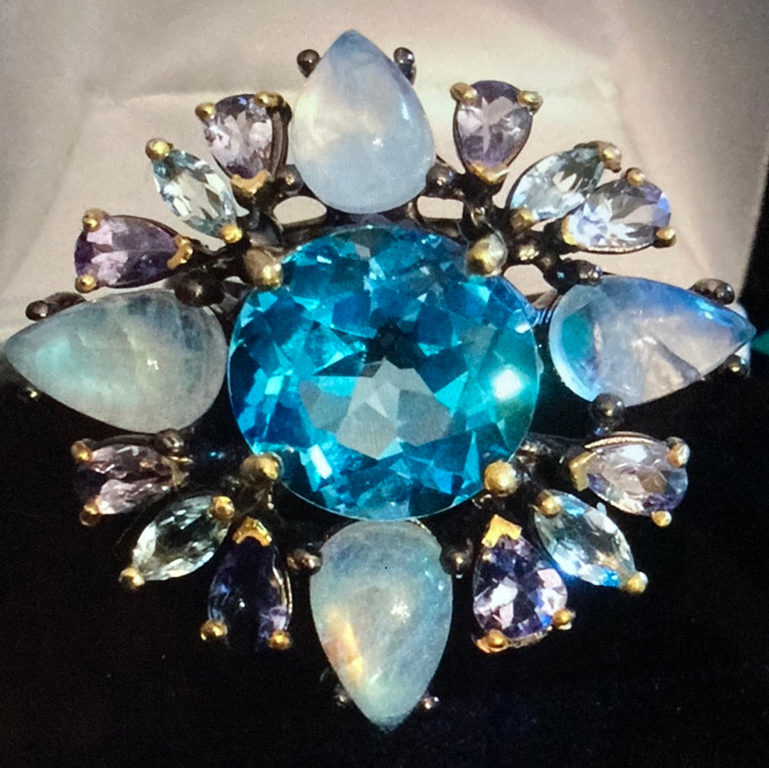 How do you describe perfection, evening Caribbean sky with opalescence of the moon. This ring is that work of art created in genuine gemstones. Featuring a 10+ CTW Genuine Blue Topaz with a symphony of natural iridescent Blue Moonstones that glow. A one of a kind. Accented with genuine Tanzanite and Aquamarines to complete the masterpiece. Set in .925 sterling silver with a Rhodium overlay for durability and beauty. Size 8, resize at your jeweler.