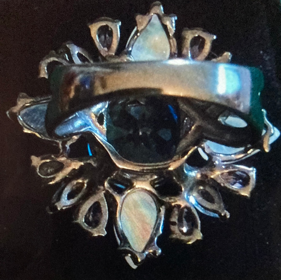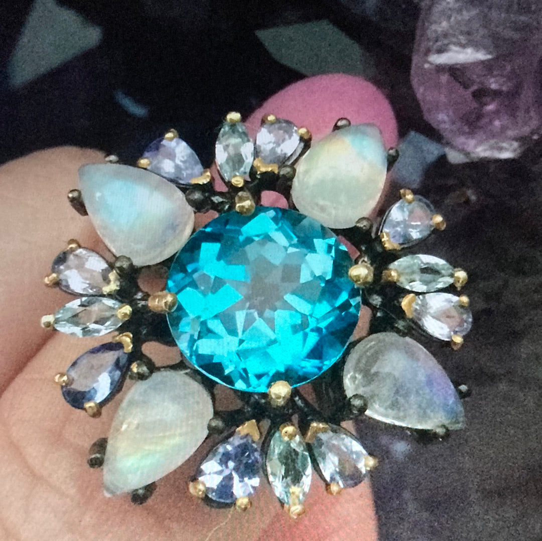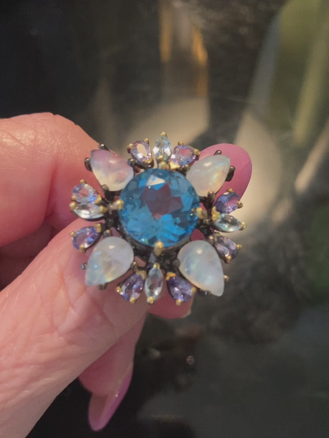 How do you describe perfection, evening Caribbean sky with opalescence of the moon. This ring is that work of art created in genuine gemstones. Featuring a 10+ CTW Genuine Blue Topaz with a symphony of natural iridescent Blue Moonstones that glow. A one of a kind. Accented with genuine Tanzanite and Aquamarines to complete the masterpiece. Set in .925 sterling silver with a Rhodium overlay for durability and beauty. Size 8, resize at your jeweler.