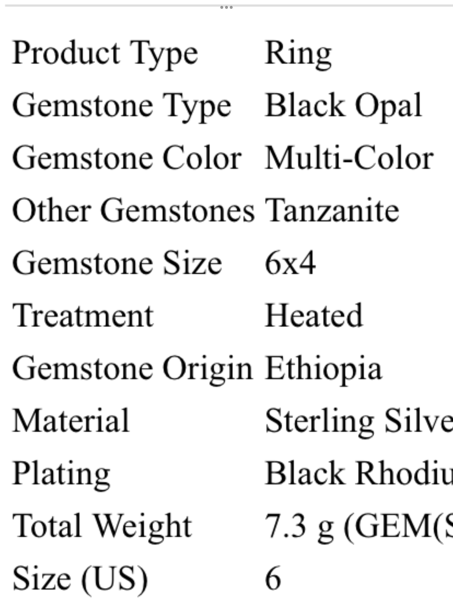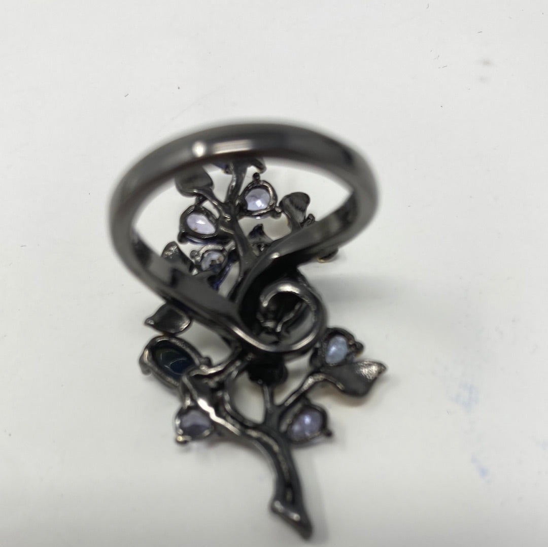 A vision of art to wear upon your finger, this unique, one of a kind ring. I choose only the best quality and affordability of lifetime gemstones for your future heirloom collection. Invest in genuine gemstones in these unique designs. This ring features 6mm by 4mm Black Opals interspersed with genuine pear shaped Tanzanite. Set in .925 sterling silver with a Rhodium overlay for durability and beauty. Artfully accented with yellow gold Size 6, Resize at your jeweler