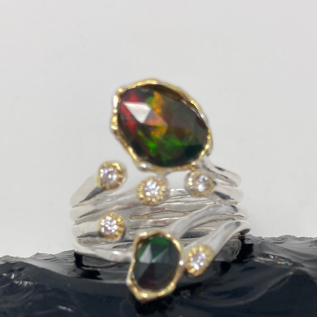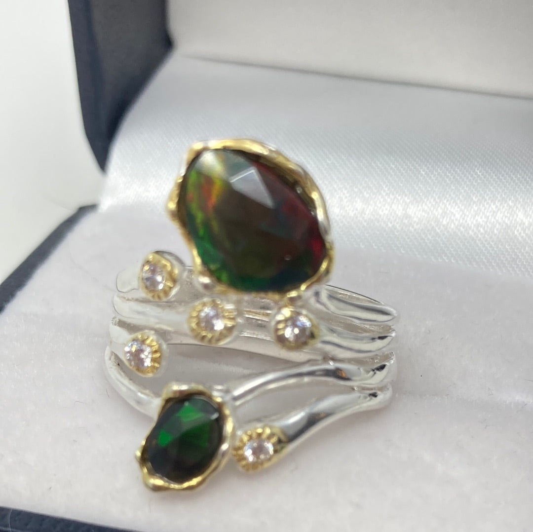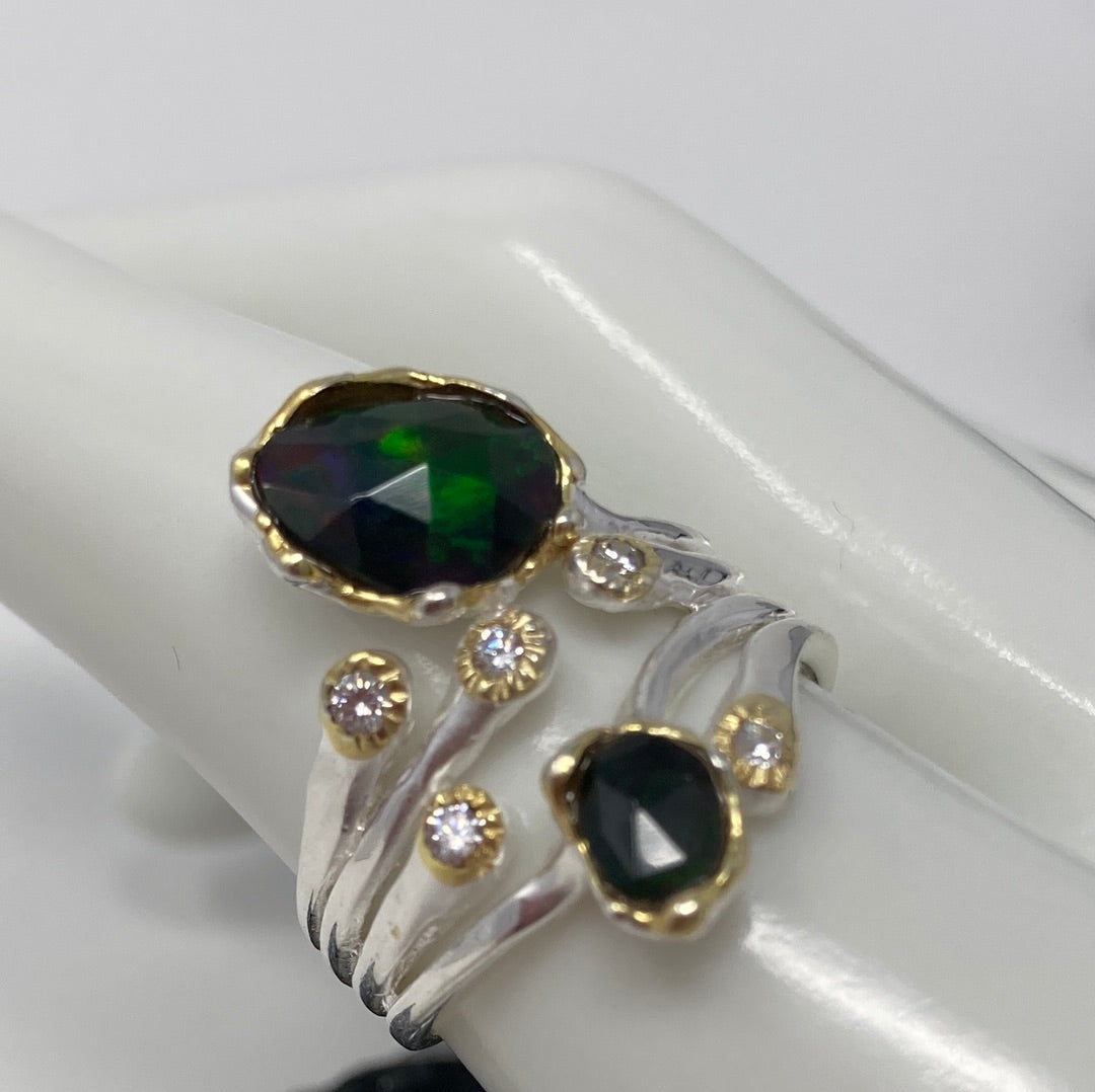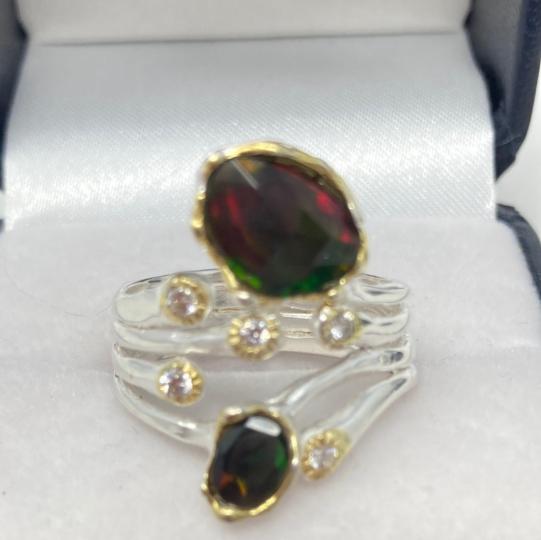 This custom made, one of a kind ring, features 10mm by 7mm genuine faceted Black Opals. The inner fire on these precious gemstones are very mysterious and enchanting. Very unique and difficult to find at retail jewelers because they can’t be mass produced for big profits. I offer unique genuine gemstones for your inner queen, you deserve a reward for your hard work and dedication. Faceted Opals are not easy to obtain. It’s time to commemorate yourself, crafted in .925 sterling silver with a gold overlay. Size 7 1/2, Resize at your jeweler or use a ring guard.