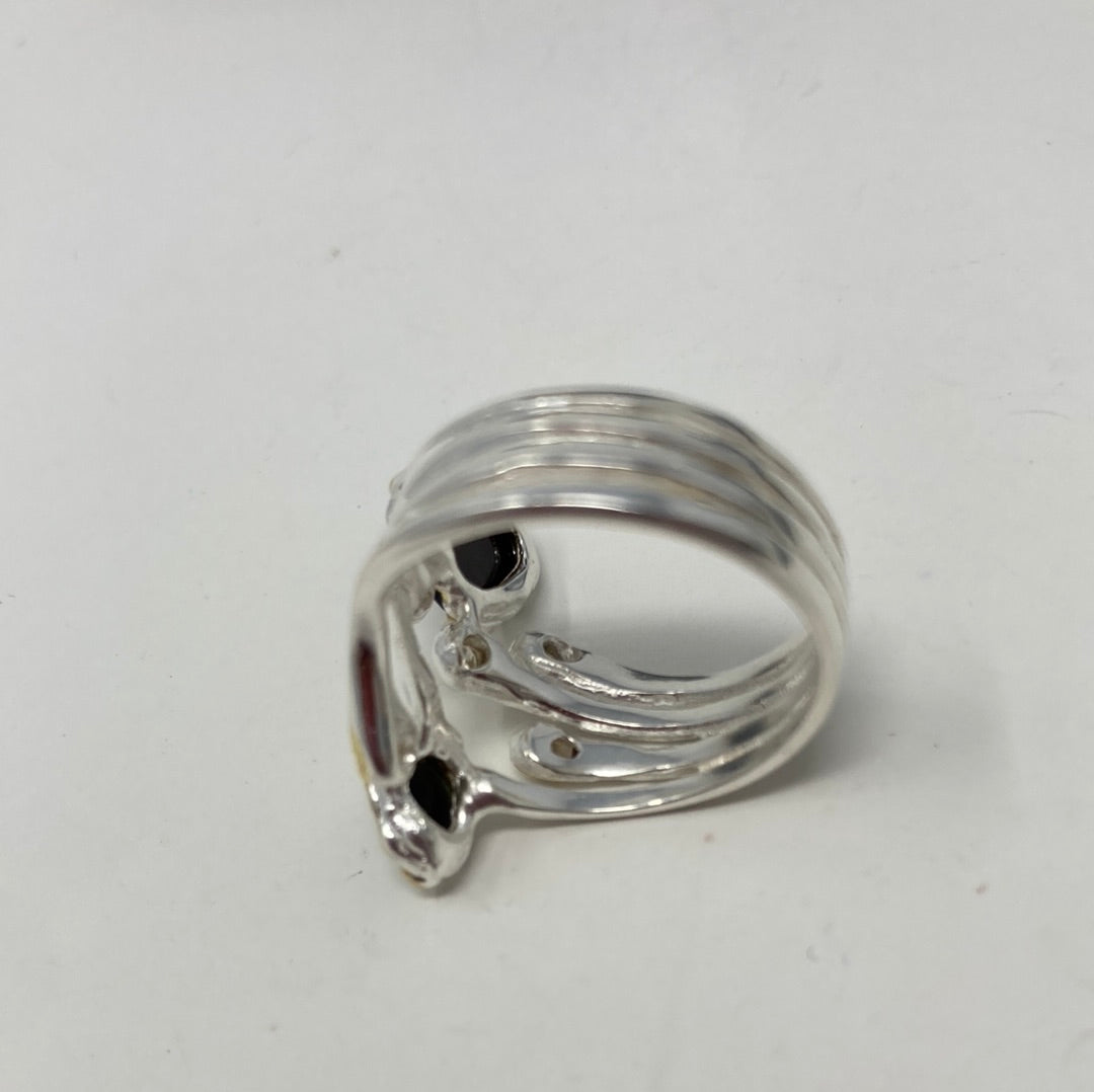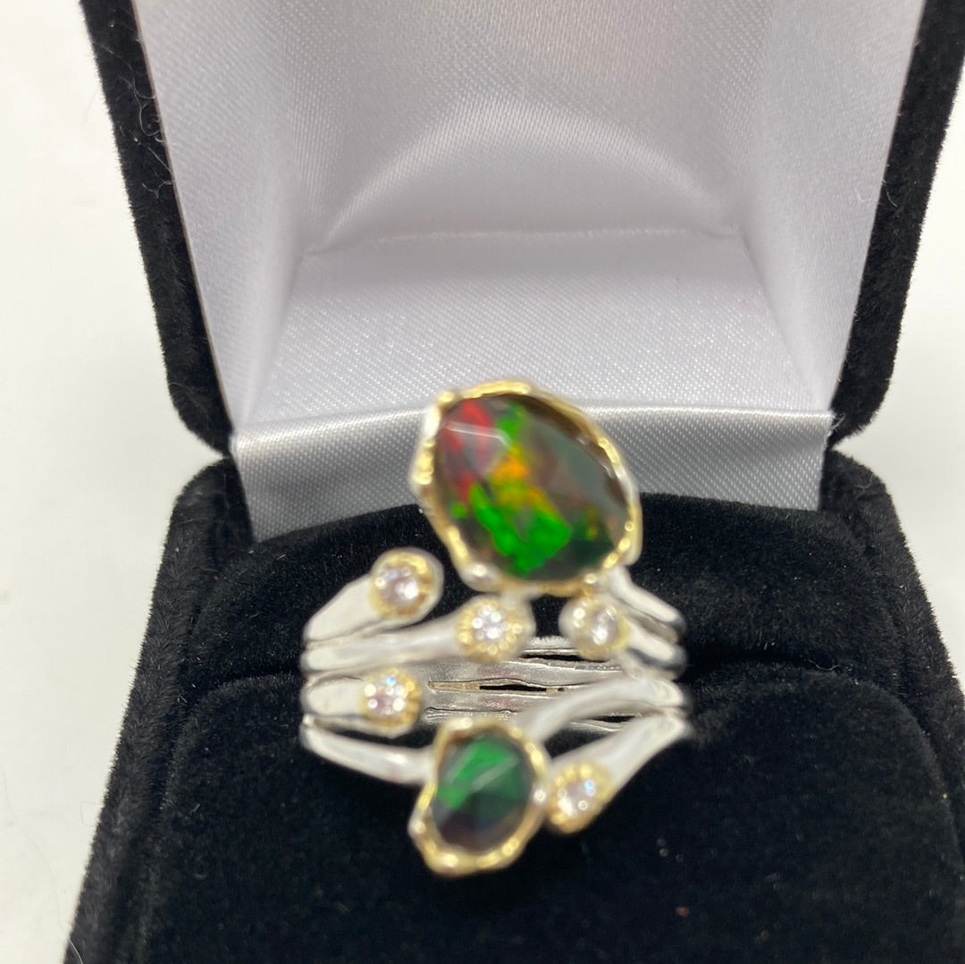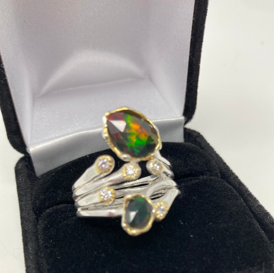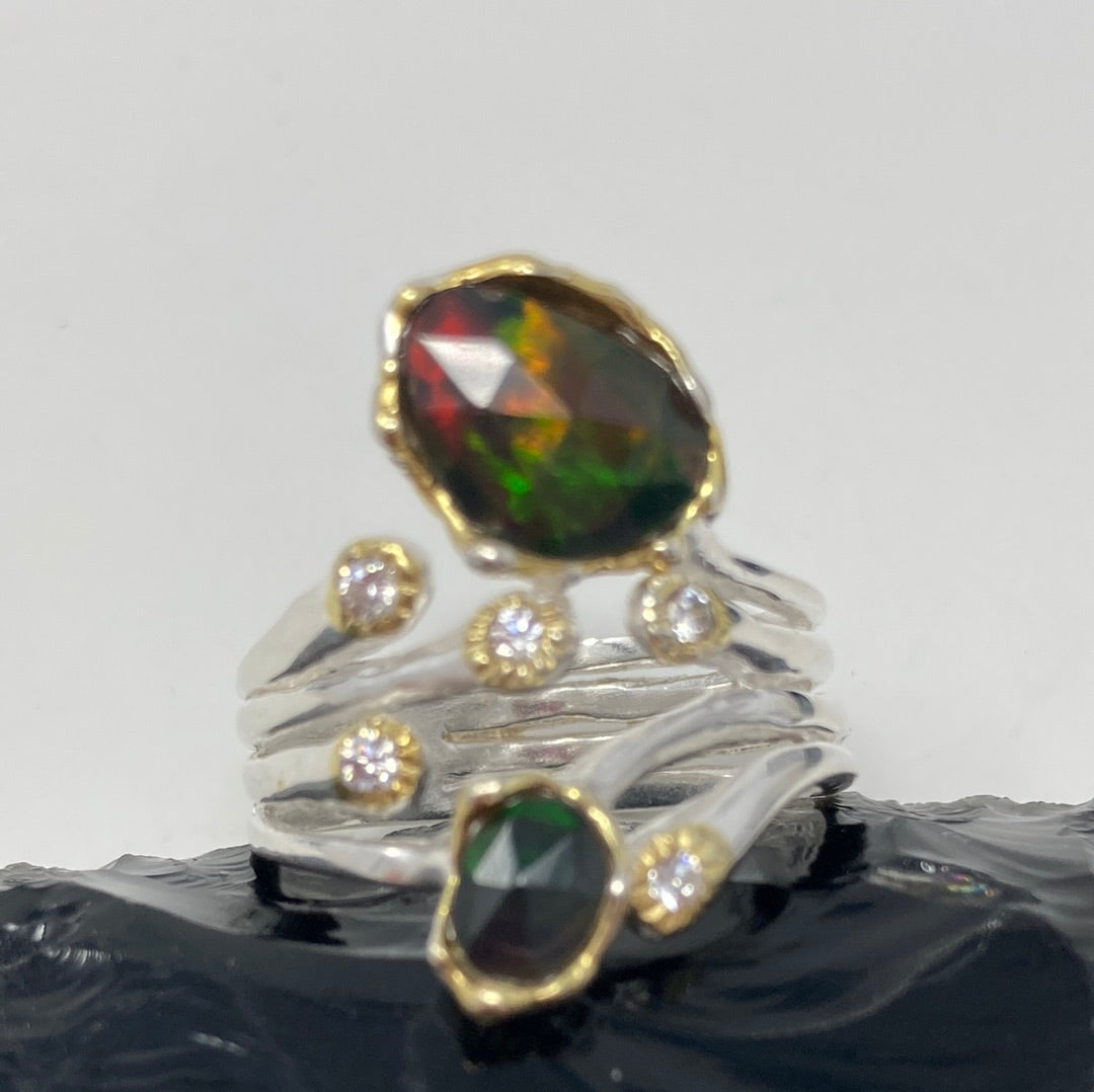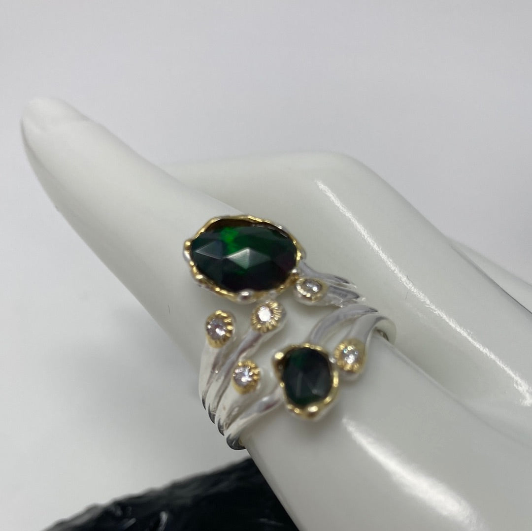 This custom made, one of a kind ring, features 10mm by 7mm genuine faceted Black Opals. The inner fire on these precious gemstones are very mysterious and enchanting. Very unique and difficult to find at retail jewelers because they can’t be mass produced for big profits. I offer unique genuine gemstones for your inner queen, you deserve a reward for your hard work and dedication. Faceted Opals are not easy to obtain. It’s time to commemorate yourself, crafted in .925 sterling silver with a gold overlay. Size 7 1/2, Resize at your jeweler or use a ring guard.