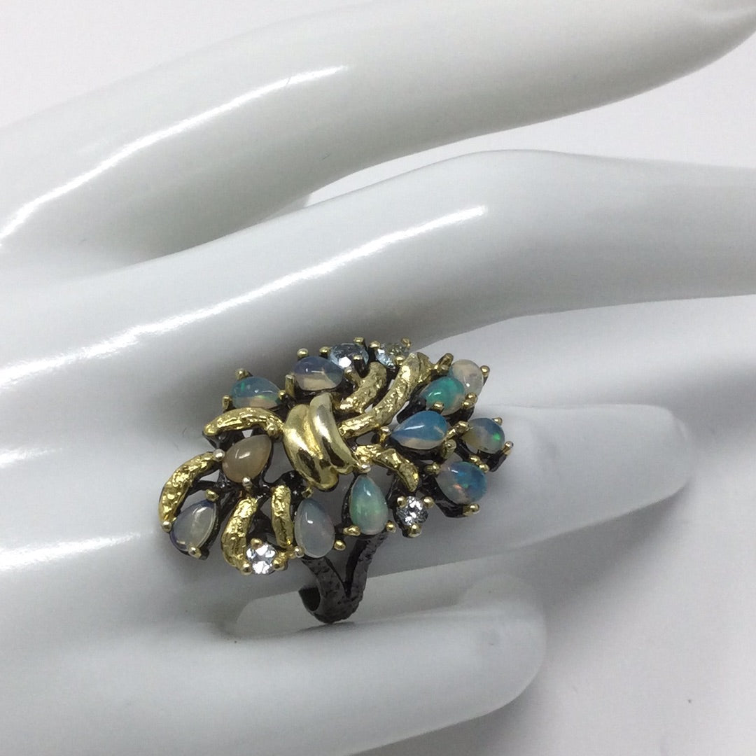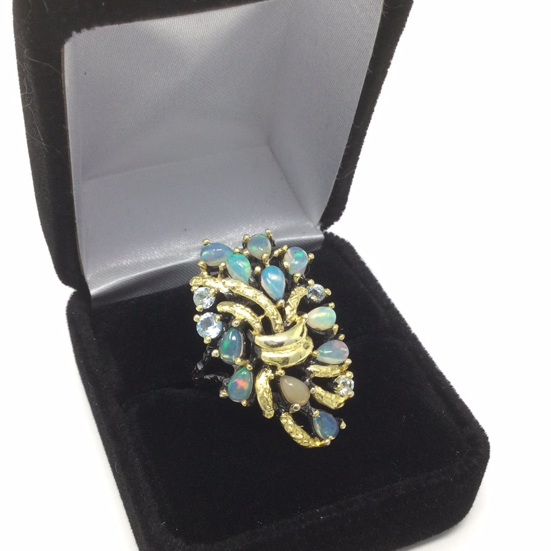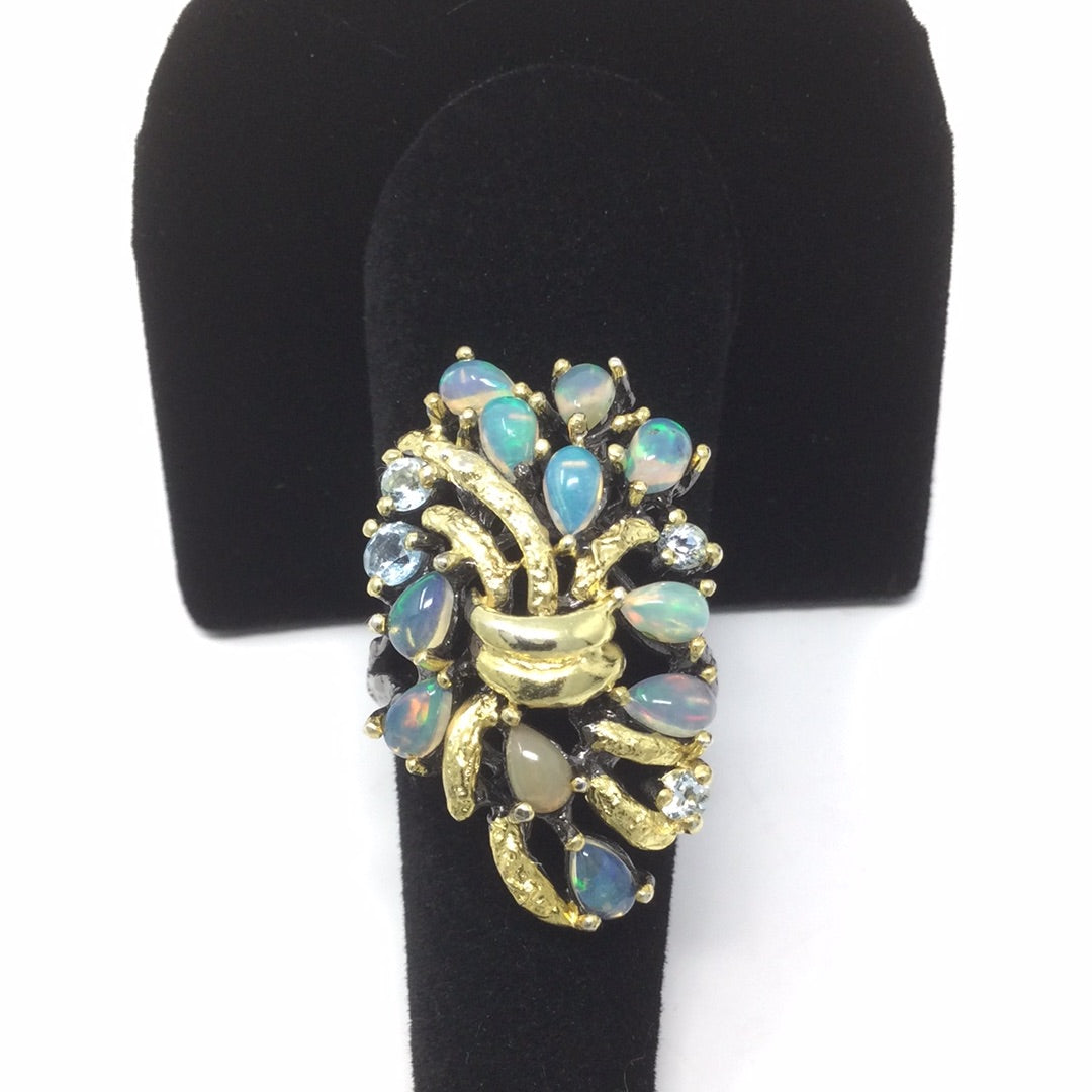 This is a genuine gemstone bouquet that lasts forever, always fresh and beautiful to inspire you with dreams and goals. This treasure feature eleven 5mm by 3mm pear shaped natural iridescent Opals and four petite Genuine Blue Topaz. This is set in .925 sterling silver with accents of 14K yellow gold over a Rhodium overlay for durability and beauty. A future family heirloom and a one of a kind masterpiece. Size 7, Resize at your jeweler.