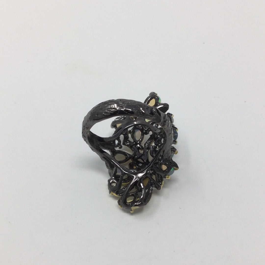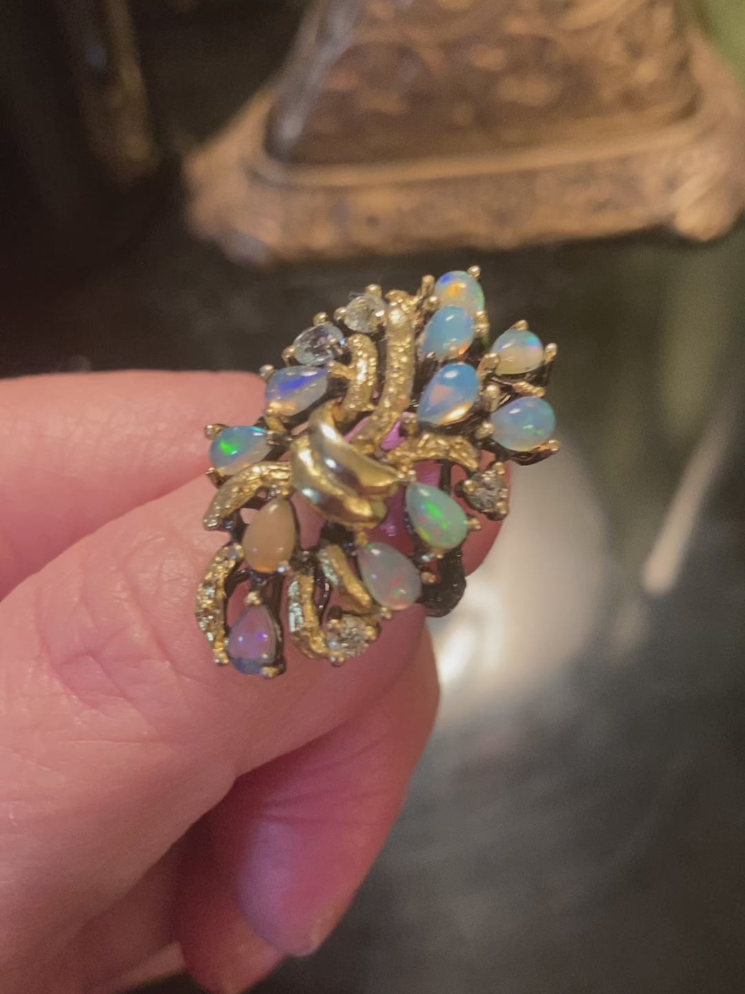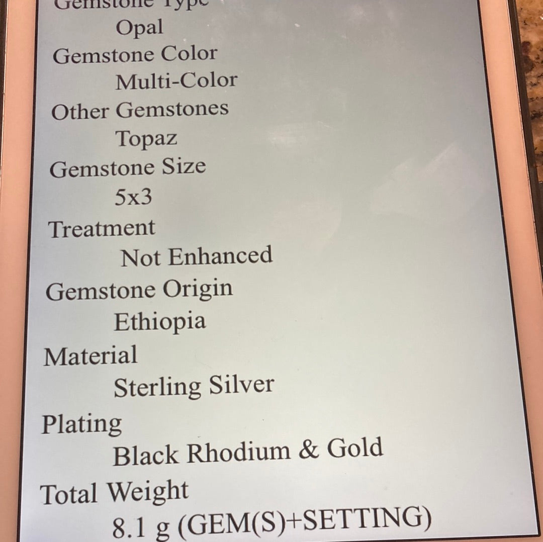 This is a genuine gemstone bouquet that lasts forever, always fresh and beautiful to inspire you with dreams and goals. This treasure feature eleven 5mm by 3mm pear shaped natural iridescent Opals and four petite Genuine Blue Topaz. This is set in .925 sterling silver with accents of 14K yellow gold over a Rhodium overlay for durability and beauty. A future family heirloom and a one of a kind masterpiece. Size 7, Resize at your jeweler.