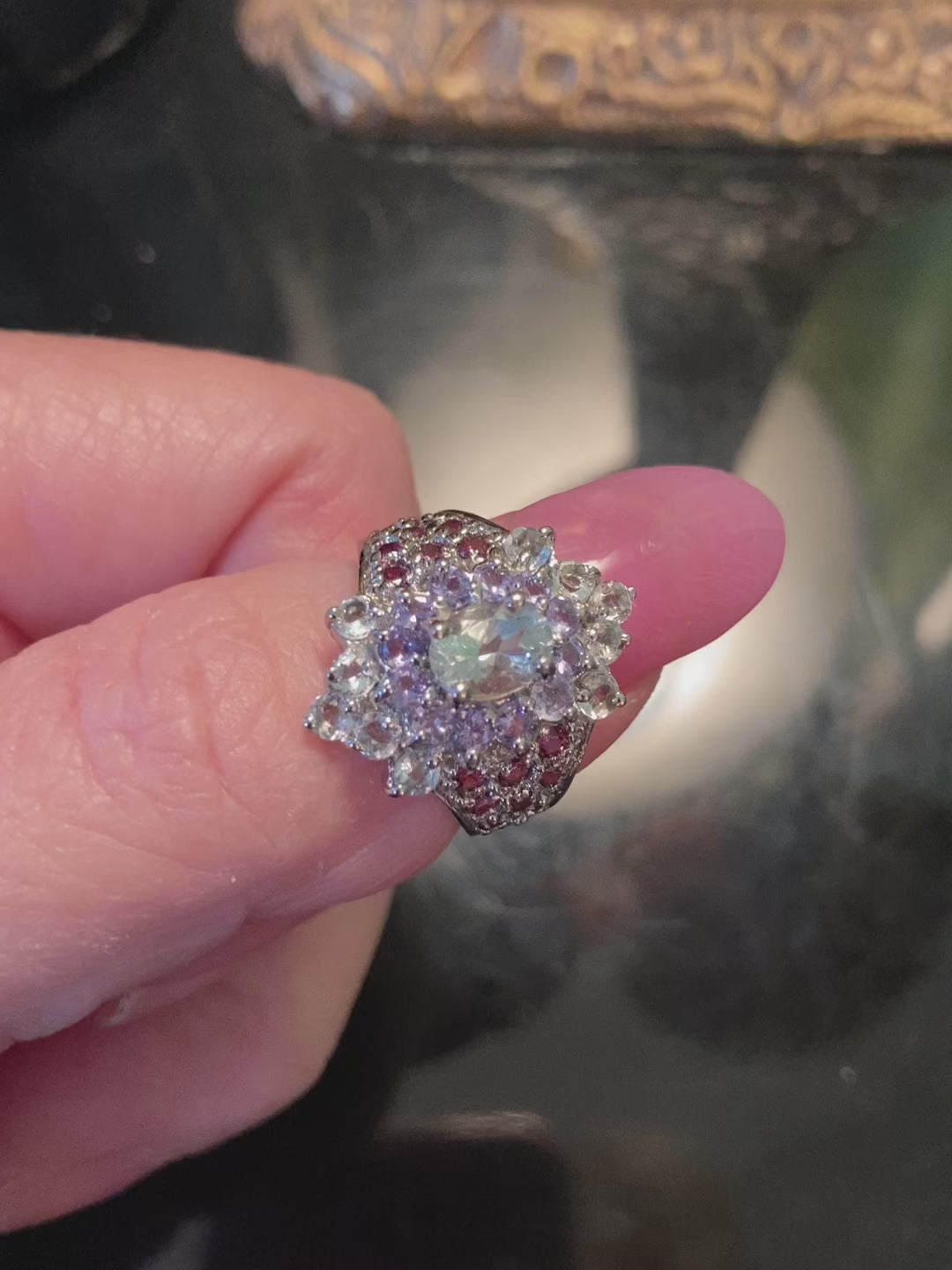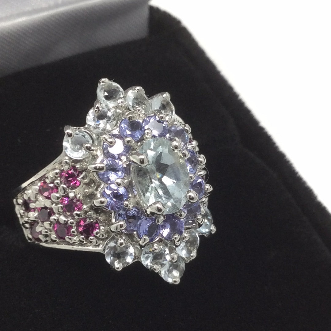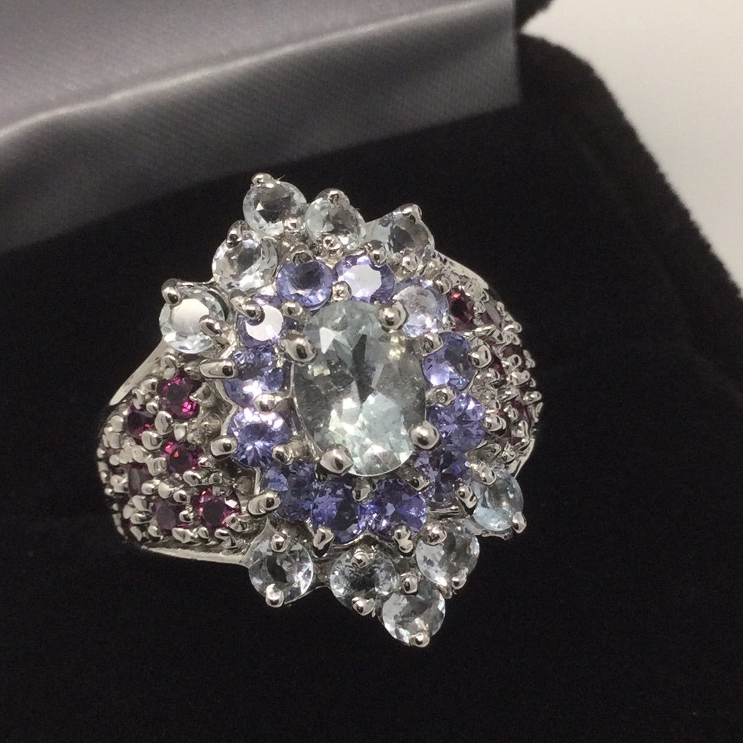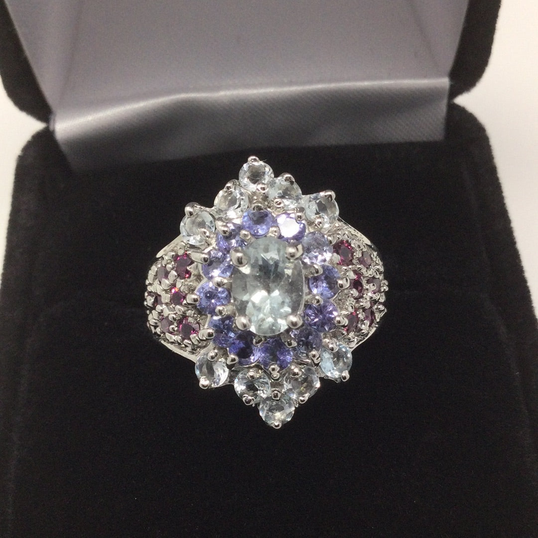 A very special treasure in this artistic treasure, featuring top quality Genuine Aquamarines, lavishly embraced with genuine Tanzanite along with dainty Garnets. Set in .925 with a 14K white gold overlay. A custom made one of a kind masterpiece, as unique as you are. Size 7, Can be resized at your jeweler.