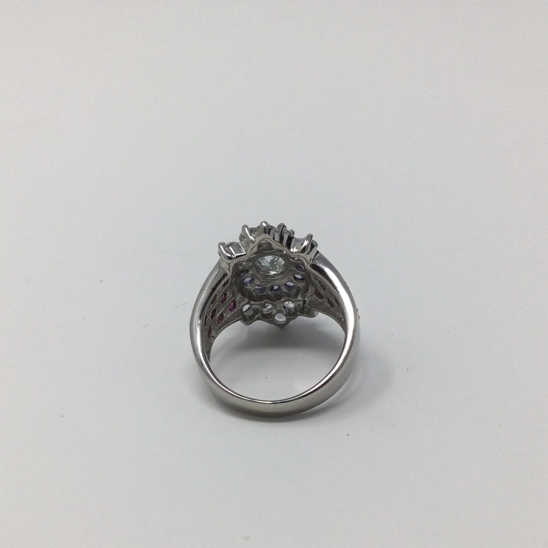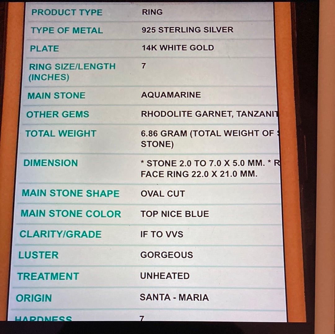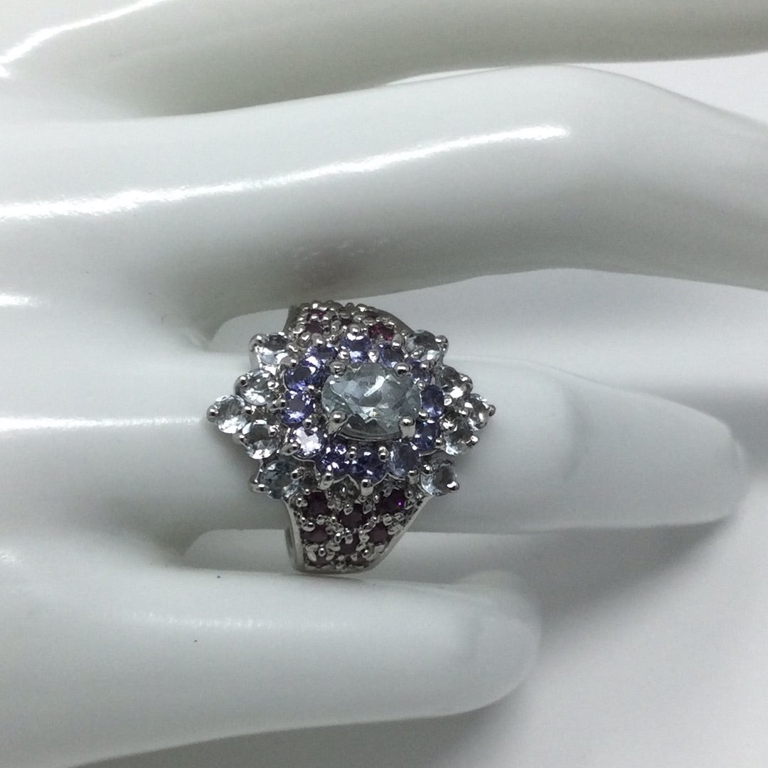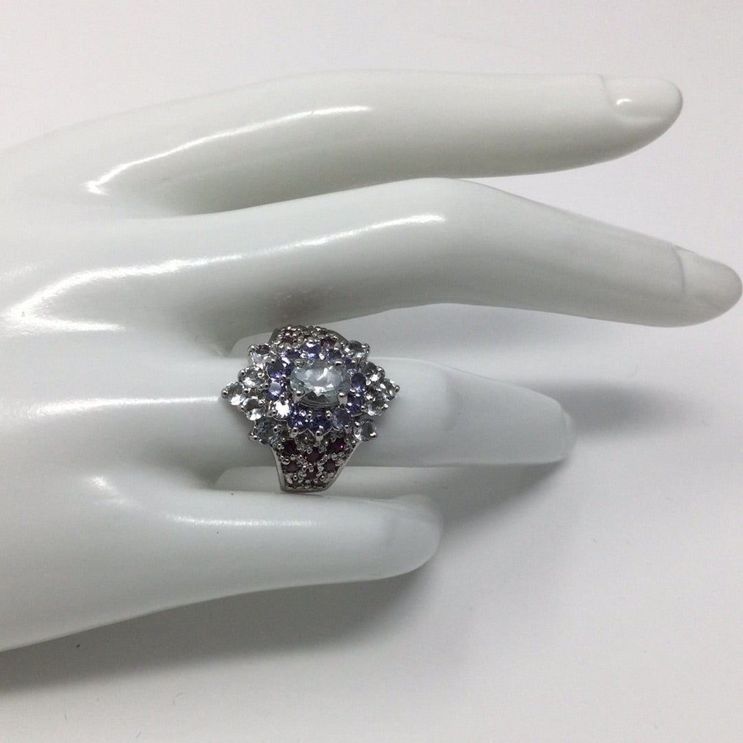 A very special treasure in this artistic treasure, featuring top quality Genuine Aquamarines, lavishly embraced with genuine Tanzanite along with dainty Garnets. Set in .925 with a 14K white gold overlay. A custom made one of a kind masterpiece, as unique as you are. Size 7, Can be resized at your jeweler.