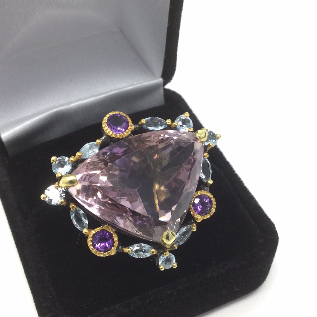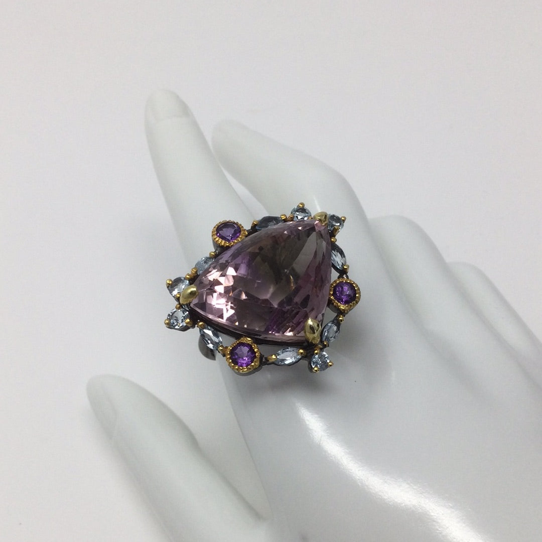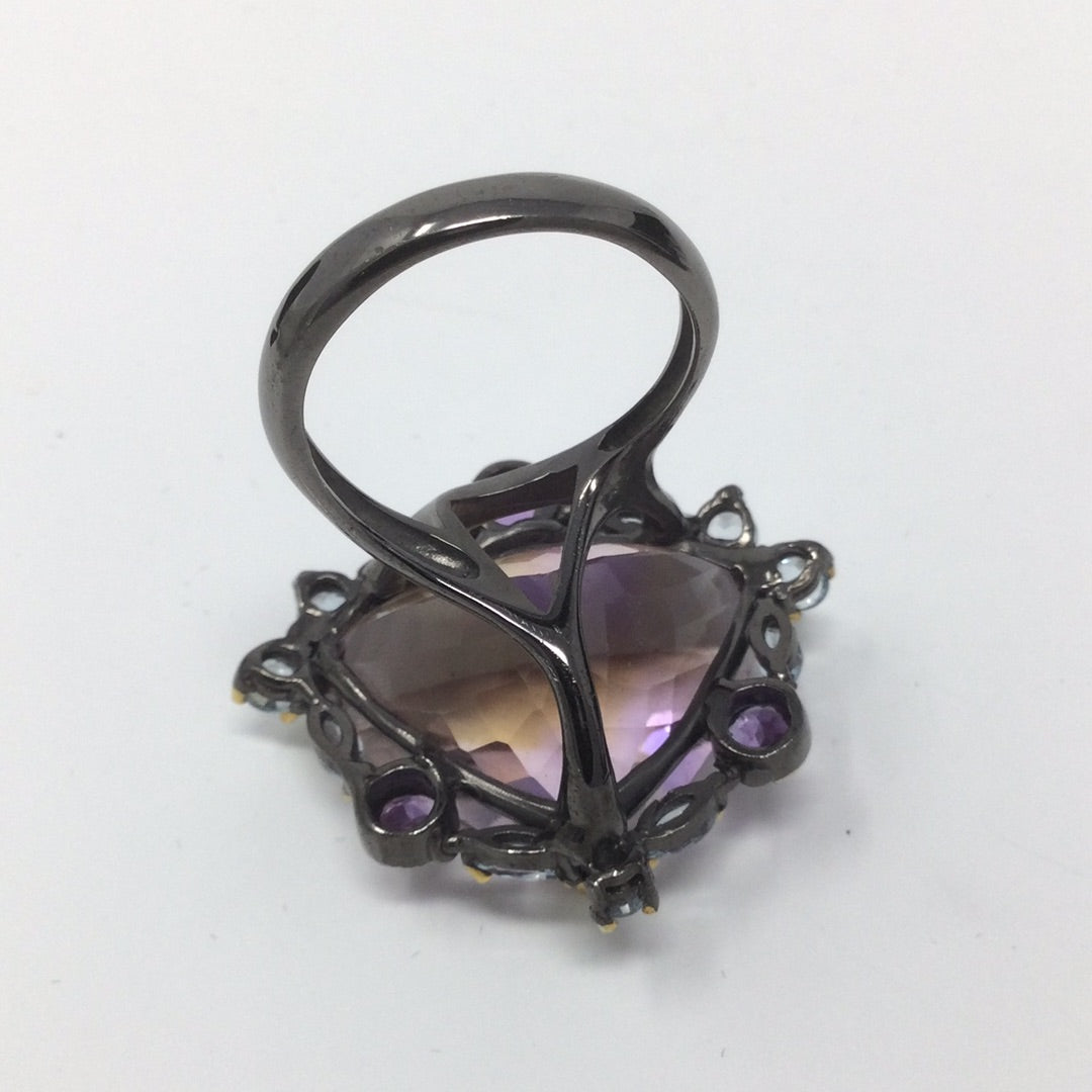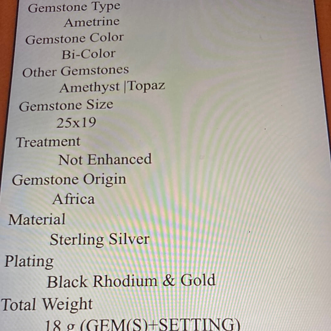 A rare find, this one of a kind amazing genuine Ametrine in this spectacular faceted Trillion cut. 25mm by 19mm of awesomeness in this explosion of brilliance in this genuine gemstone. The most beautiful golden lavender, world famous Ametrine known as the famous marriage of Amethyst and Citrine. Accented with genuine Topaz and Amethyst in this masterpiece of art for your hand. Notice the depth of this gemstone, a custom made one of a kind designed setting. Set in a .925 with a Black Rhodium & Gold overlay. Size 8 1/2, resize at your jeweler or use a ring guard.