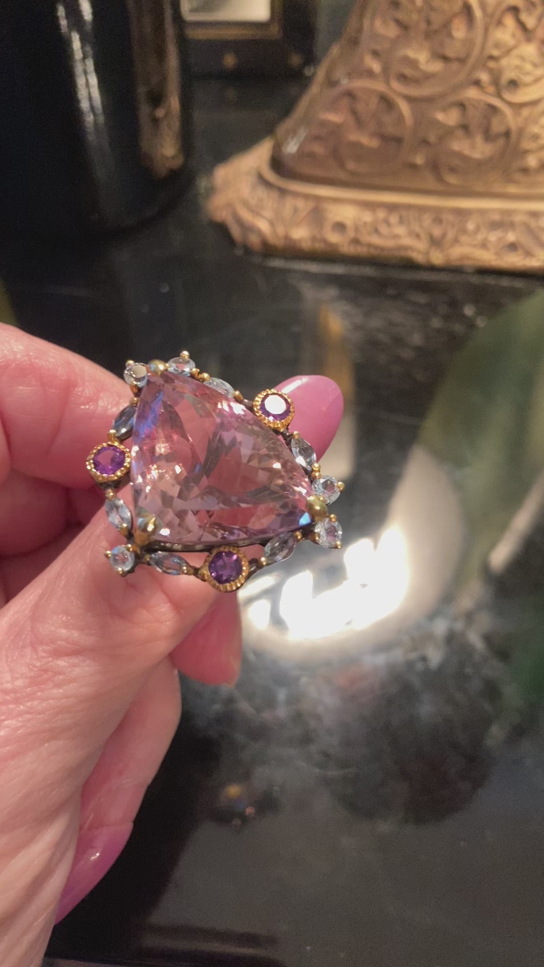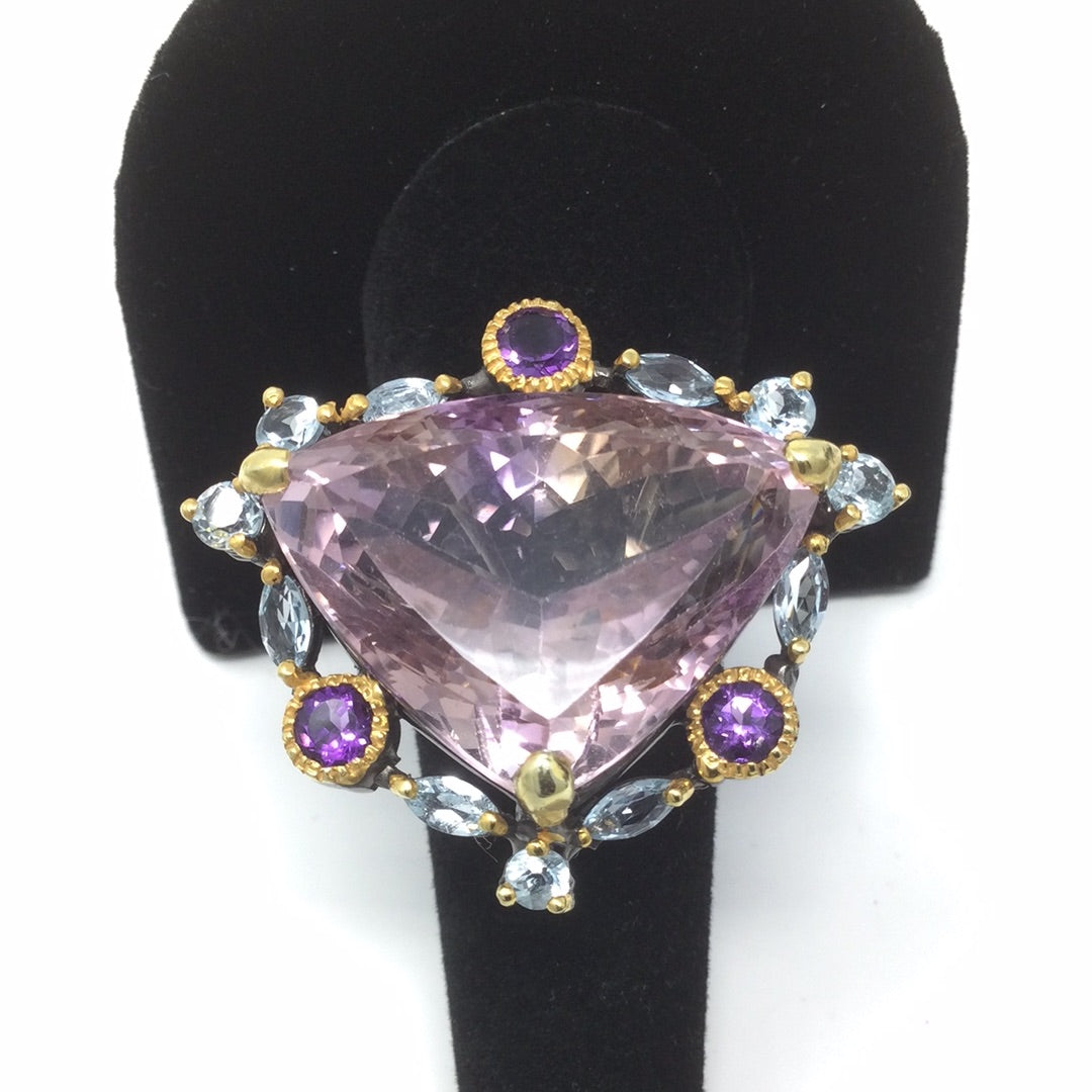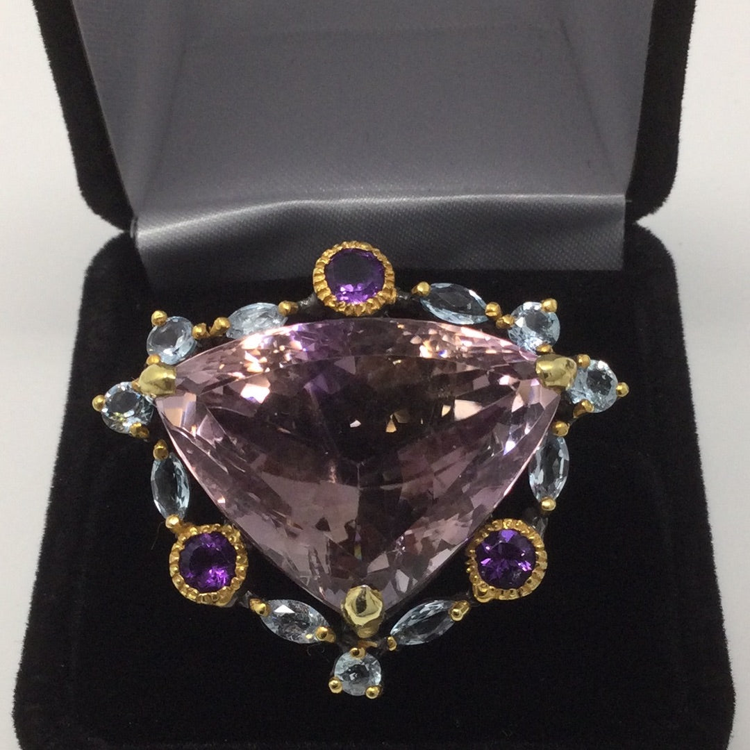 A rare find, this one of a kind amazing genuine Ametrine in this spectacular faceted Trillion cut. 25mm by 19mm of awesomeness in this explosion of brilliance in this genuine gemstone. The most beautiful golden lavender, world famous Ametrine known as the famous marriage of Amethyst and Citrine. Accented with genuine Topaz and Amethyst in this masterpiece of art for your hand. Notice the depth of this gemstone, a custom made one of a kind designed setting. Set in a .925 with a Black Rhodium & Gold overlay. Size 8 1/2, resize at your jeweler or use a ring guard.