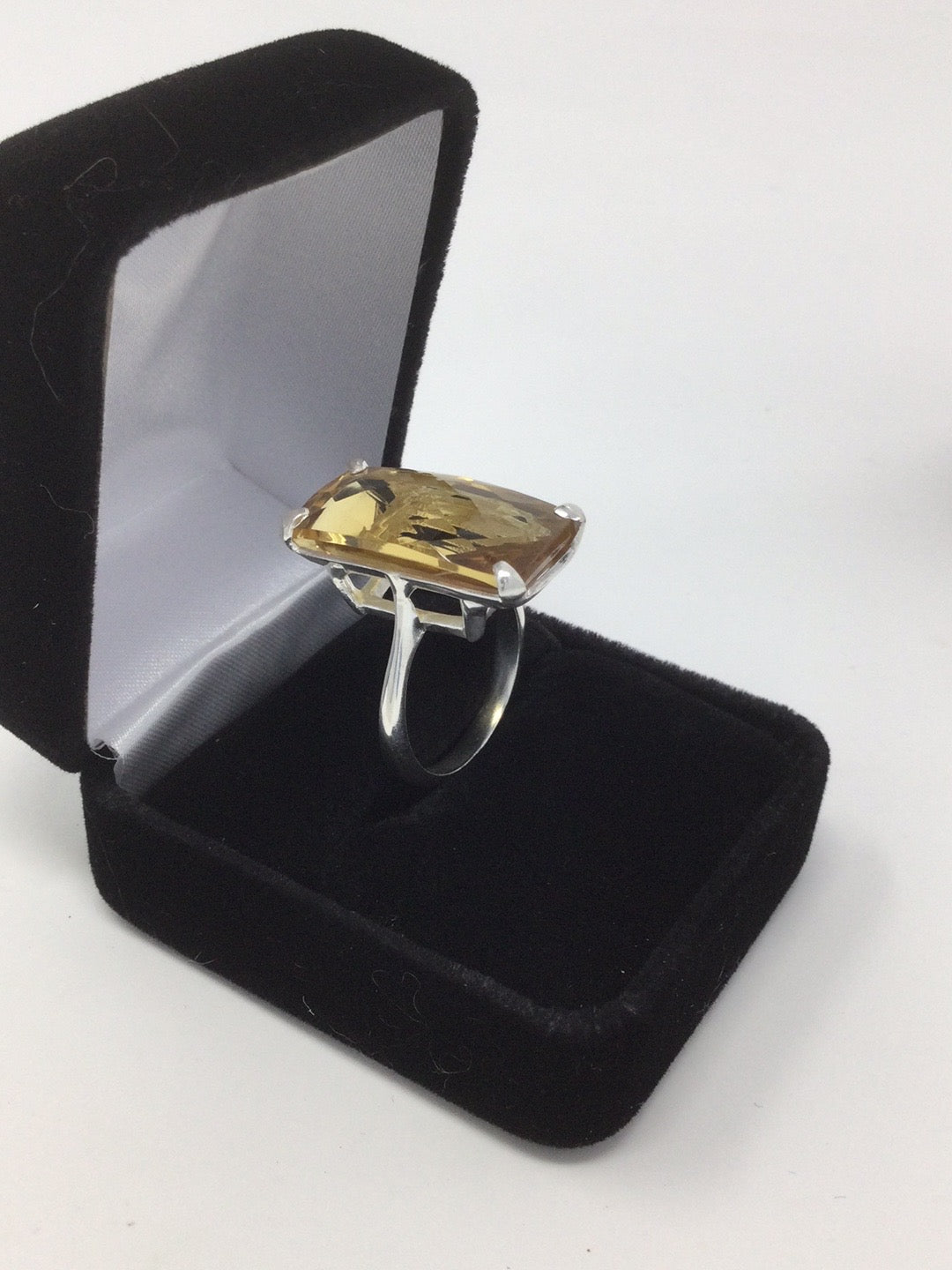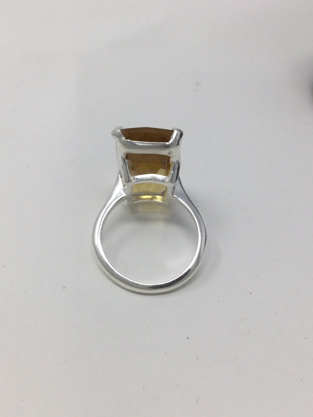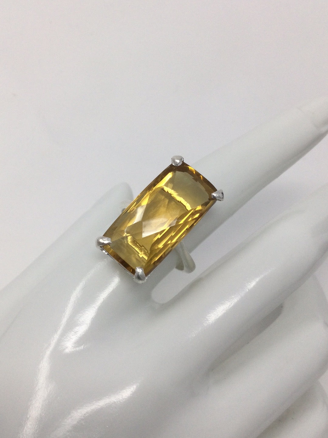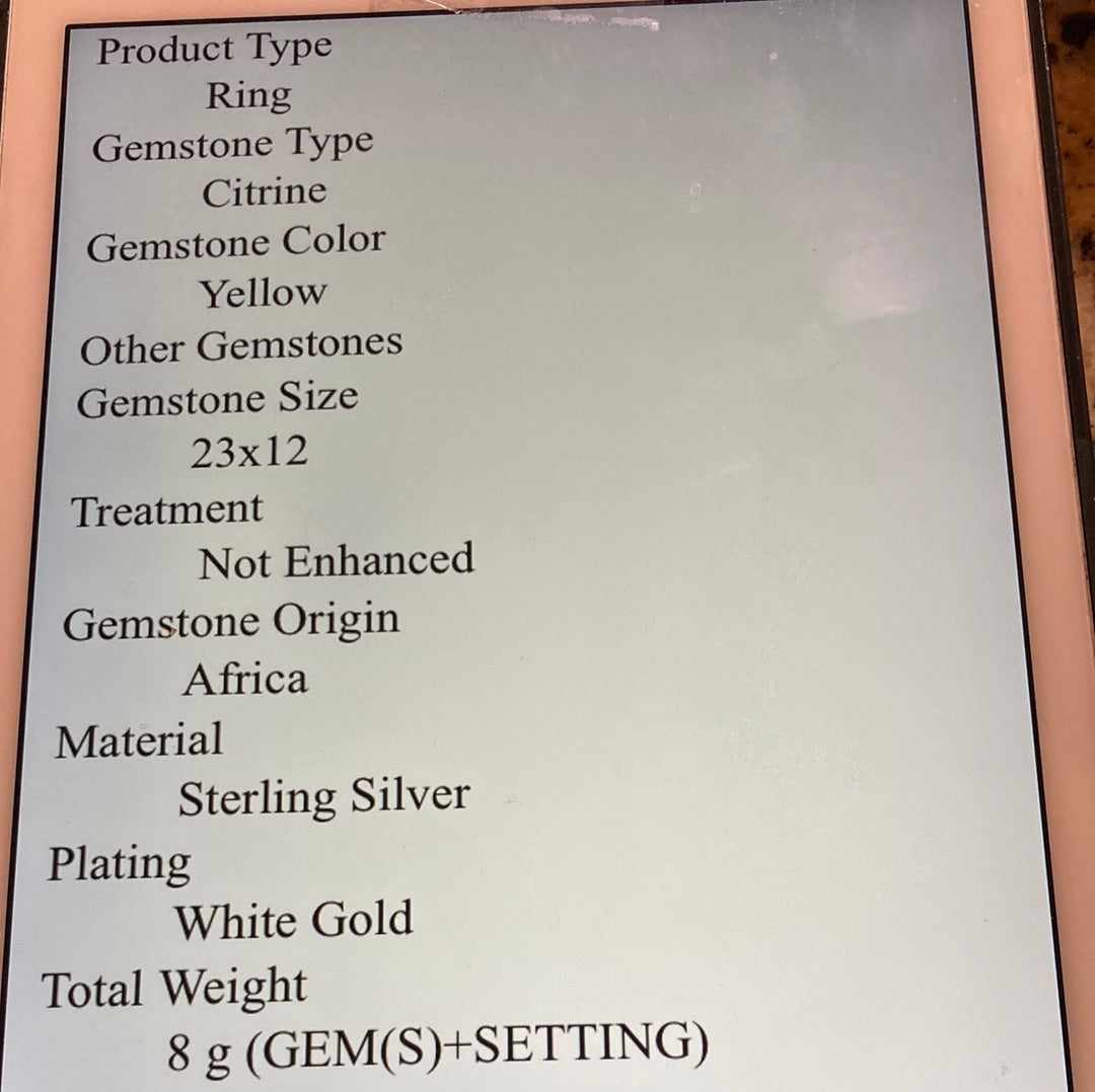 Exclusive, custom made, one of a kind ring featuring that rare checkerboard faceting. This ring has a graceful and elegant high end look. Set in .925 Sterling Silver with a 14K white gold overlay, a gemstone like this is inspiring and will be like an aura of light. To find a 30 CTW genuine Citrine requires a very large specimen of raw gemstone before it gets faceting. This type of faceting really shows of the gemstone and reflects light. Size 9, Resize at your jeweler.