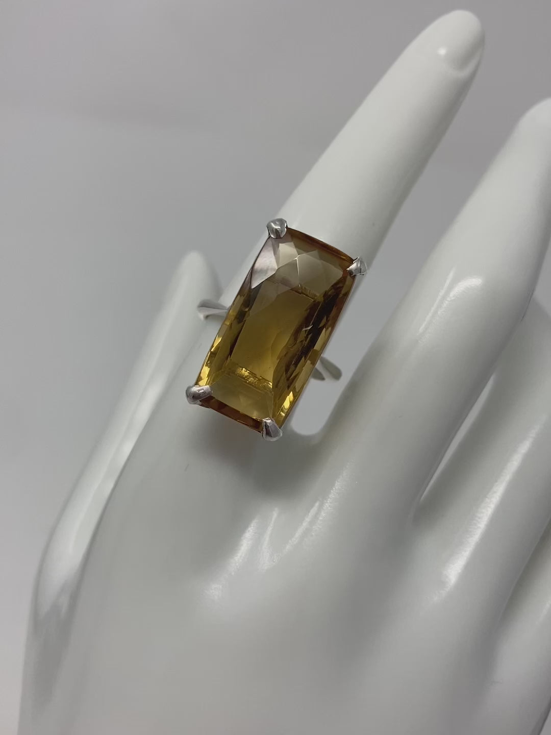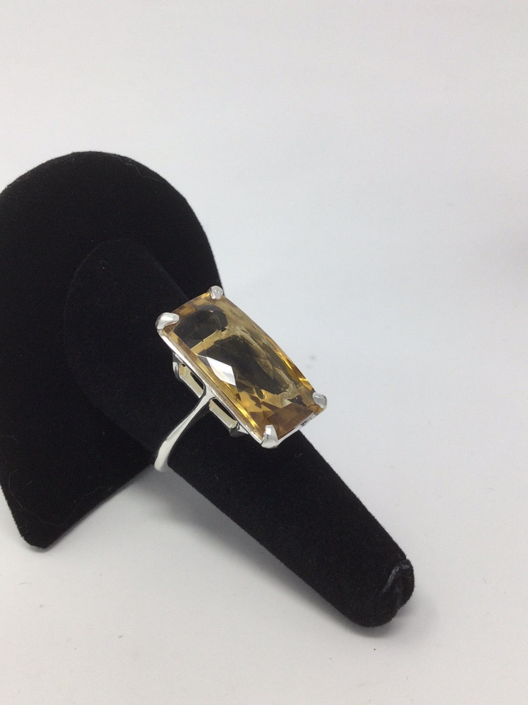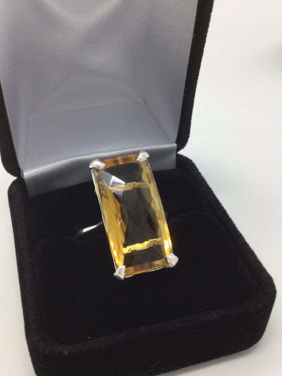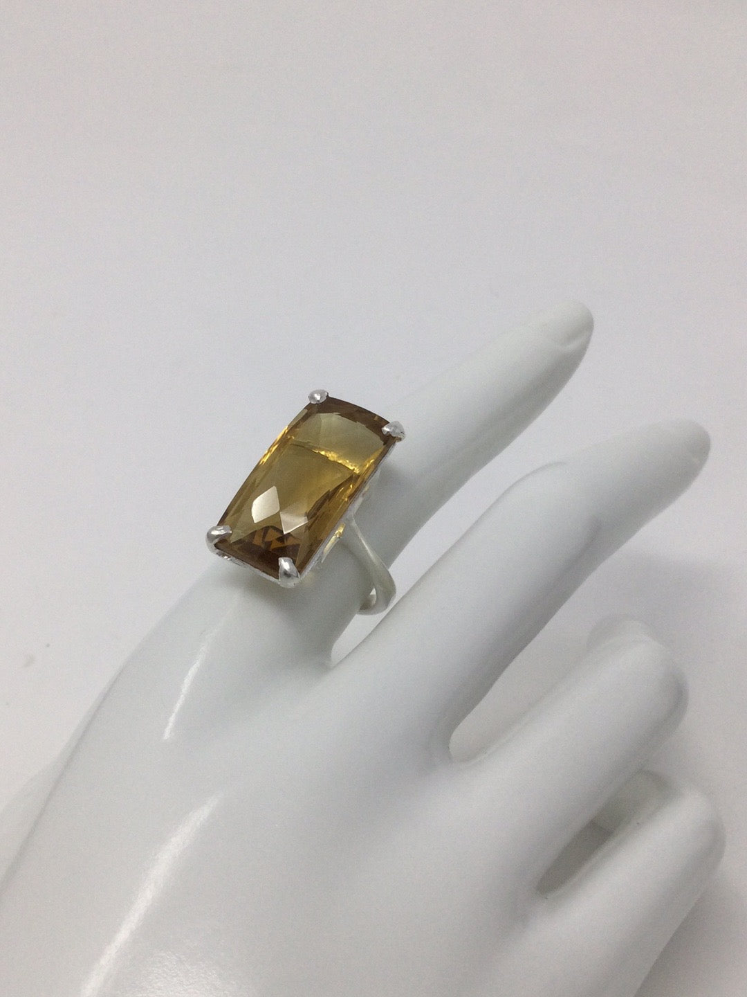 Exclusive, custom made, one of a kind ring featuring that rare checkerboard faceting. This ring has a graceful and elegant high end look. Set in .925 Sterling Silver with a 14K white gold overlay, a gemstone like this is inspiring and will be like an aura of light. To find a 30 CTW genuine Citrine requires a very large specimen of raw gemstone before it gets faceting. This type of faceting really shows of the gemstone and reflects light. Size 9, Resize at your jeweler.