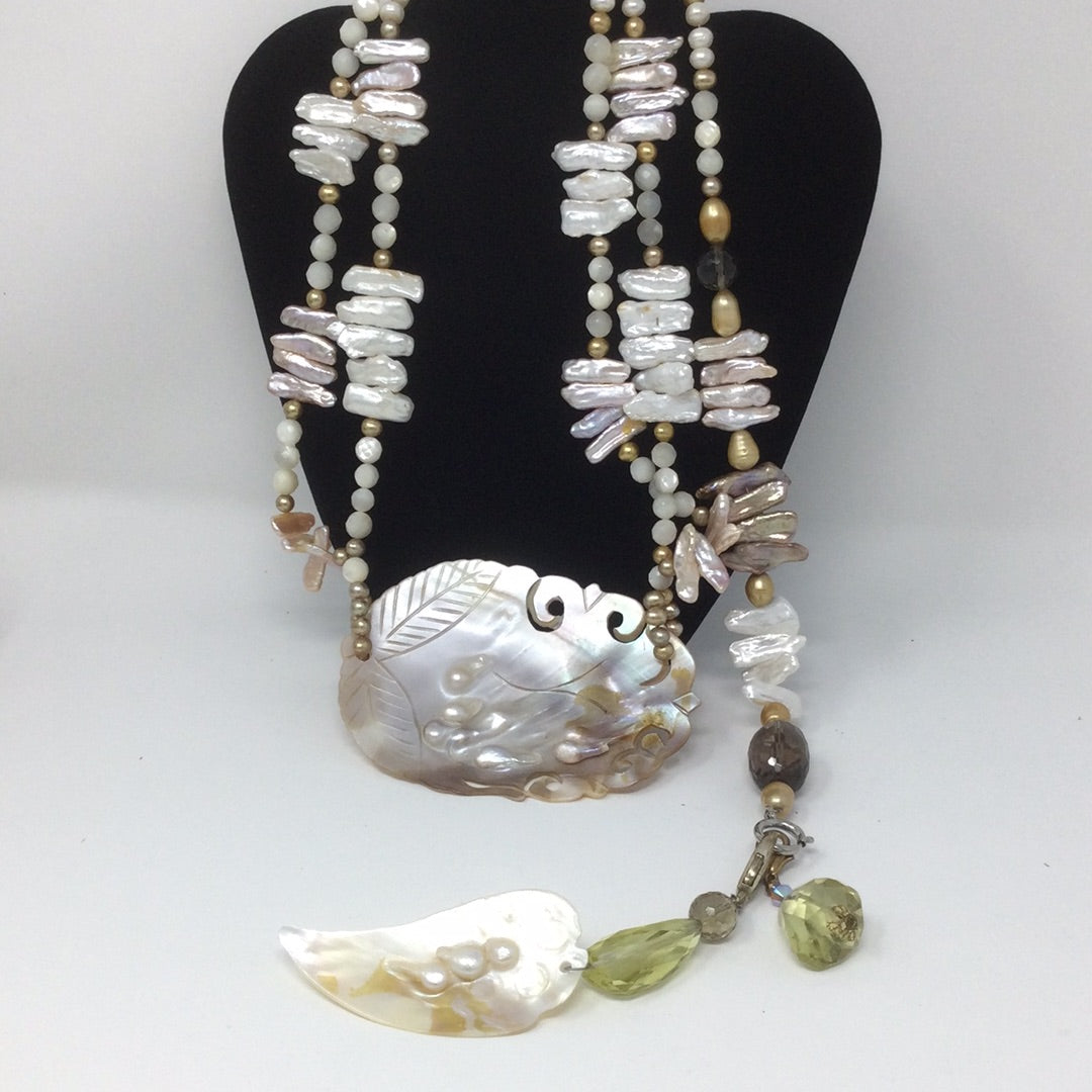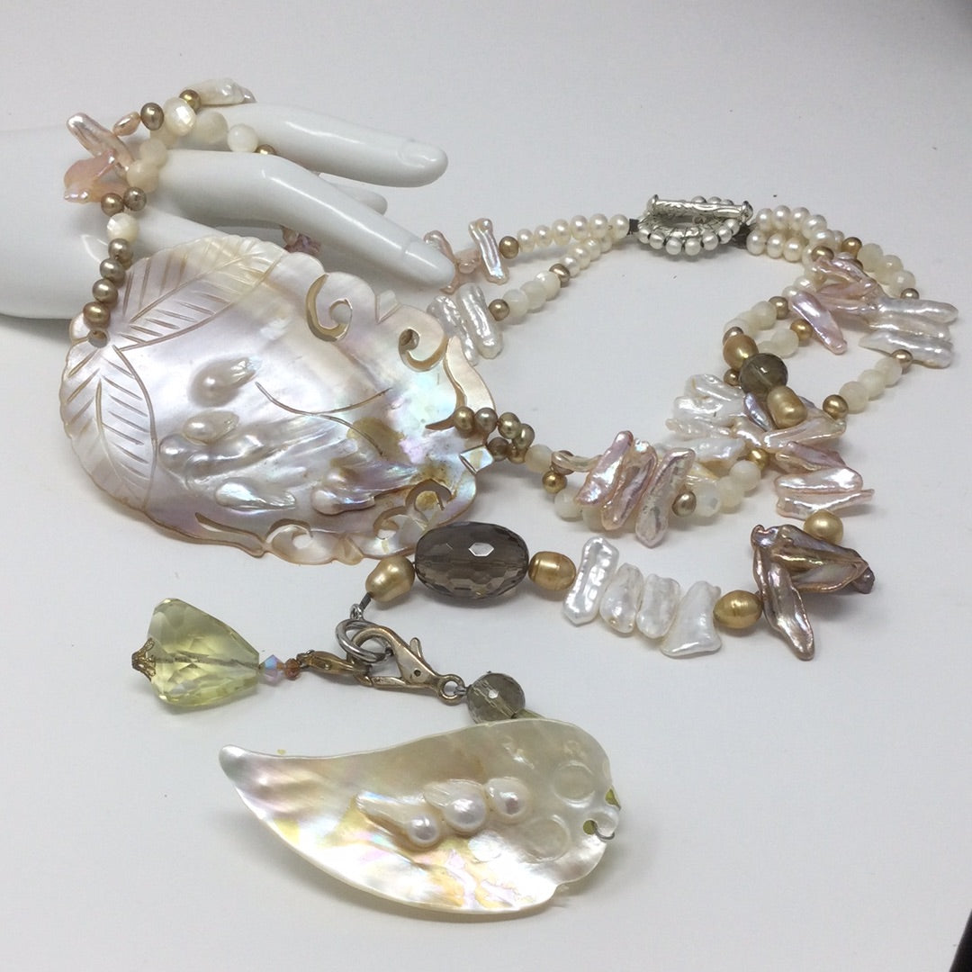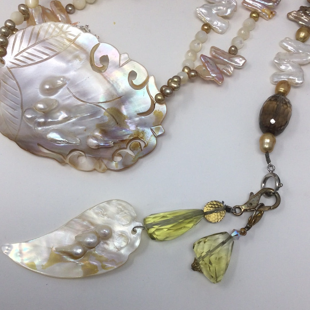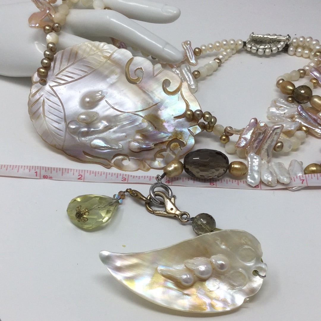 Wearing your variety of genuine Pearls that a styling majestic mermaid would adorn herself with these genuine treasures from the . This necklace is a one of a kind, Avant-garde creation for those that can and will be the Queen of land and sea. I used large specimen blister pearls, relatives of baroque pearl formations that looks like a celestial pearl universe. Notice also the large genuine top quality faceted Lemon Quartz and Smokey Quartz and faceted mother or pearl which is almost unheard of! There are authentic Swarovski crystals interspersed throughout the necklace along with Genuine Biwa Pearls, Freshwater pearls in champagne hues. The collar portion of the necklace is 20” long and the single strand drops down to 36” with removable tassel of gemstones. Or you can clip on your own accessory or custom order another tassel of gems if you like. It’s Art from the sea created by Miss Debbie when I used to be a mermaid.
