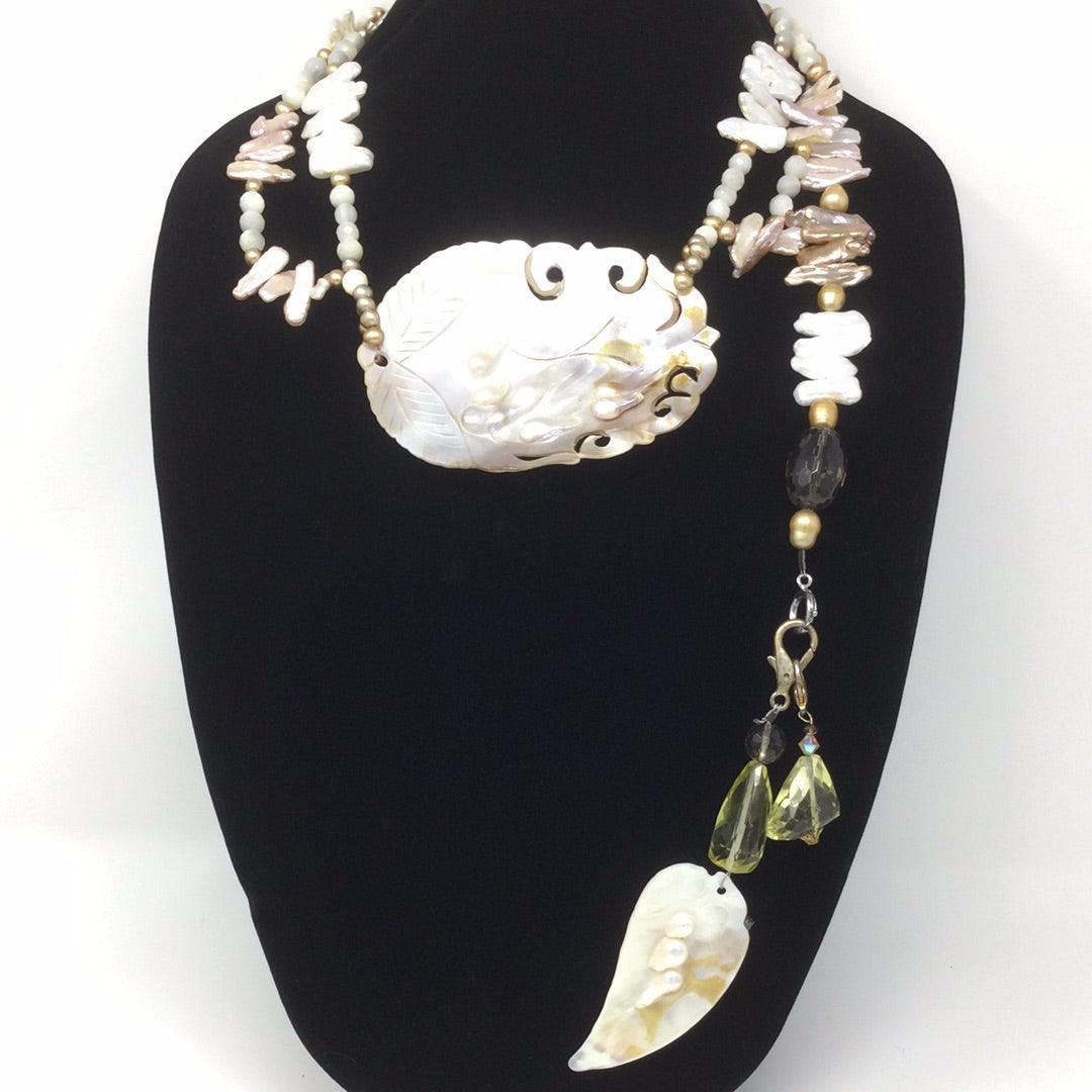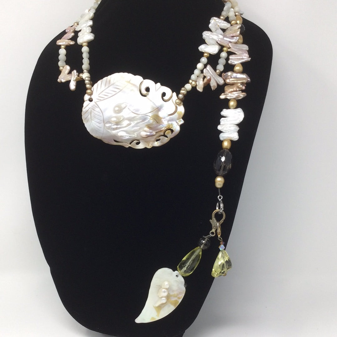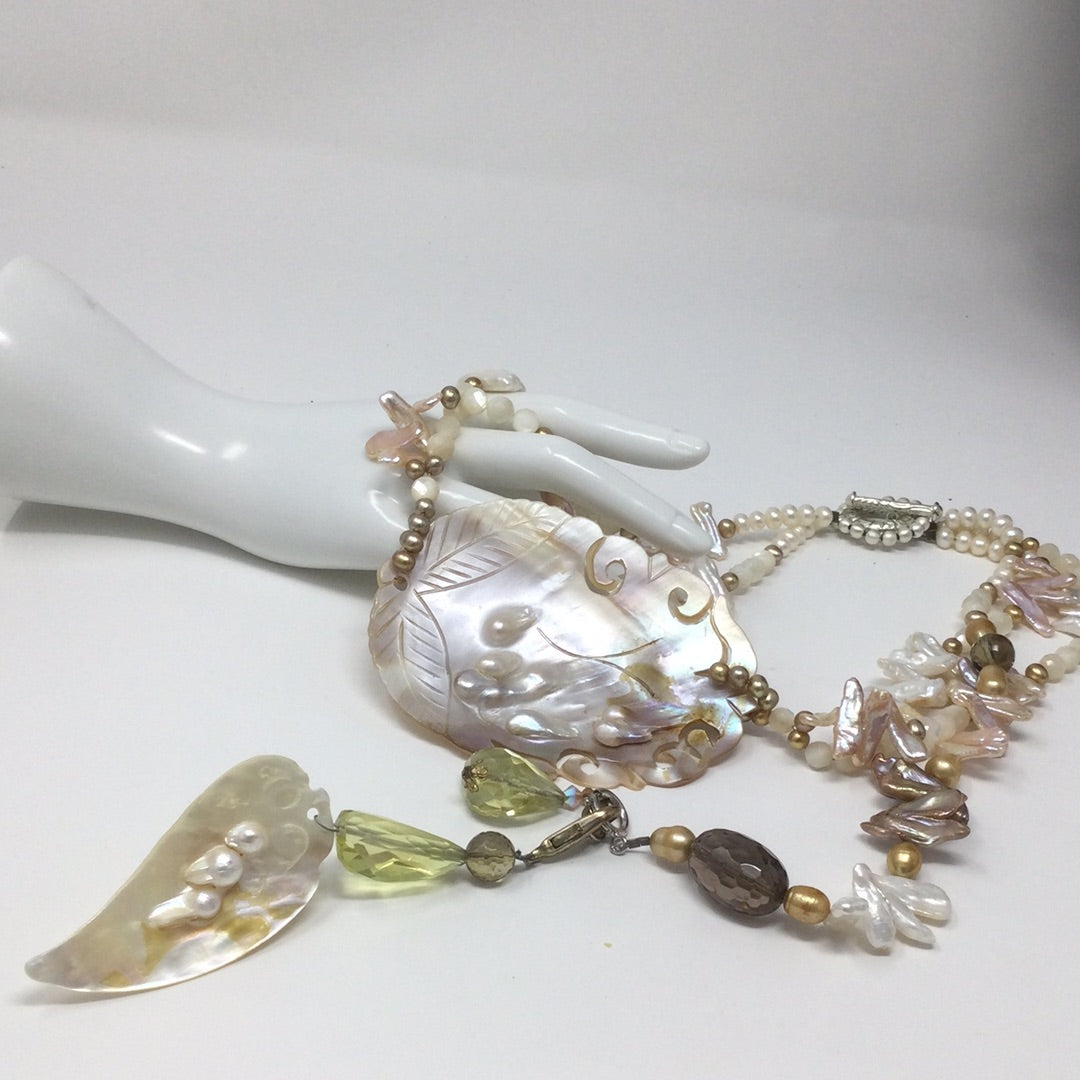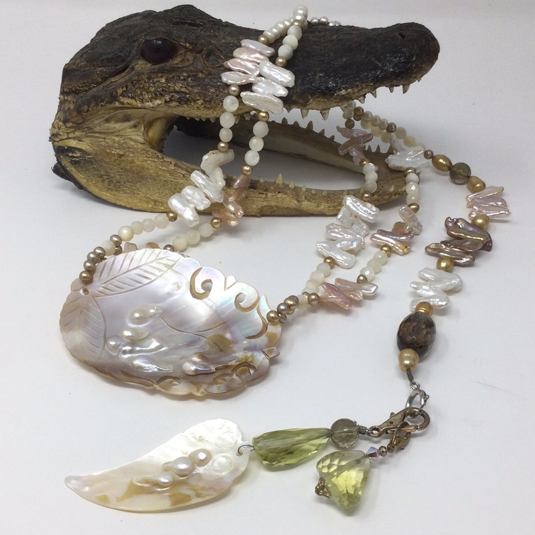 Wearing your variety of genuine Pearls that a styling majestic mermaid would adorn herself with these genuine treasures from the . This necklace is a one of a kind, Avant-garde creation for those that can and will be the Queen of land and sea. I used large specimen blister pearls, relatives of baroque pearl formations that looks like a celestial pearl universe. Notice also the large genuine top quality faceted Lemon Quartz and Smokey Quartz and faceted mother or pearl which is almost unheard of! There are authentic Swarovski crystals interspersed throughout the necklace along with Genuine Biwa Pearls, Freshwater pearls in champagne hues. The collar portion of the necklace is 20” long and the single strand drops down to 36” with removable tassel of gemstones. Or you can clip on your own accessory or custom order another tassel of gems if you like. It’s Art from the sea created by Miss Debbie when I used to be a mermaid.
