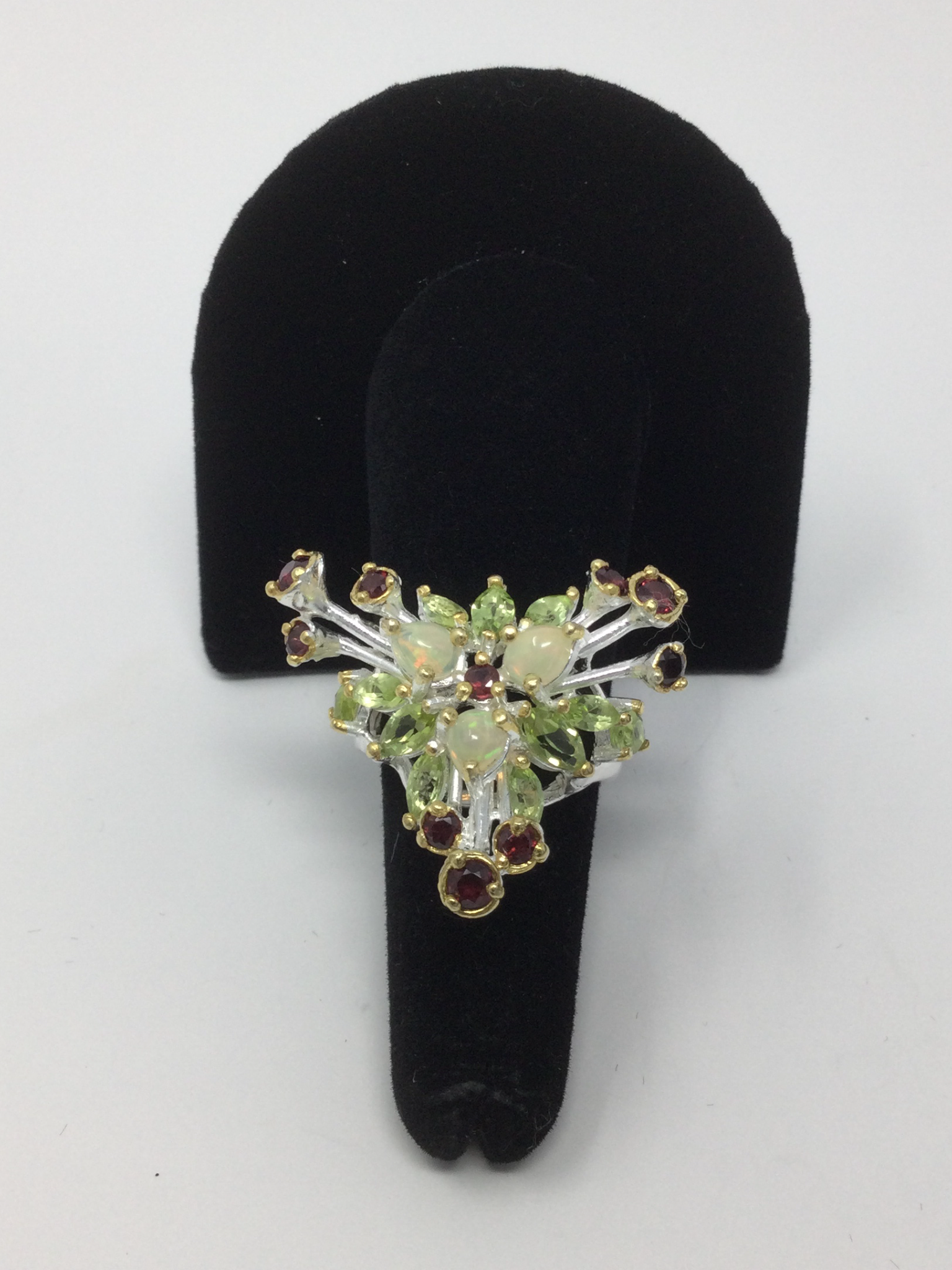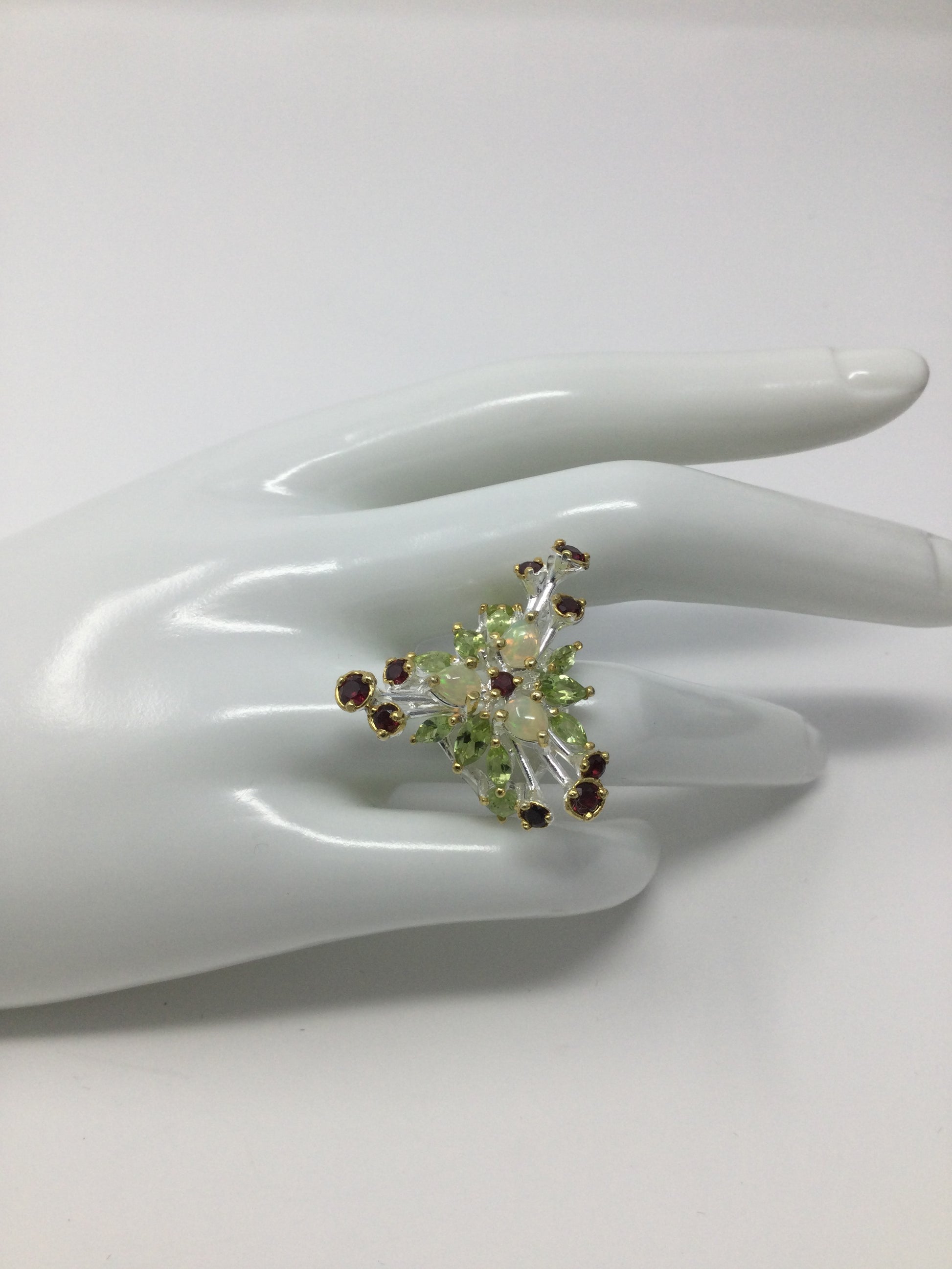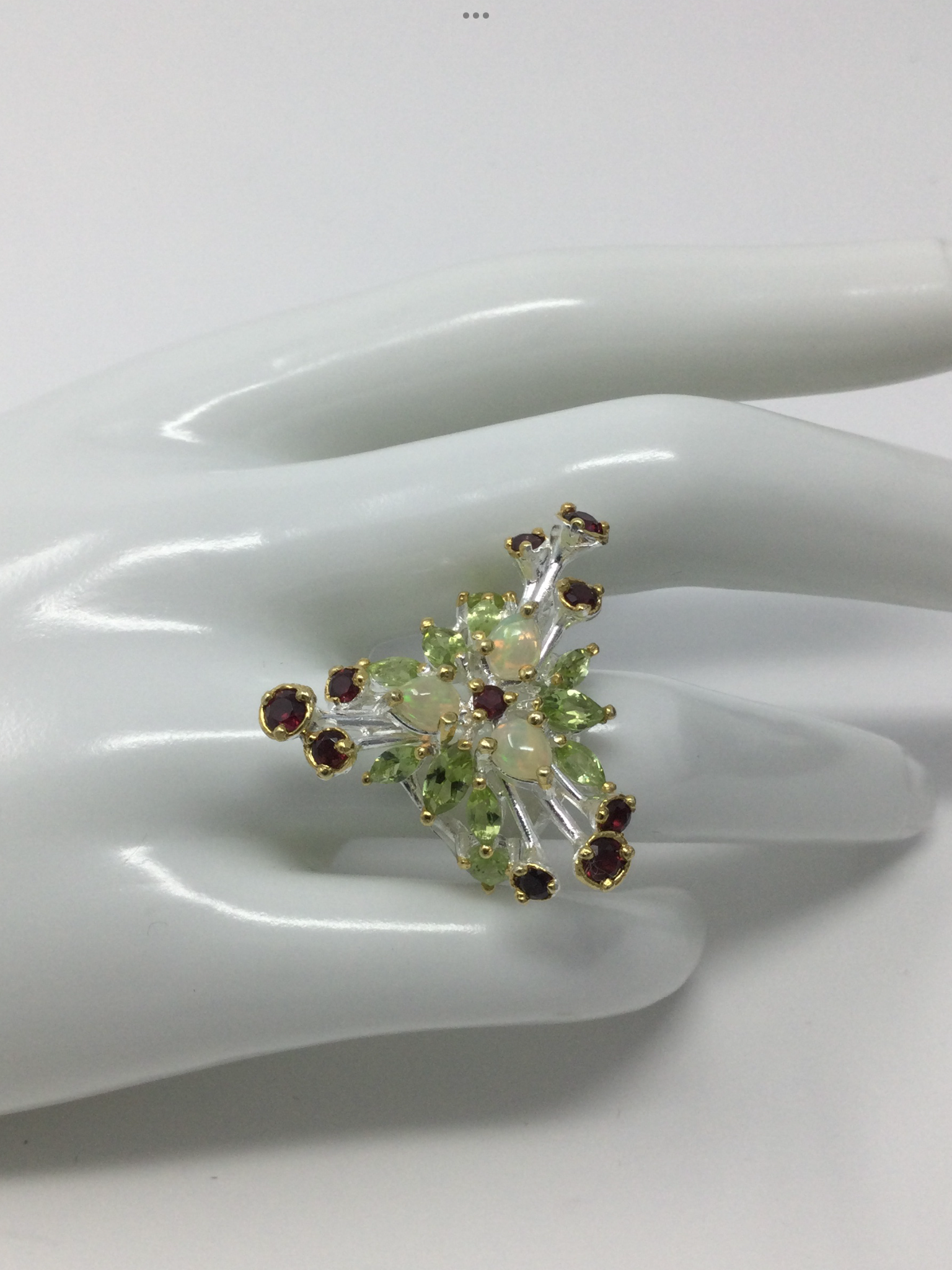 A gorgeous Galaxy ring of genuine gemstones, featuring fiery Opals, Garnets & Peridot. This ring resembles a galaxy of celestial stars in the heavens above. It is a unique one of a kind design that is just spectacularly different. Set in .925 with. 14K white gold overlay, be a shining star in this galaxy ring. Size 6, can be resized at your jeweler.
