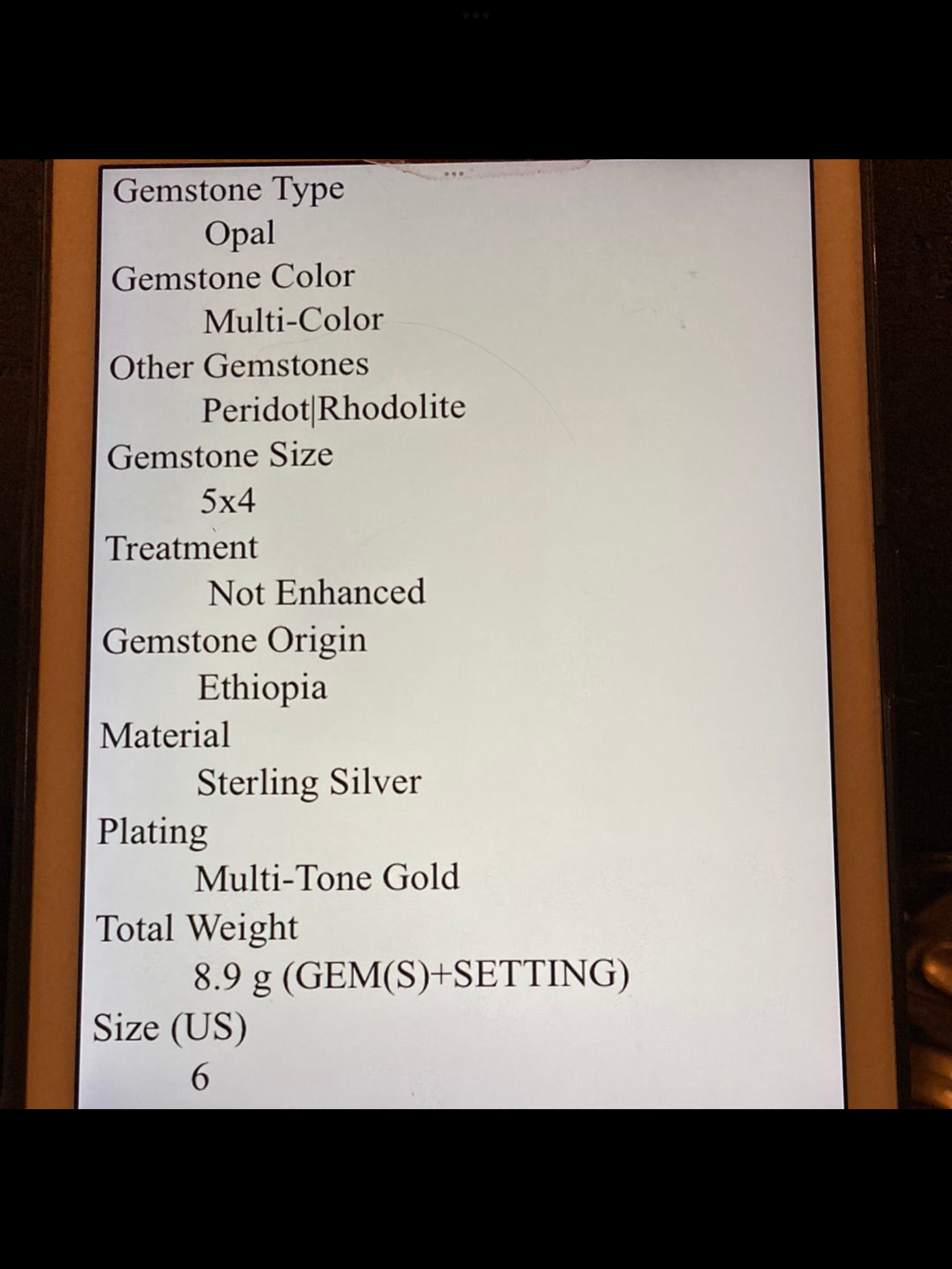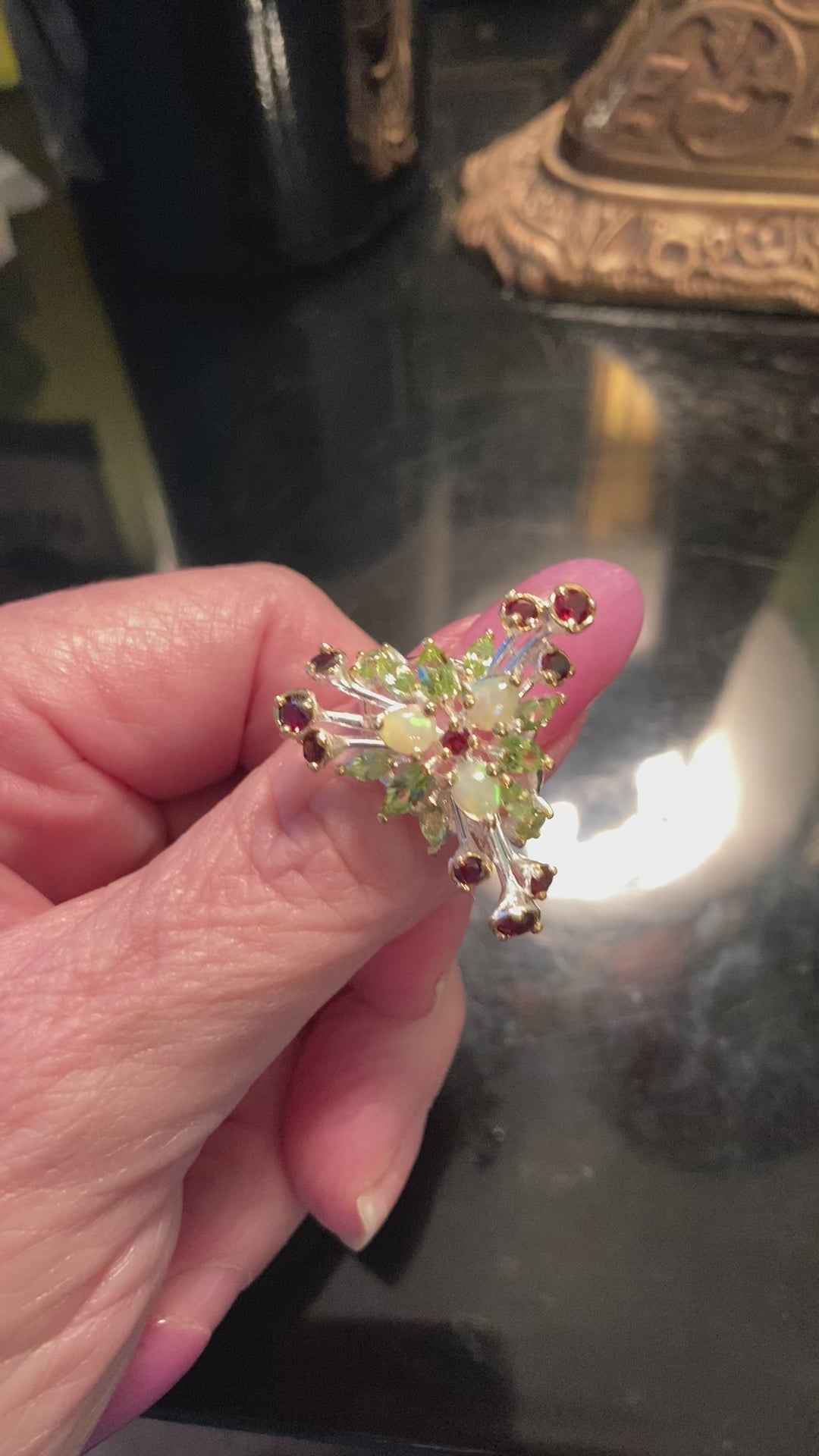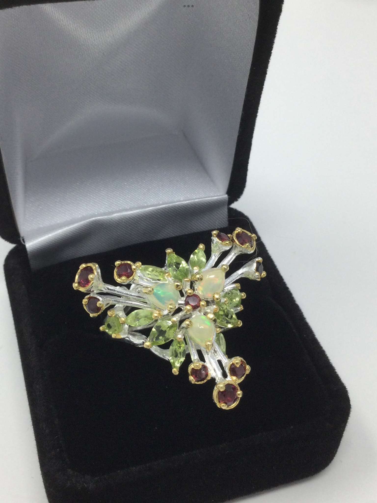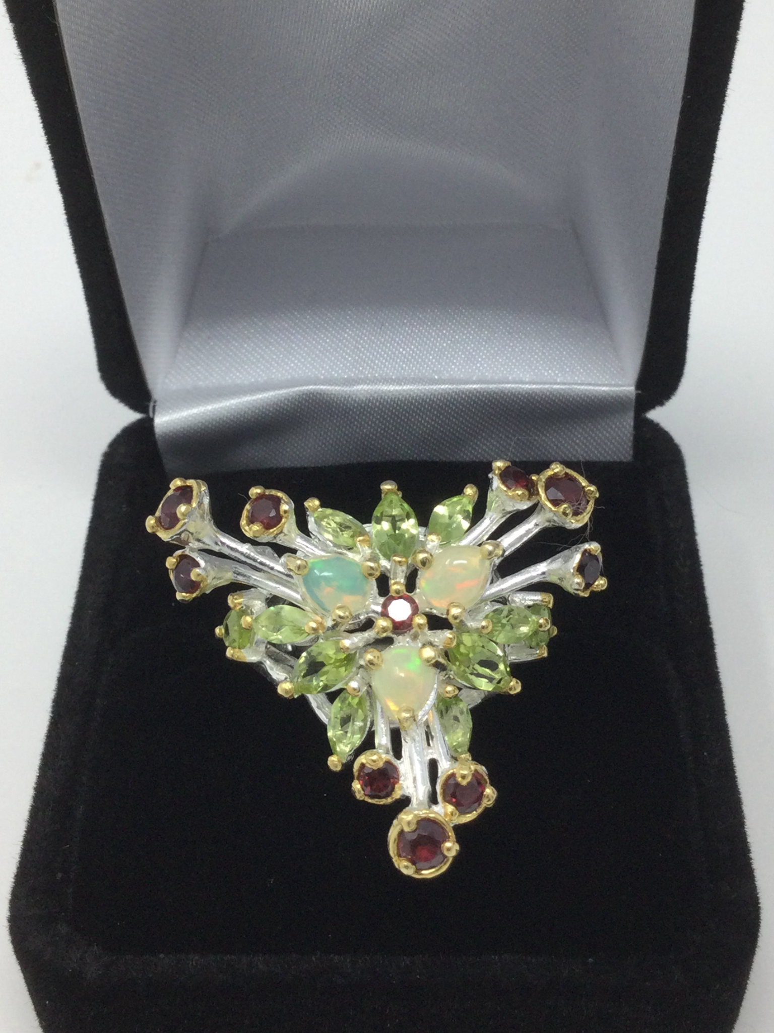 A gorgeous Galaxy ring of genuine gemstones, featuring fiery Opals, Garnets & Peridot. This ring resembles a galaxy of celestial stars in the heavens above. It is a unique one of a kind design that is just spectacularly different. Set in .925 with. 14K white gold overlay, be a shining star in this galaxy ring. Size 6, can be resized at your jeweler.