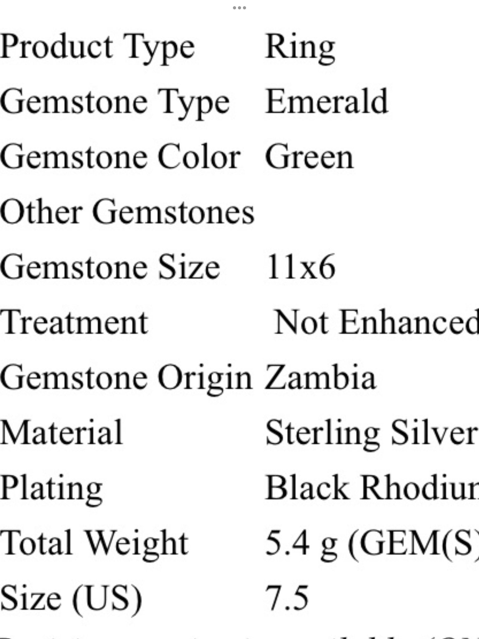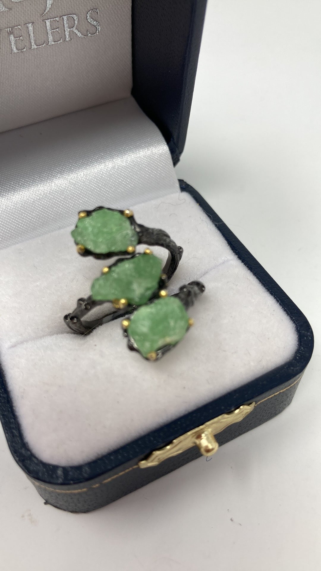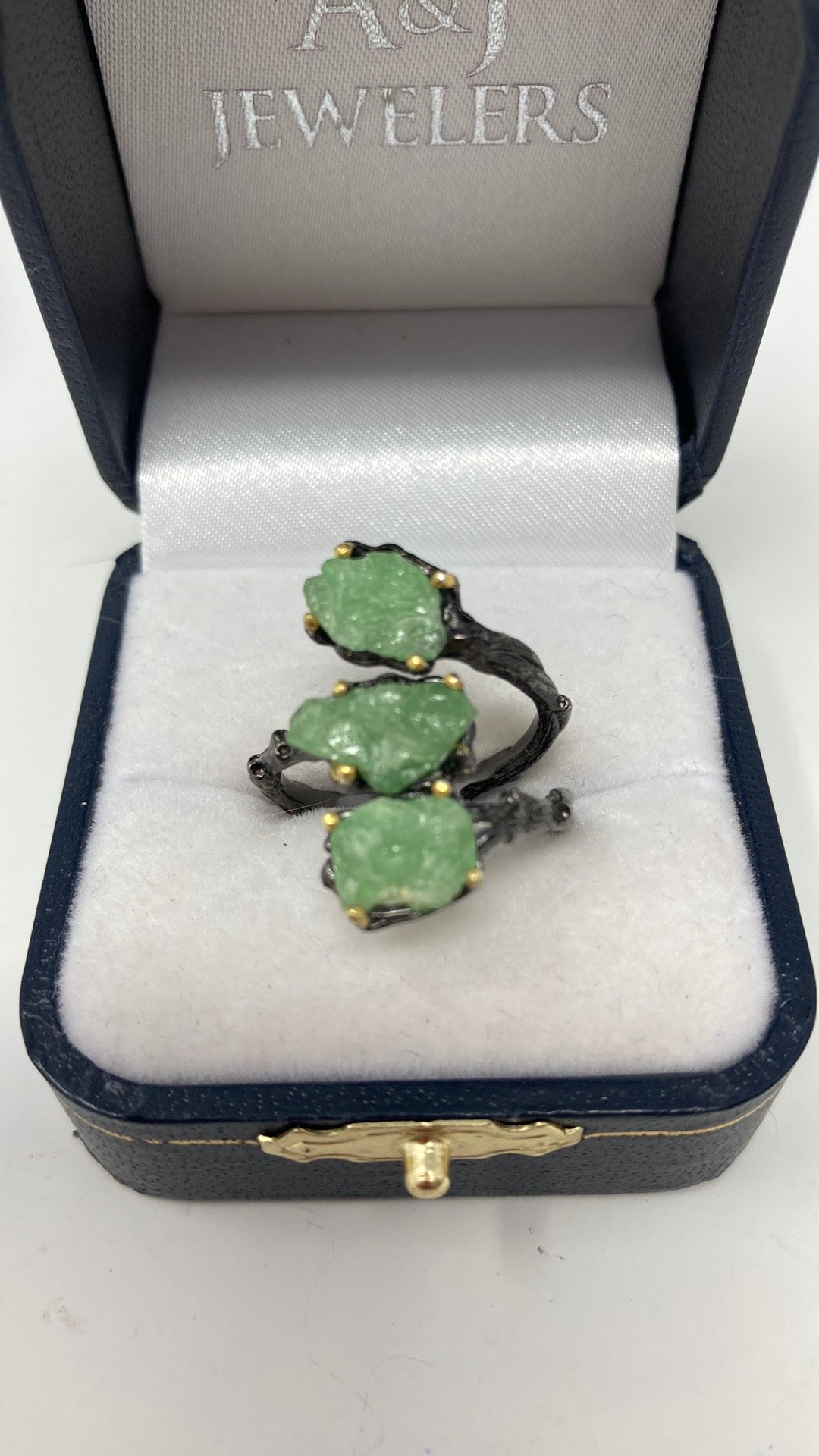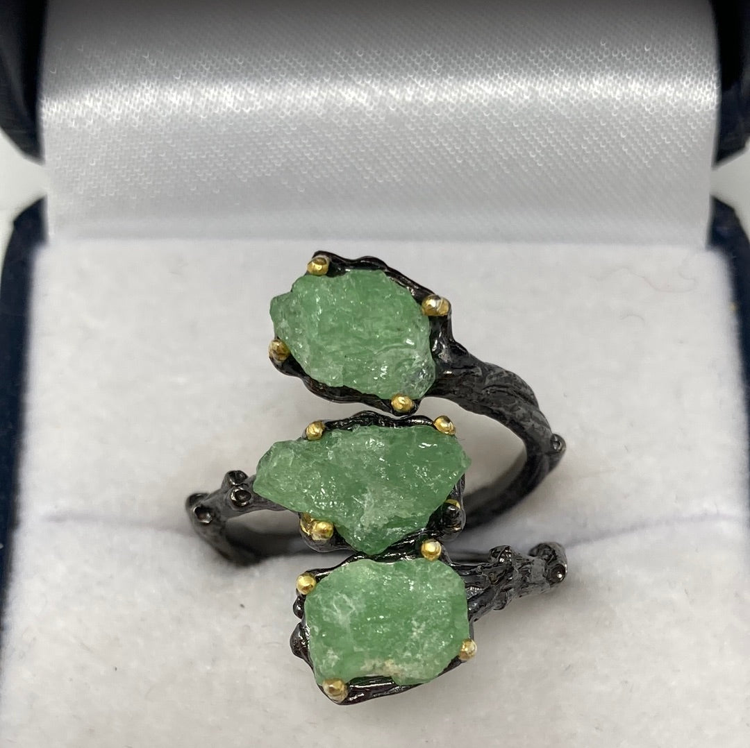 Natural, genuine raw, uncut and unpolished Emeralds measuring 11mm by 7mm. A very edgy look and the gemstones are just gorgeous and unique. Set in .925 Sterling Silver with a Rhodium overlay for durability and beauty. It’s a artsy contemporary look that is as unique as you are. Size 7 1/2