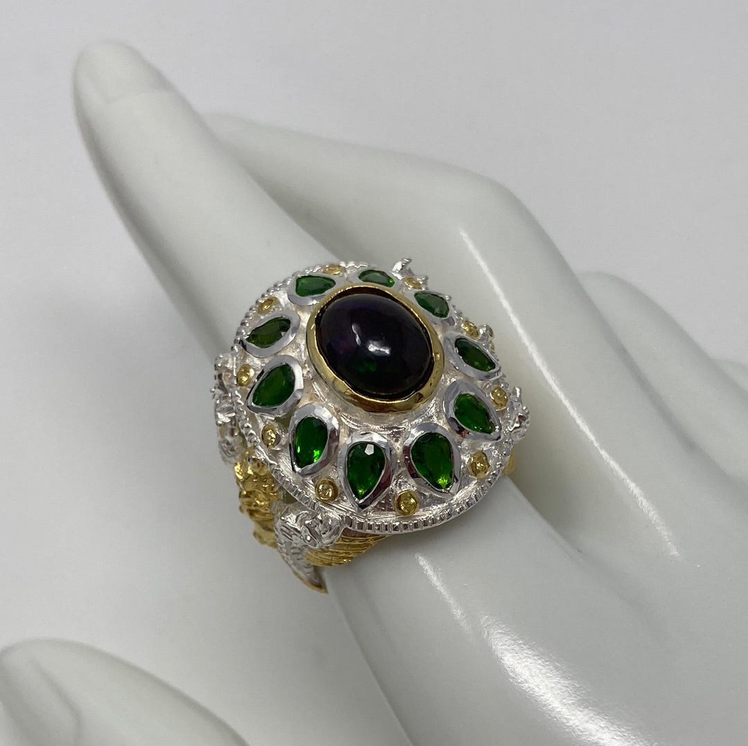 Crown Jewels, Genuine Black Opal & Russian Chrome Diopside Ring