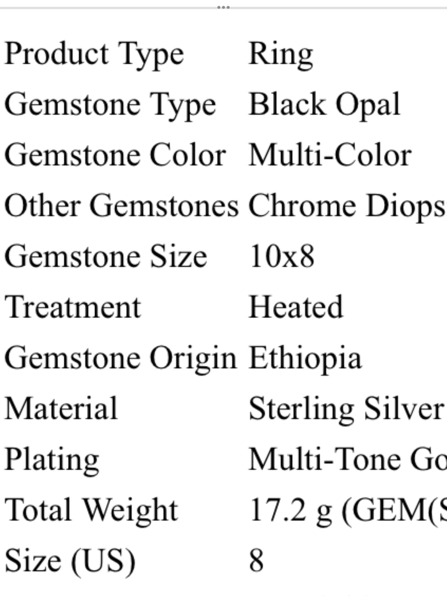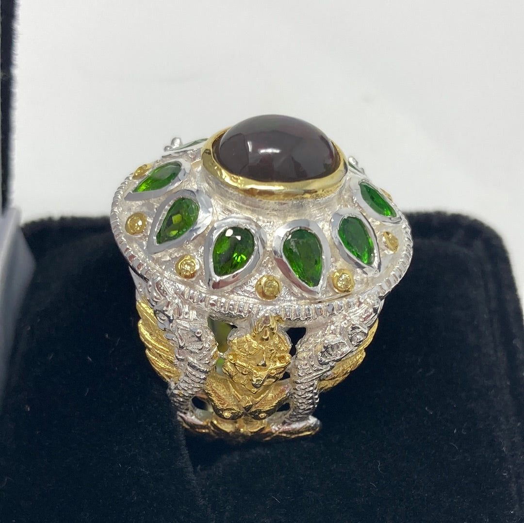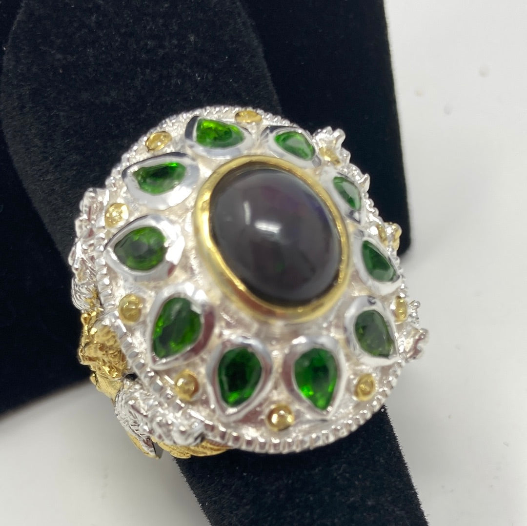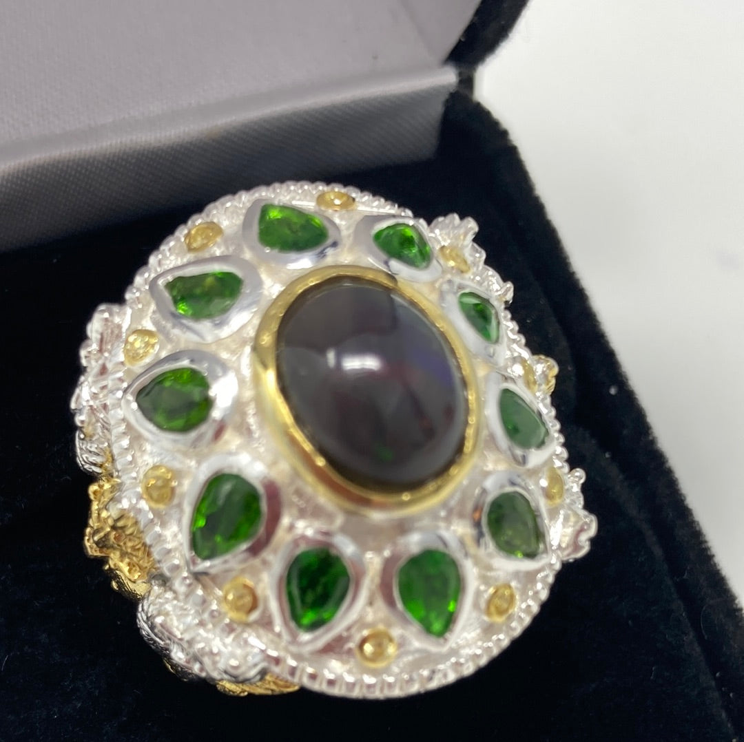 Wow, this looks like a museum piece, it is a one of a kind custom made ring fit for a queen! Notice the detailing also featuring and exquisite genuine 10mm by 8mm Black Opal and encrusted with fabulous and rare genuine Russian Chrome Diopsides in pear shaped faceting. This is a high quality setting, .925 sterling silver with a white and yellow gold overlay for durability and beauty. Invest in this outstanding piece for your forever collection. Size 8, Resize at your jeweler or use a ring guard.