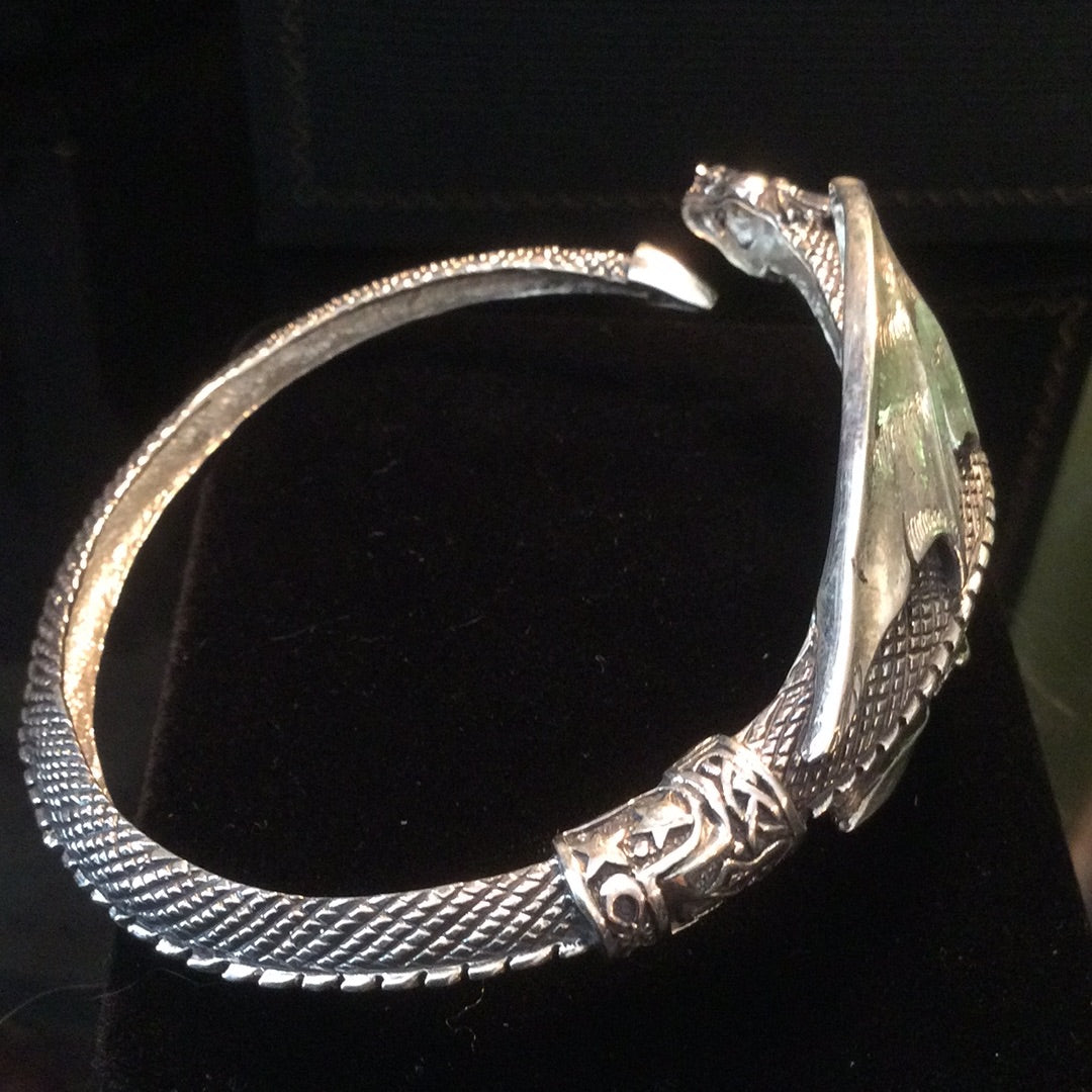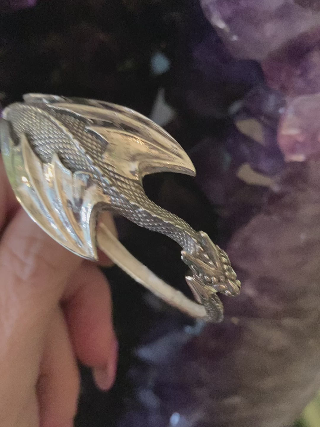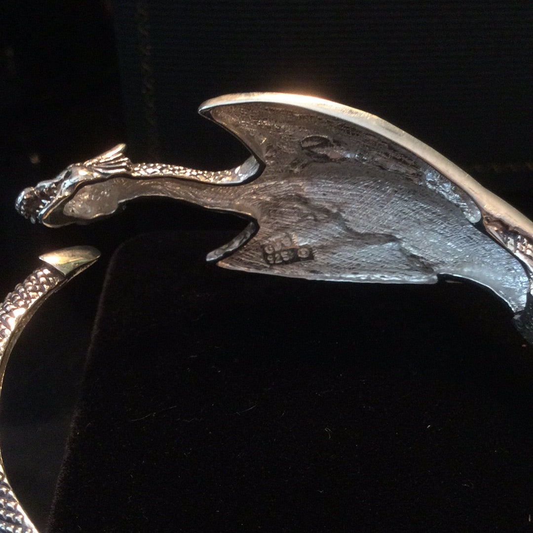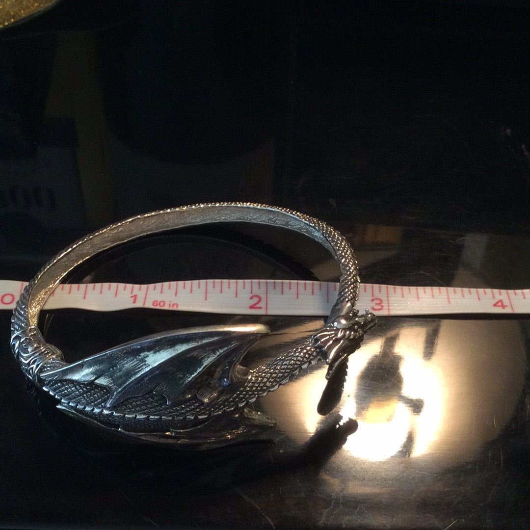 An unbelievable work of art, notice the intricate detains of the dragon, the engraving adds realistic dimension to this treasure. Spring loaded cuff, fits small through large wrists. This is a top quality unusual, once on a lifetime bracelet.