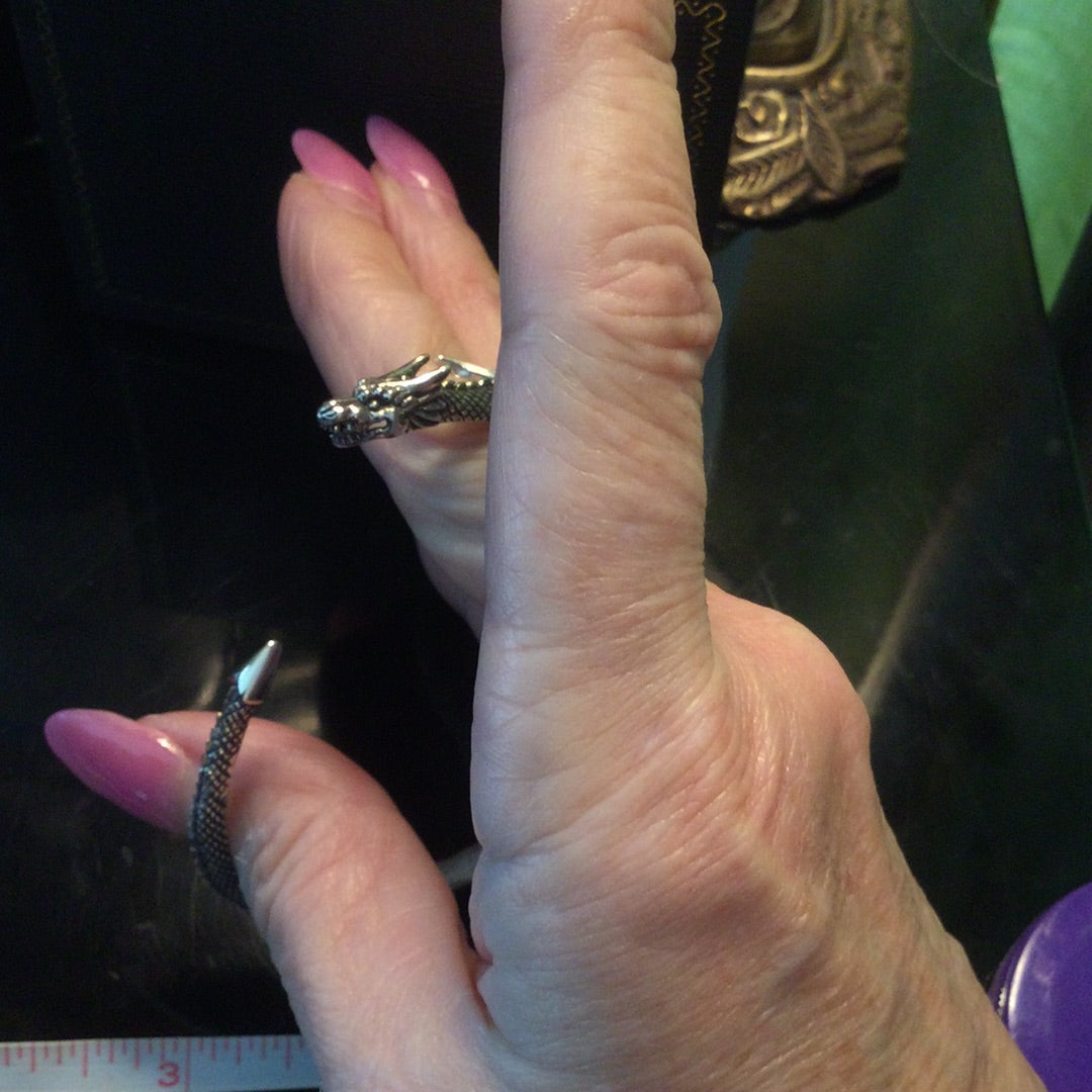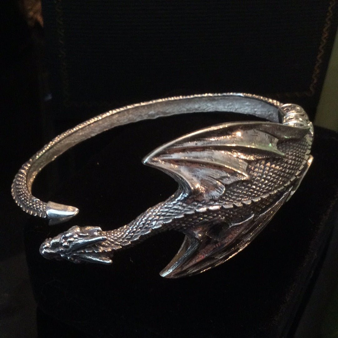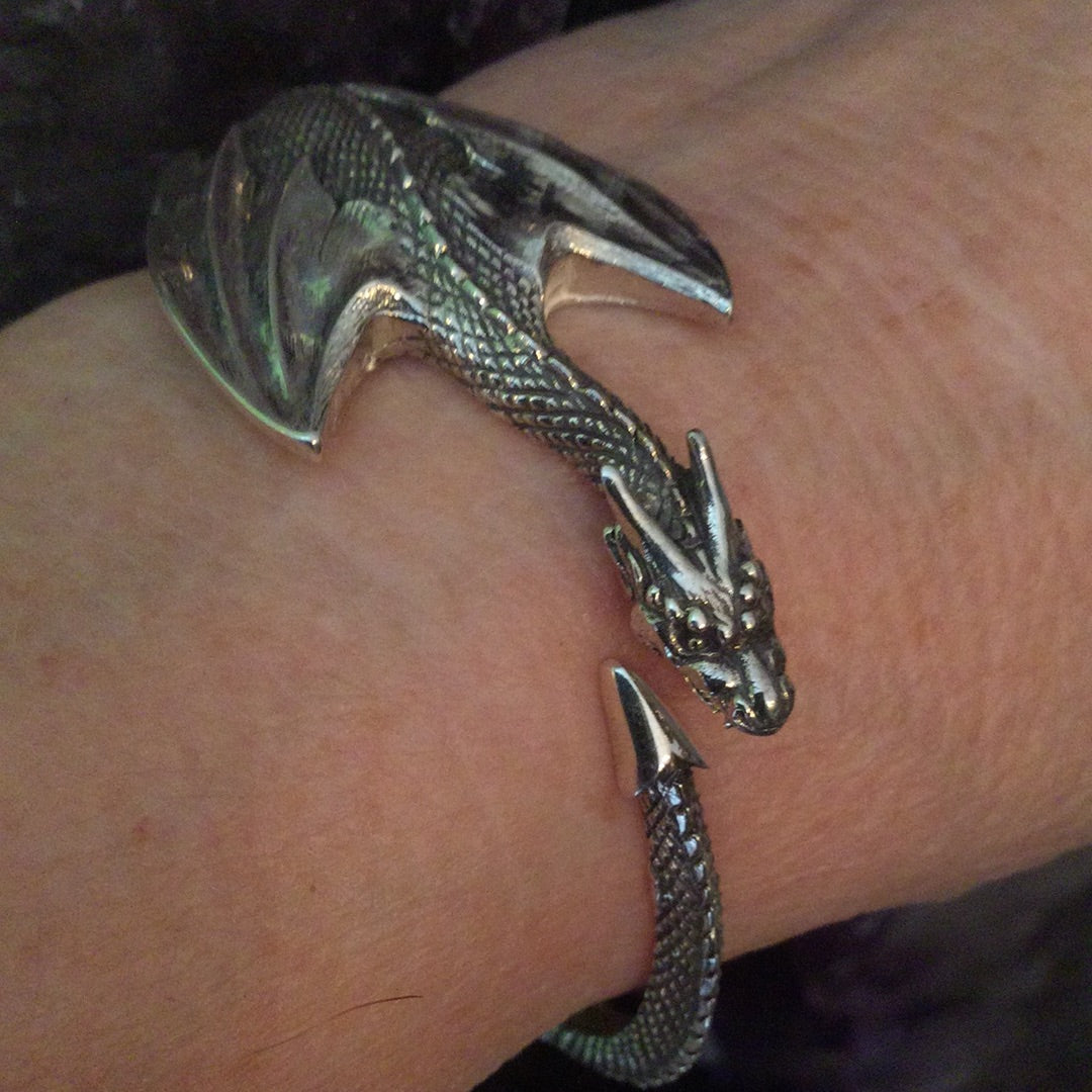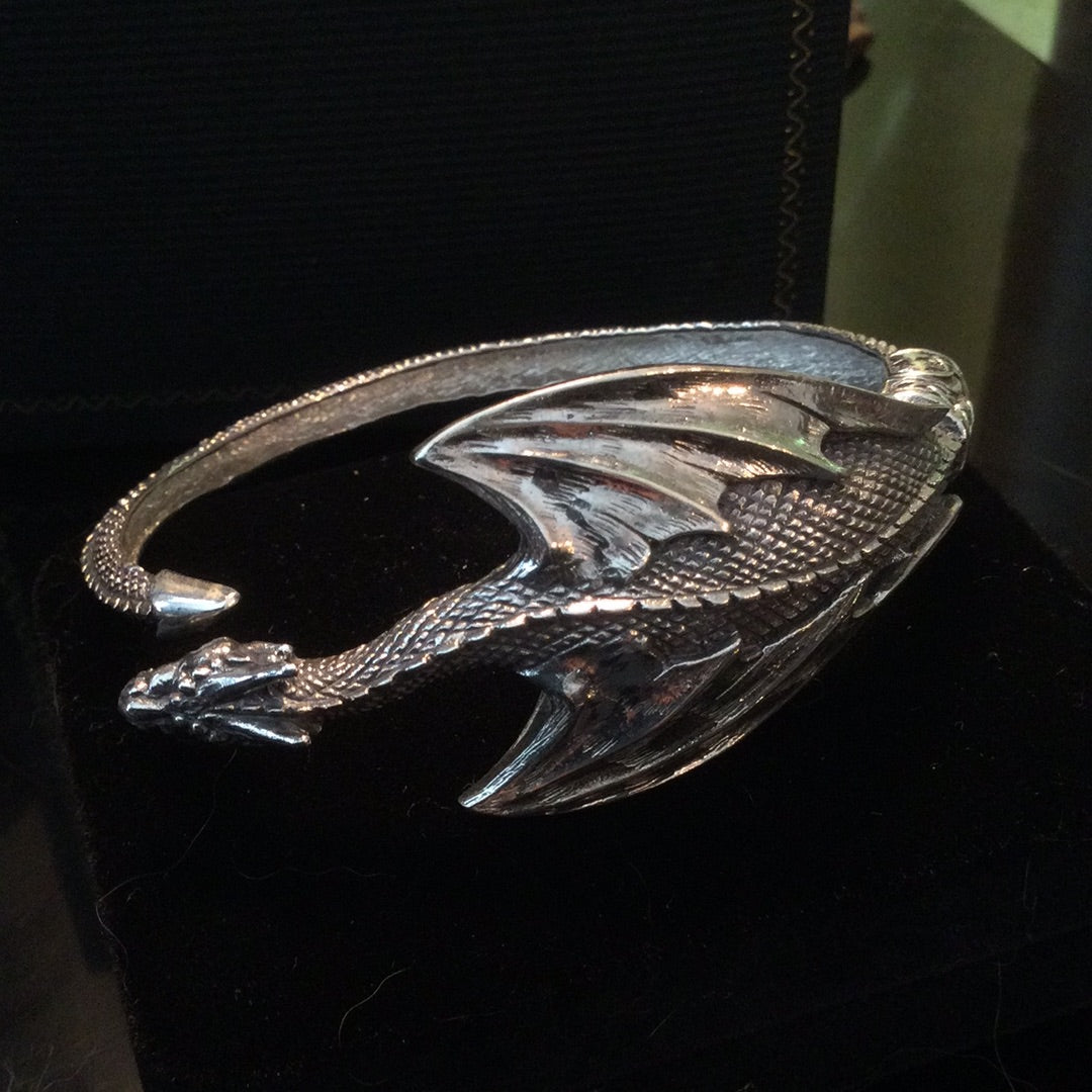 An unbelievable work of art, notice the intricate detains of the dragon, the engraving adds realistic dimension to this treasure. Spring loaded cuff, fits small through large wrists. This is a top quality unusual, once on a lifetime bracelet.