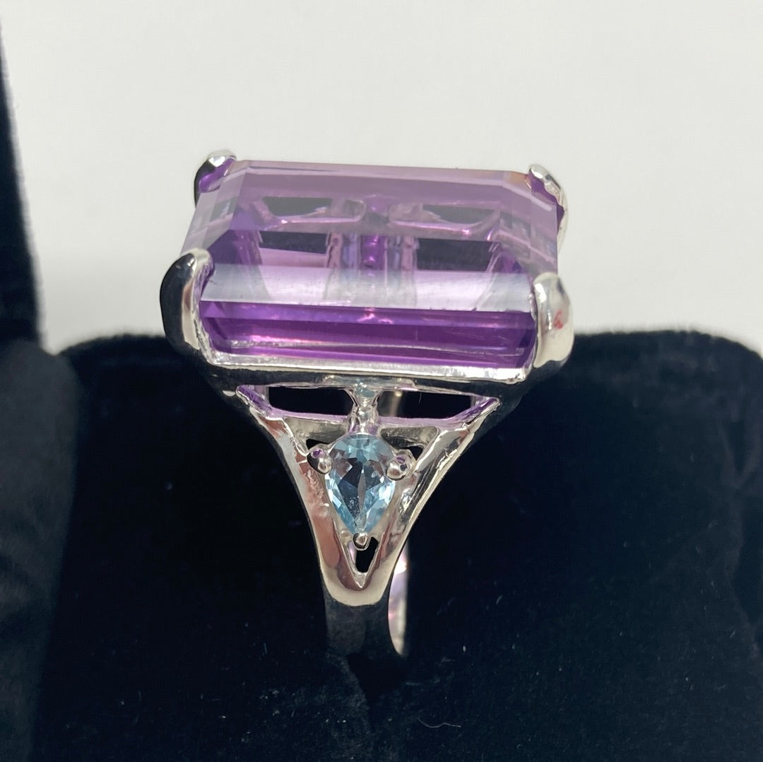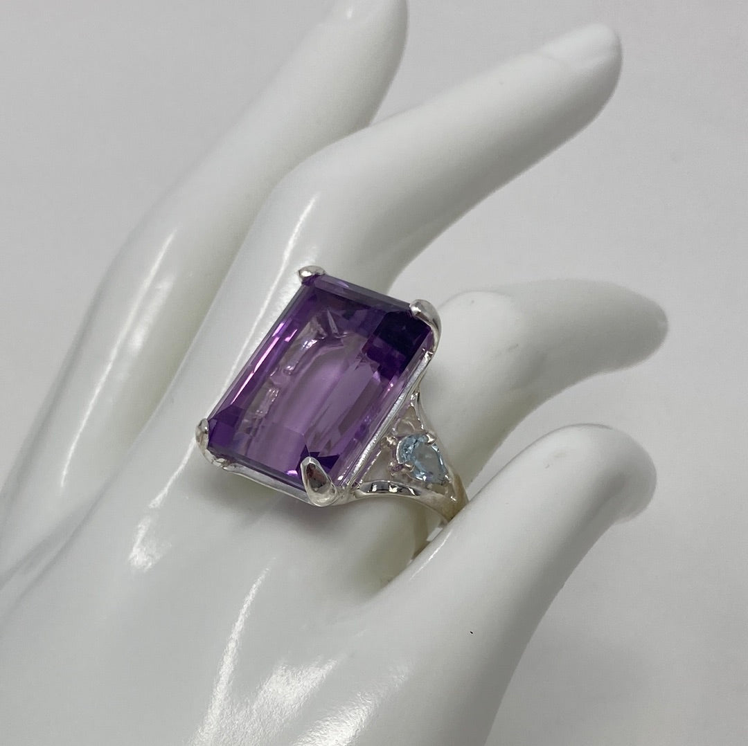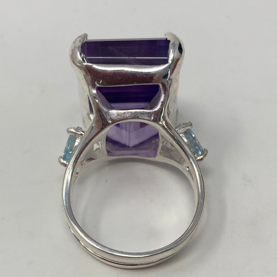 A fabulous 32 CTW Genuine Amethyst that has it all, cut, color and clarity in that highly desirable emerald cut. At one time in history Amethyst's we’re reserved for royalty. This ring is majestically elegant, super classy and looks like it cost a fortune. Flanked on each side by a Genuine Blue Topaz. Crafted in ,925 Sterling Silver, an investment for your future heirloom collection. Size 7 1/2, Resize at your local jeweler or use a ring guard