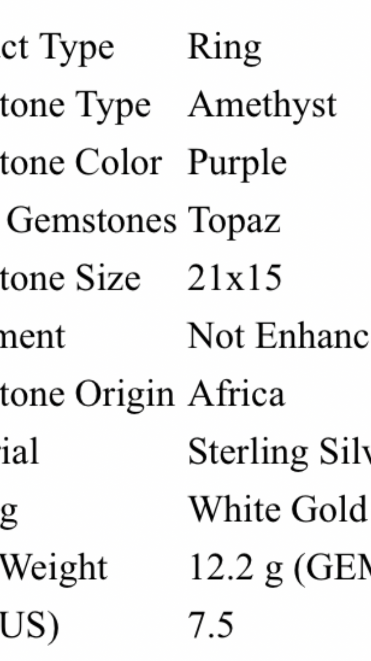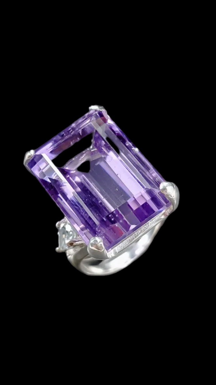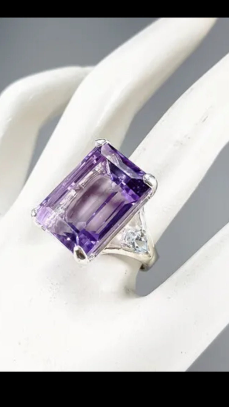 A fabulous 32 CTW Genuine Amethyst that has it all, cut, color and clarity in that highly desirable emerald cut. At one time in history Amethyst's we’re reserved for royalty. This ring is majestically elegant, super classy and looks like it cost a fortune. Flanked on each side by a Genuine Blue Topaz. Crafted in ,925 Sterling Silver, an investment for your future heirloom collection. Size 7 1/2, Resize at your local jeweler or use a ring guard