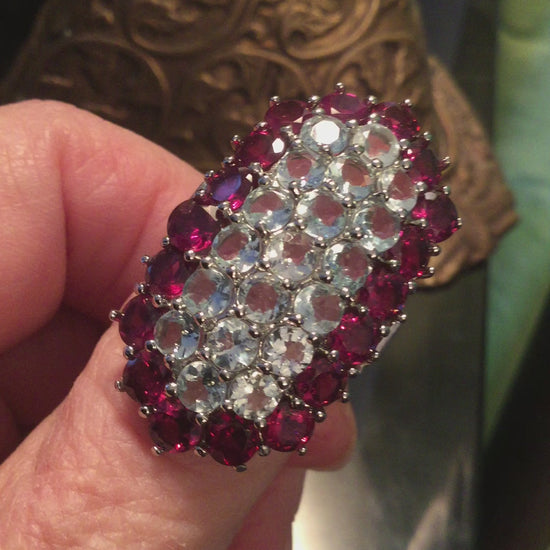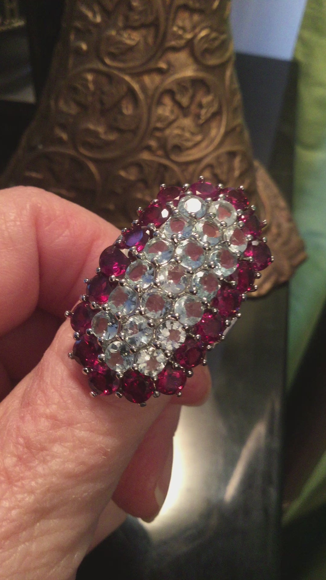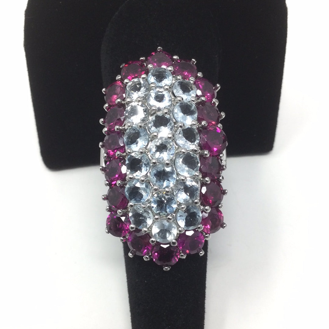 This genuine Aquamarine is a one of a kind custom made ring ! Set in .925 sterling silver with a 14K white gold overlay. Featuring 4.5mm faceted Aquamarines, surrounded by the finest Rhodolite Garnets, this ring can be resized at your jeweler or use with a ring guard for easy sizing. A strikingly unique look, invest in genuine gemstones. Size 8