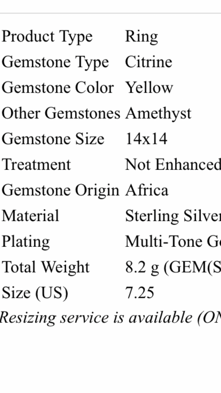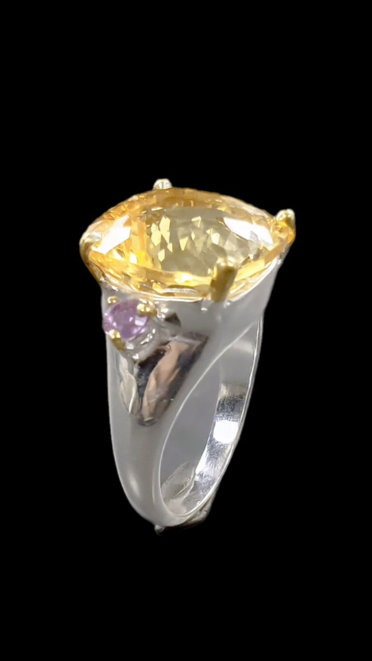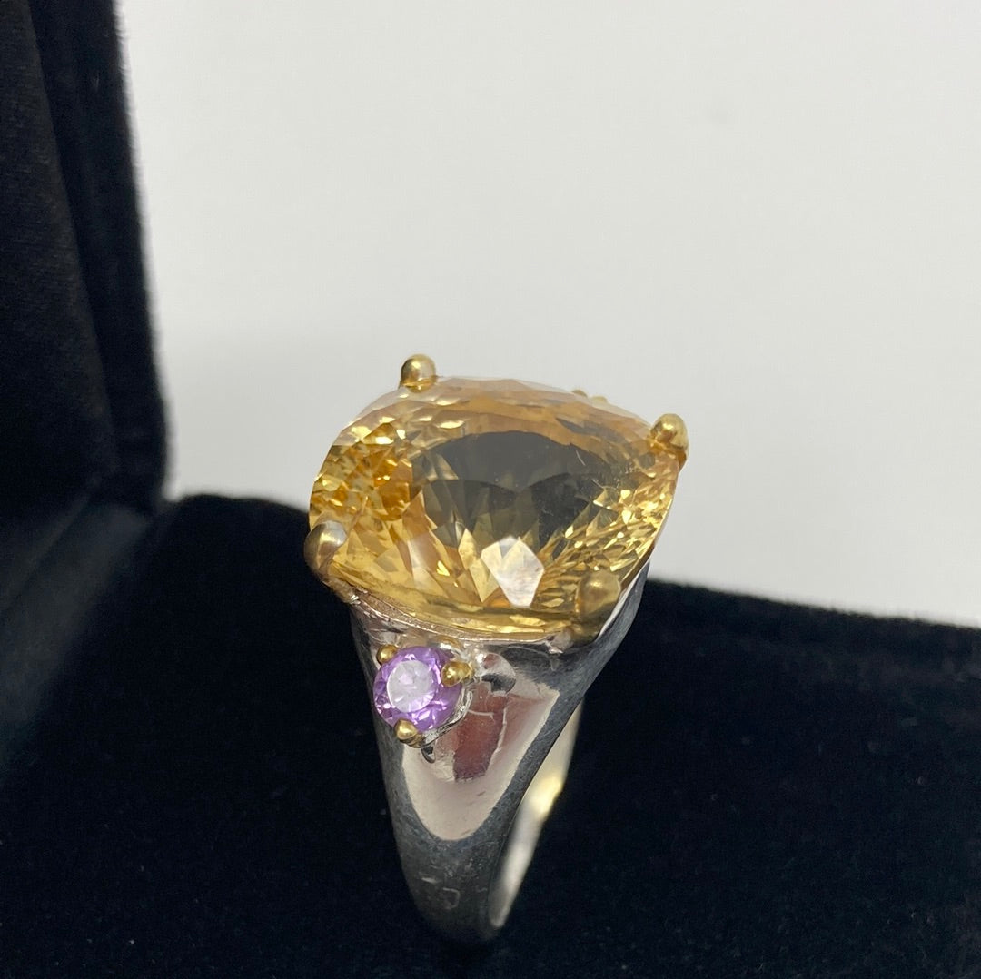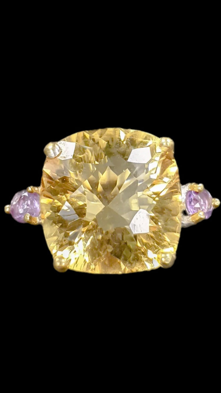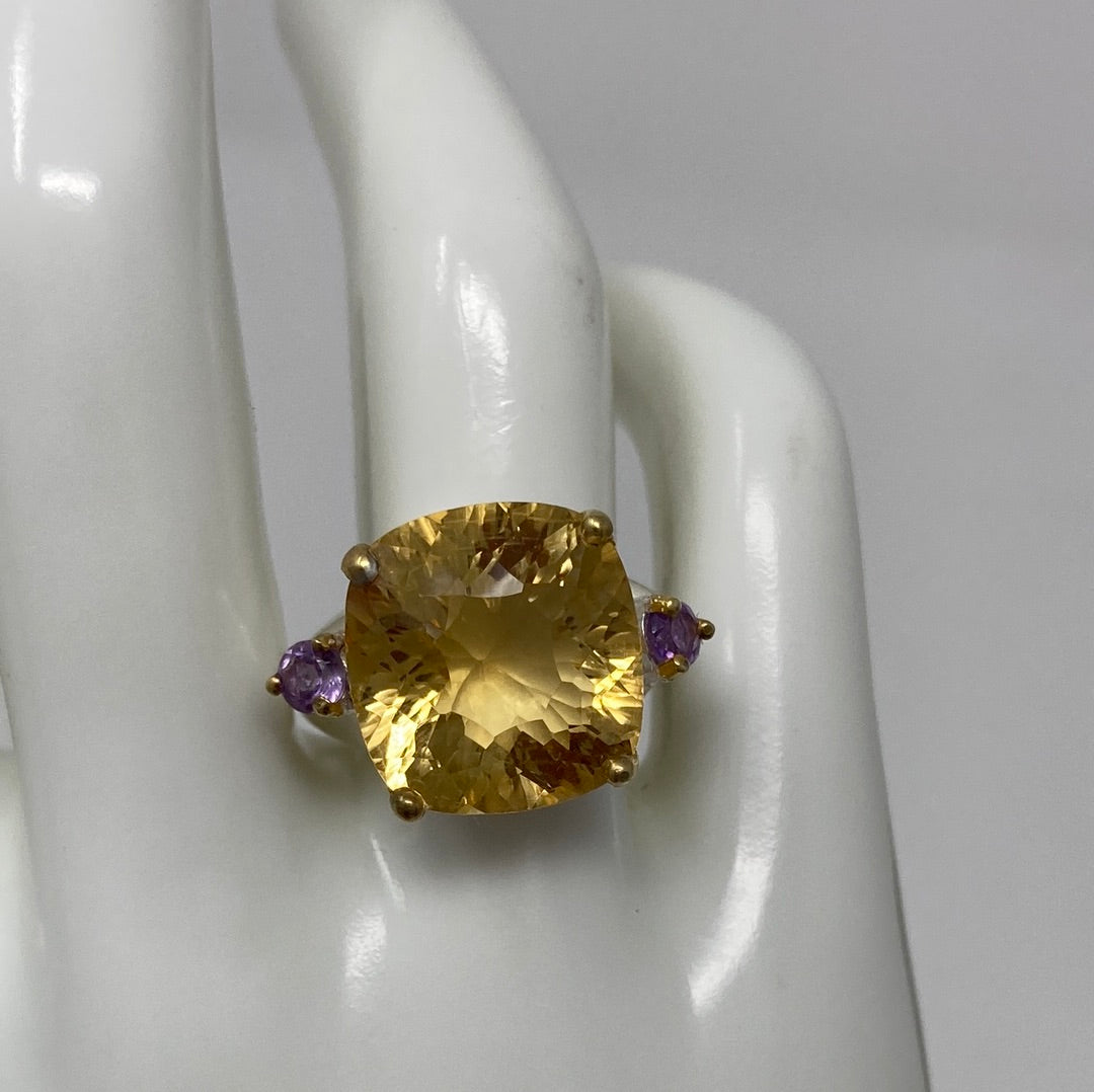 8 plus CTW in a fascinating genuine Citrine that measures 14mm by 14mm. The table of this exceptional gemstone draws the eye to a seemingly infinite burst of facets. A unique, one of a kind custom made ring especially for this specific gemstone. It is flanked on each side by a Genuine Amethyst, a work of art that is timeless. Set in .925 Sterling silver with a 14K yellow gold accents on the prongs. Super elevated look that is sheer elegance. Size 7 1/4, Resize at your jeweler