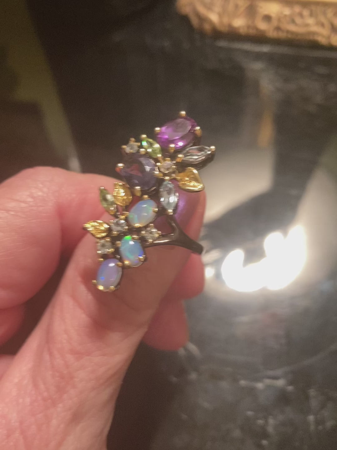 Seldom do I find a treasure full of gemstones in one outstanding work of art ring. All custom made, a one of a kind genuine gemstone ring featuring genuine Amethyst, Iolites, Topaz, Opals & Peridot. Notice the attention given to the details, marquee cut, Peridot and Topaz, outstanding, top quality Amethyst & Iolites along with accents of 14K yellow gold. Top shelf ring at an affordable price, wear a work of art because you are too! Size 8, Resize at your jeweler.