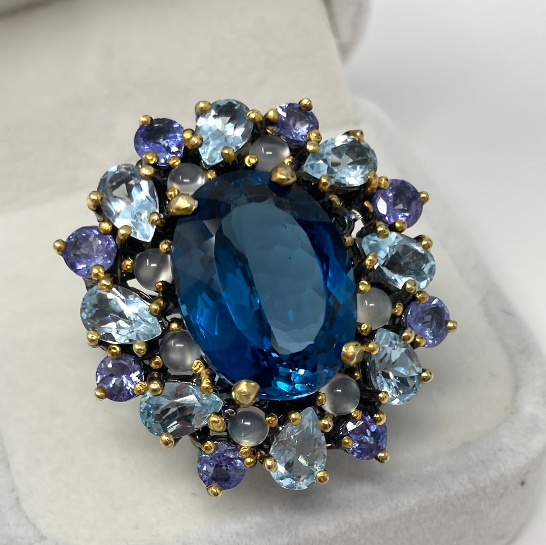 Simply a vision reminiscent of a starry night, this ring features a large exquisite 17mm by 13mm London Blue Topaz surrounded by pear shaped Aquamarines, round Tanzanite and Moonstones. A celestial celebration of genuine gemstones in this custom made, one of a kind masterpiece. Set in .925 Sterling Silver with a Rhodium overlay and yellow gold accented prongs. This ring represents outstanding splendor, a true treasure for your gemstone collection. Size 9, Resize at your jeweler or use a ring guard.
