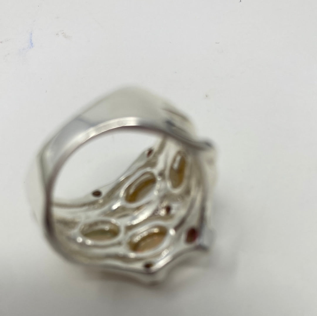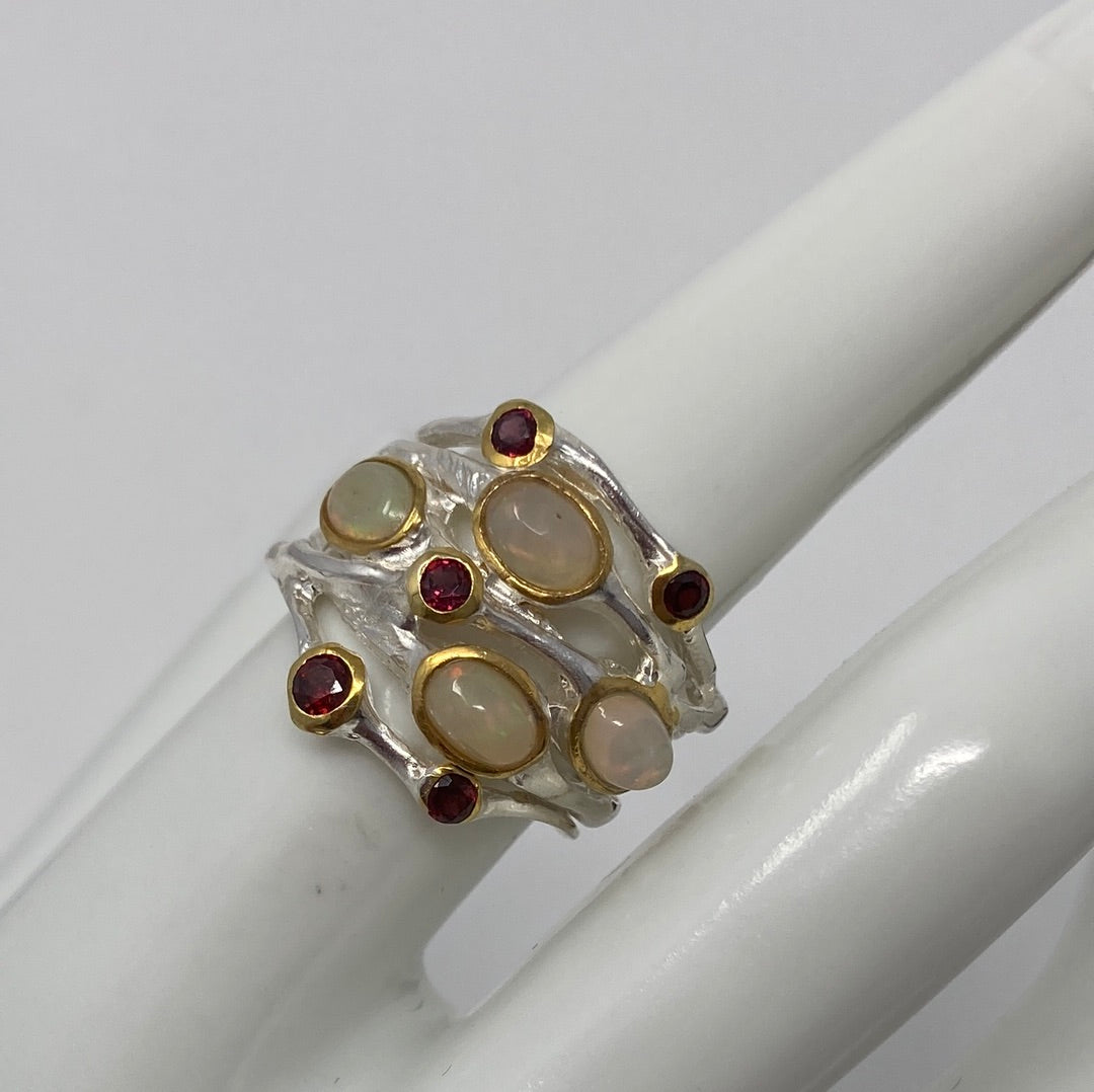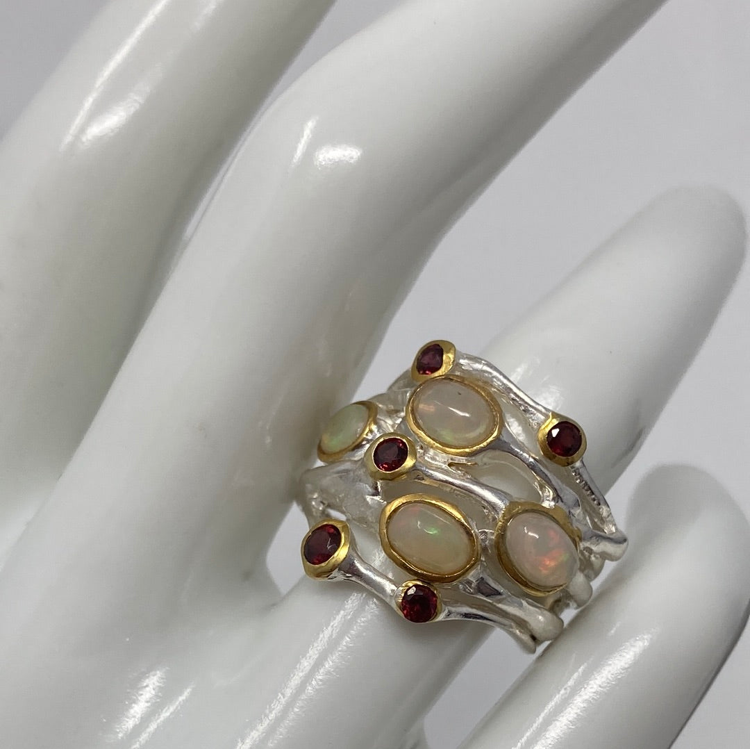This ring features four genuine Fiery Opals kissed with genuine Garnets too. All hand crafted, one of a kind crafted in .925 sterling silver with a white and yellow gold overlay. These wider band rings are cleverly classy, notice the attention to details in this beauty. Add this to your forever collection of genuine gemstone jewelry. Size 6 3/4