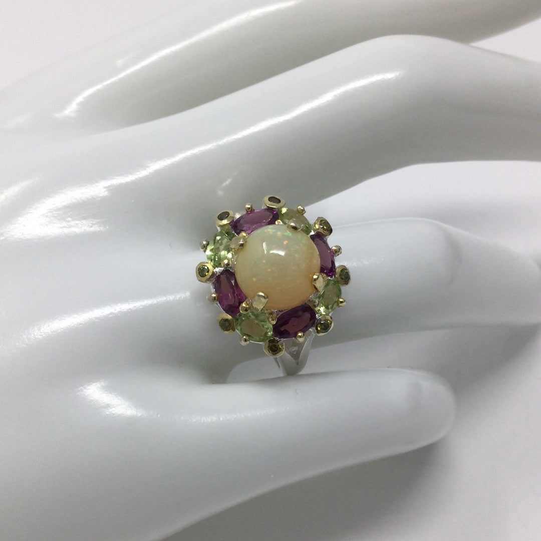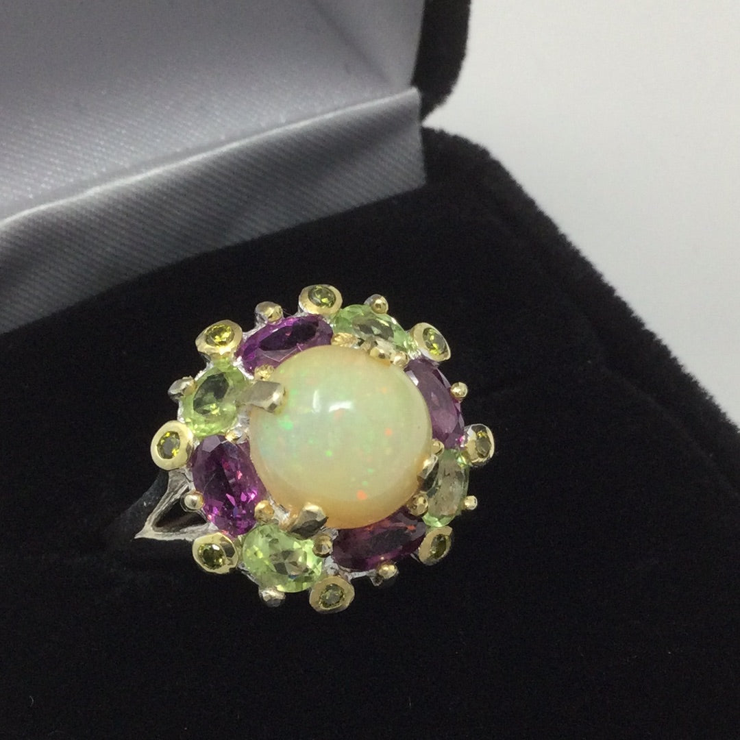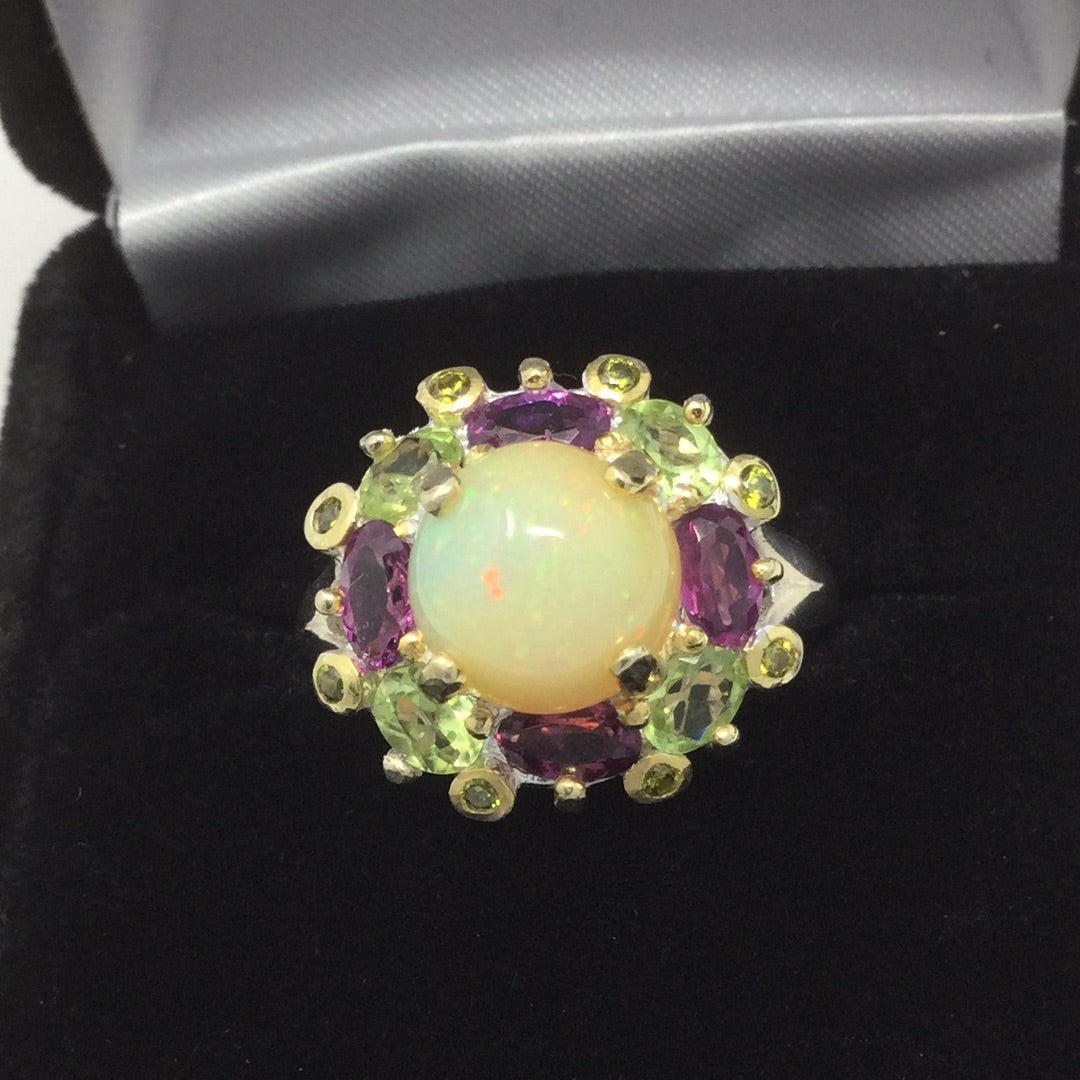Wow, this is a fabulous 9mm by 9mm genuine fiery Opal that is a sight for sore eyes! Surrounded by genuine Peridot and Rhodolite Garnets exquisite. This naturel gemstone was hand selected for this one of a kind, custom designed ring. Crafted in .925 sterling silver with a Rhodium overlay for durability and beauty. Size 7 1/4, Resize at your jeweler.