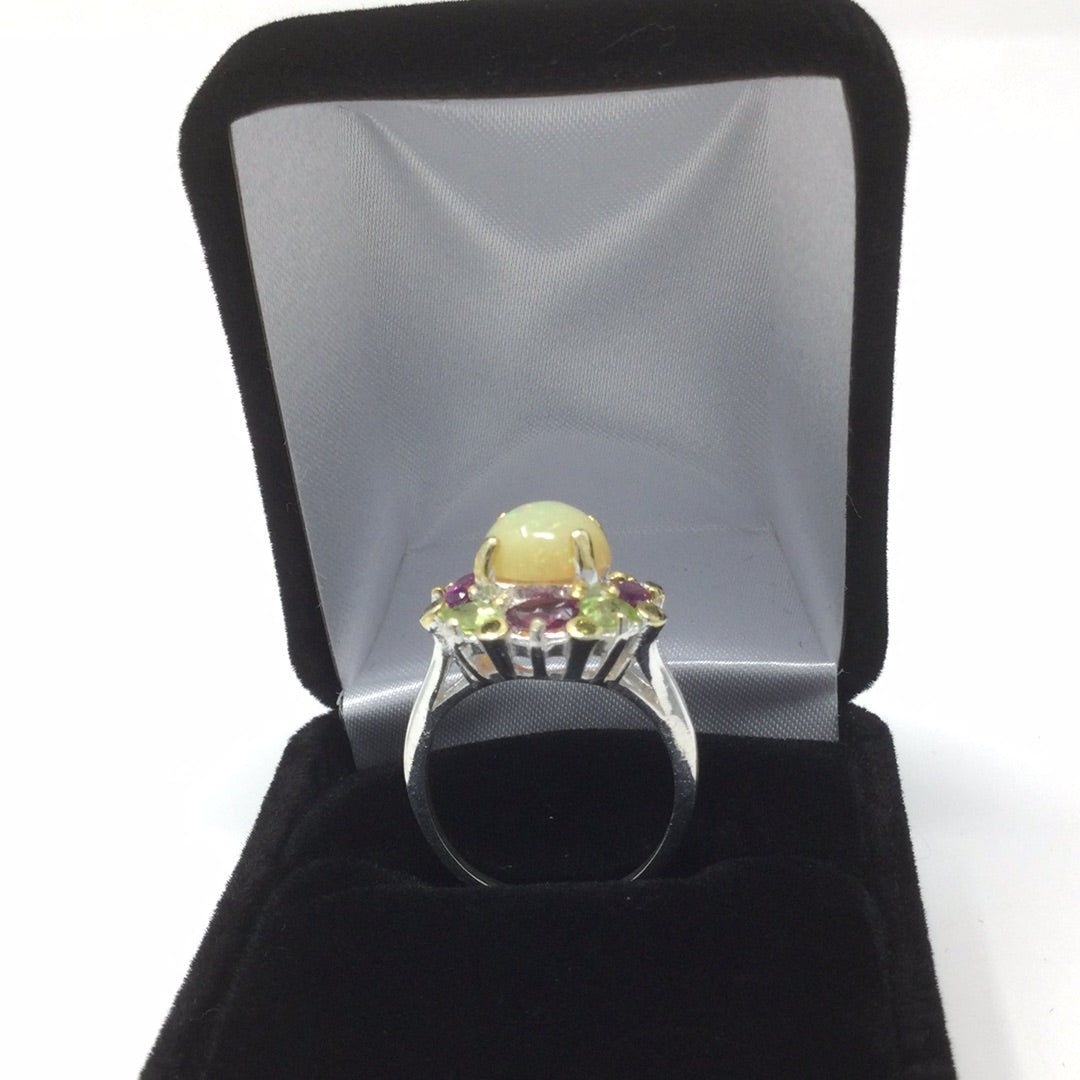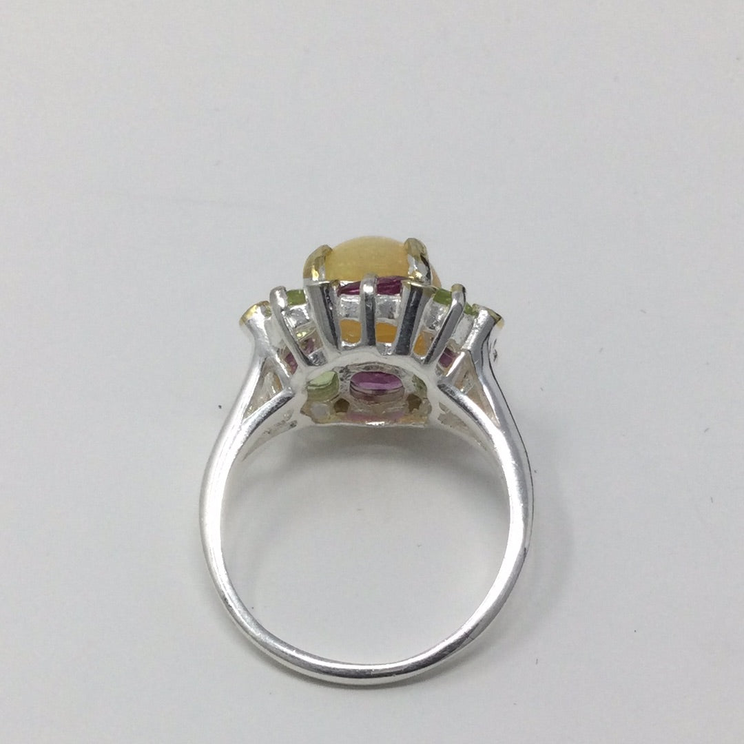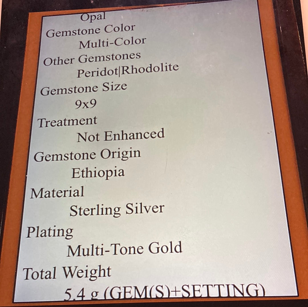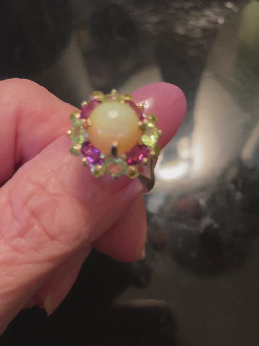 Wow, this is a fabulous 9mm by 9mm genuine fiery Opal that is a sight for sore eyes! Surrounded by genuine Peridot and Rhodolite Garnets exquisite. This naturel gemstone was hand selected for this one of a kind, custom designed ring. Crafted in .925 sterling silver with a Rhodium overlay for durability and beauty. Size 7 1/4, Resize at your jeweler.