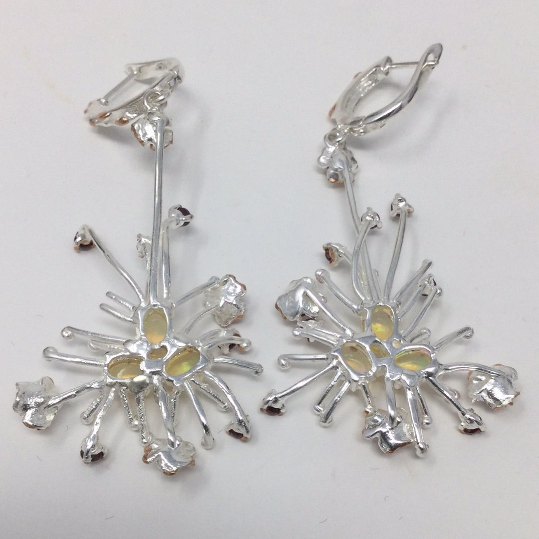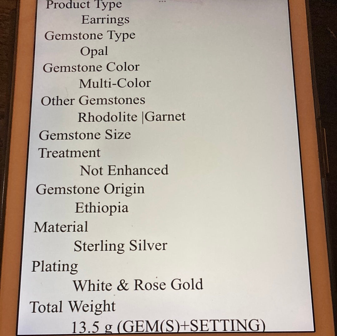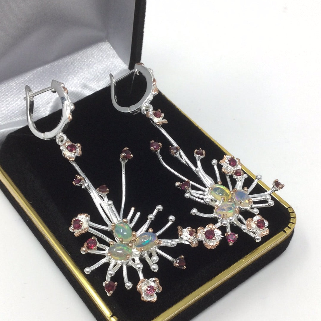 An artistic, a salute to the celestial universe, this galaxy of opals features genuine fiery Opals that seem to explode with genuine garnets as shooting stars! A real creative, one of a kind, custom made earrings, using the finest hand selected gemstones. Crafted in sterling silver with a 14K white gold overlay and accents of rose gold. Approximately 2” long.