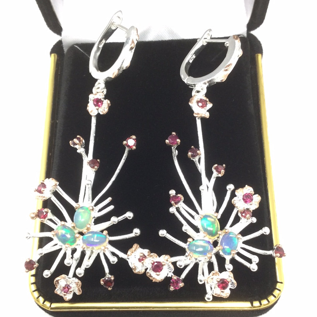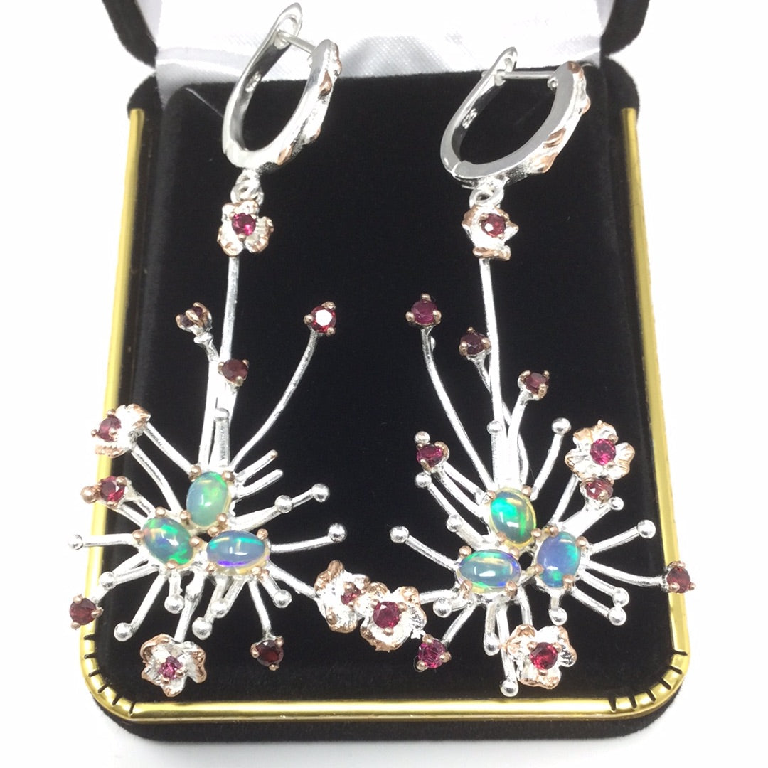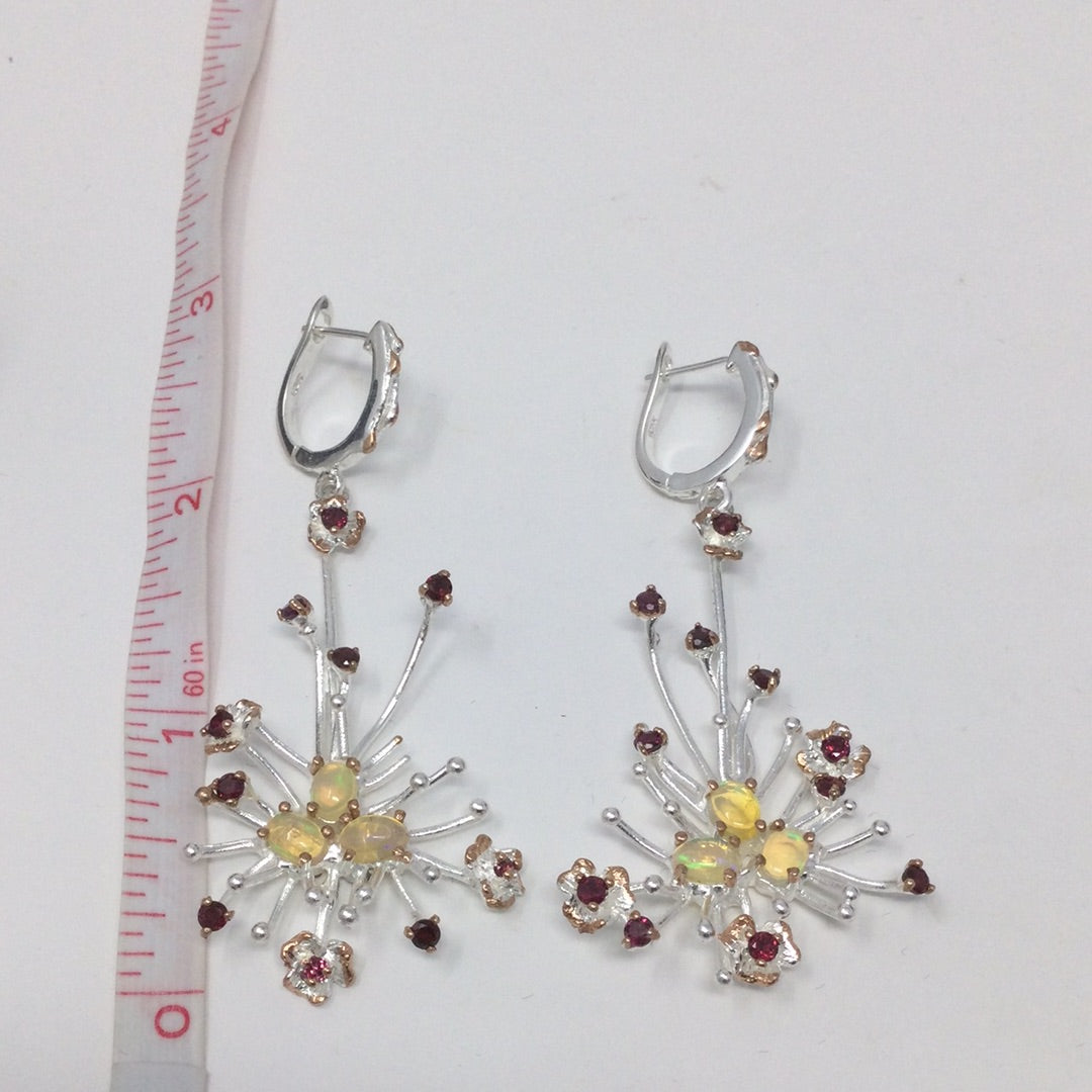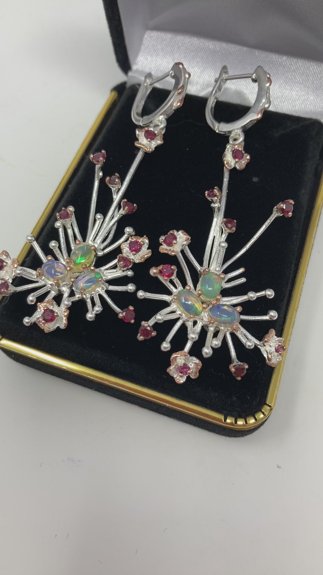An artistic, a salute to the celestial universe, this galaxy of opals features genuine fiery Opals that seem to explode with genuine garnets as shooting stars! A real creative, one of a kind, custom made earrings, using the finest hand selected gemstones. Crafted in sterling silver with a 14K white gold overlay and accents of rose gold. Approximately 2” long.