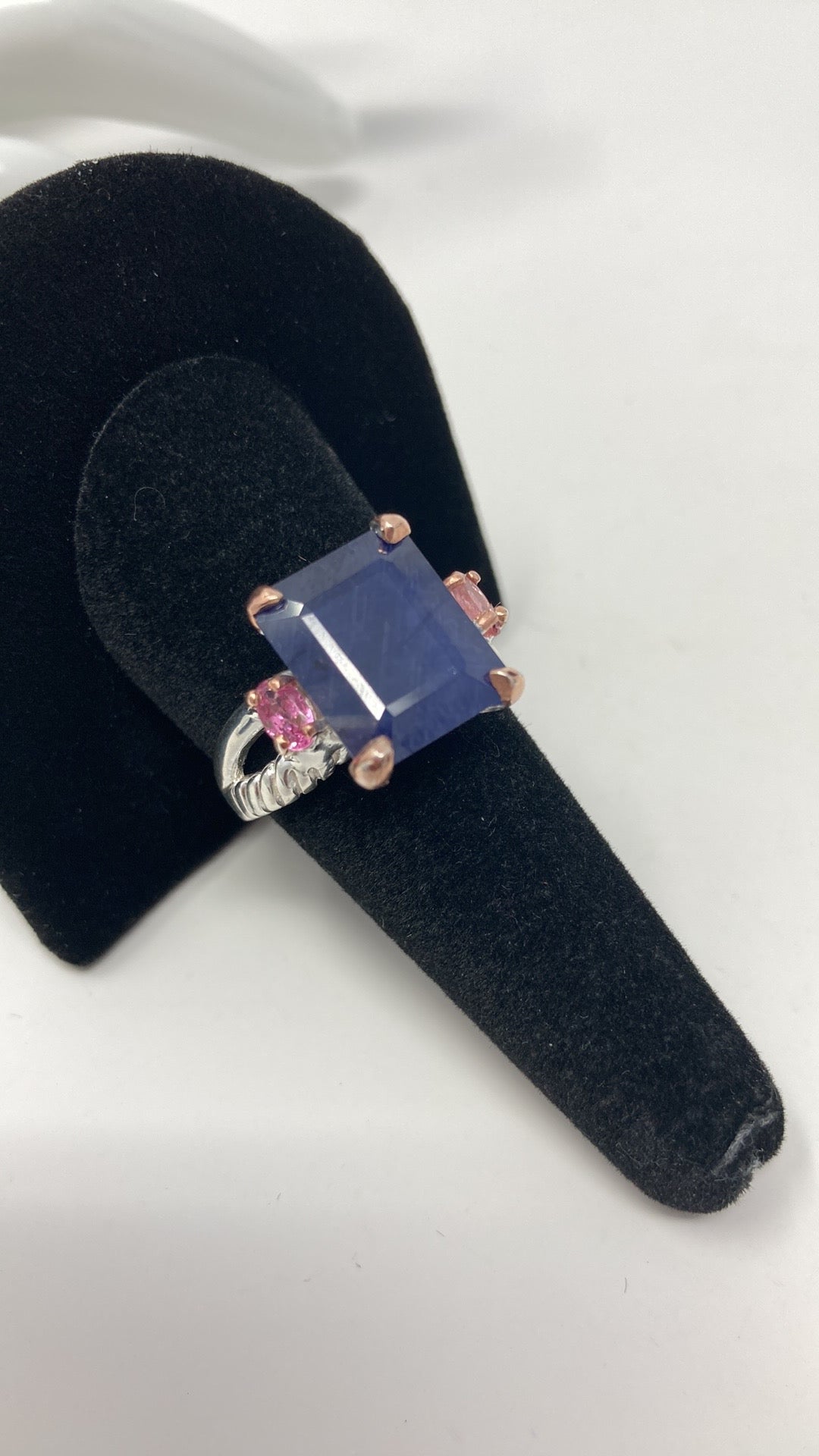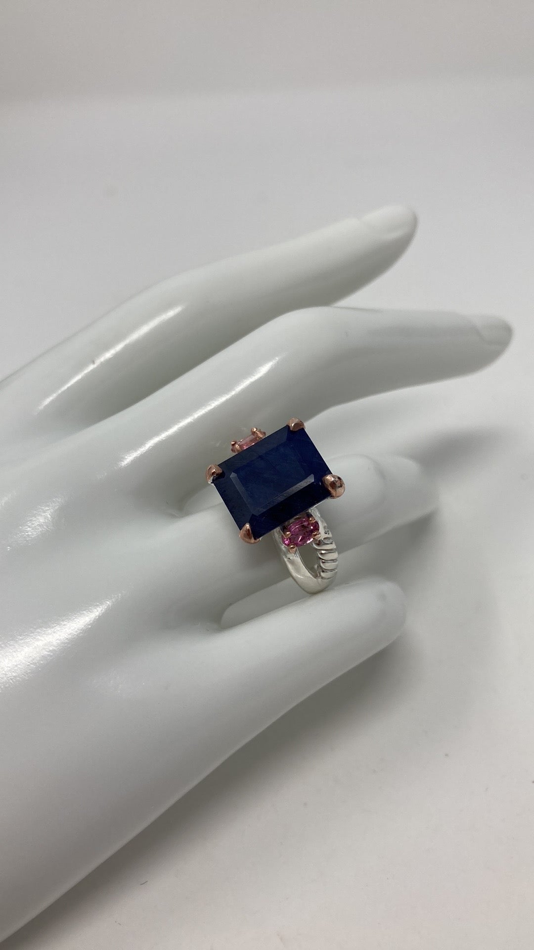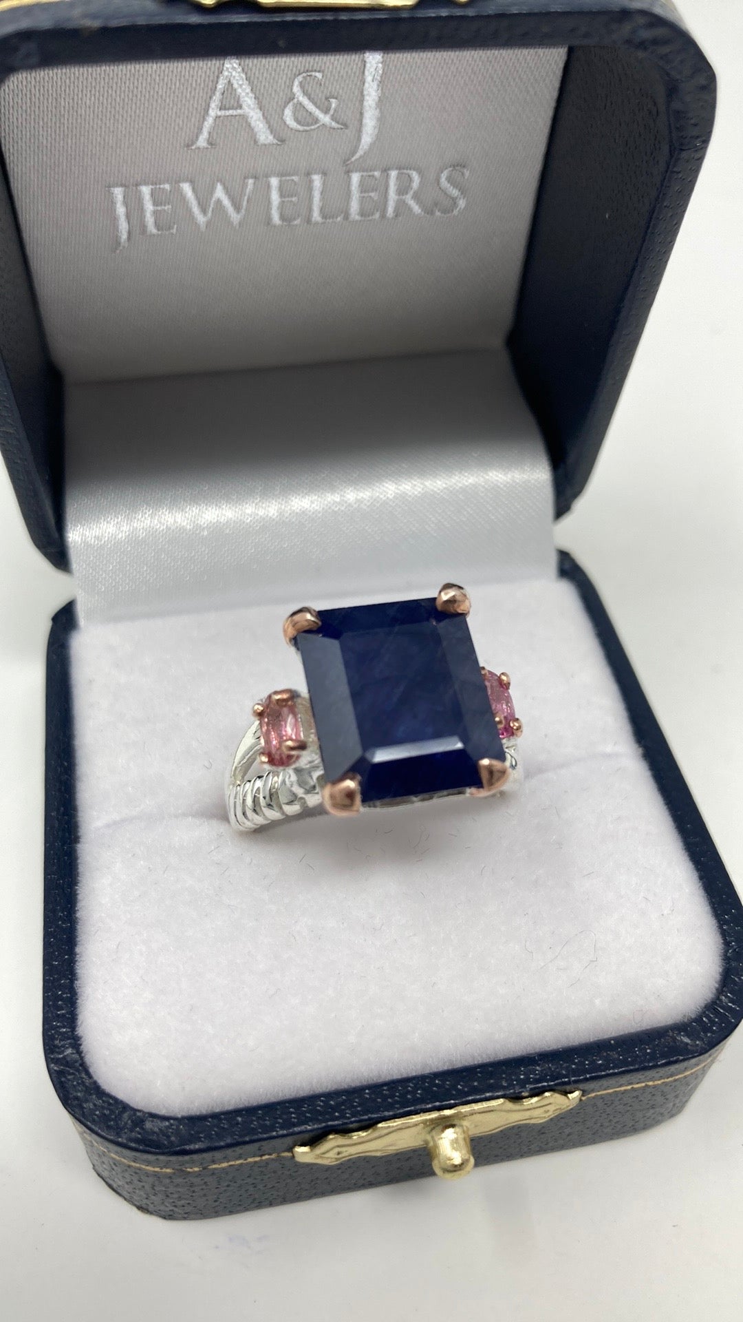 A very desirable, one of a kind 12 CTW genuine Sapphire in a highly desirable faceted emerald cut. The demand is high for an emerald cut but not readily available especially in this size. Flanked by genuine Pink Tourmalines, slightly offset for a artistic, art moderne look. Pink Tourmalines are also becoming rare, this ring was custom made for these hand selected exceptional genuine gemstones. Set in .925 sterling silver with a 14K white gold overlay. It’s a one of a kind, created by my curated artisans that produce unique, one of a kind pieces. Size 8 3/4, Resize at your jeweler or use a ring guard.