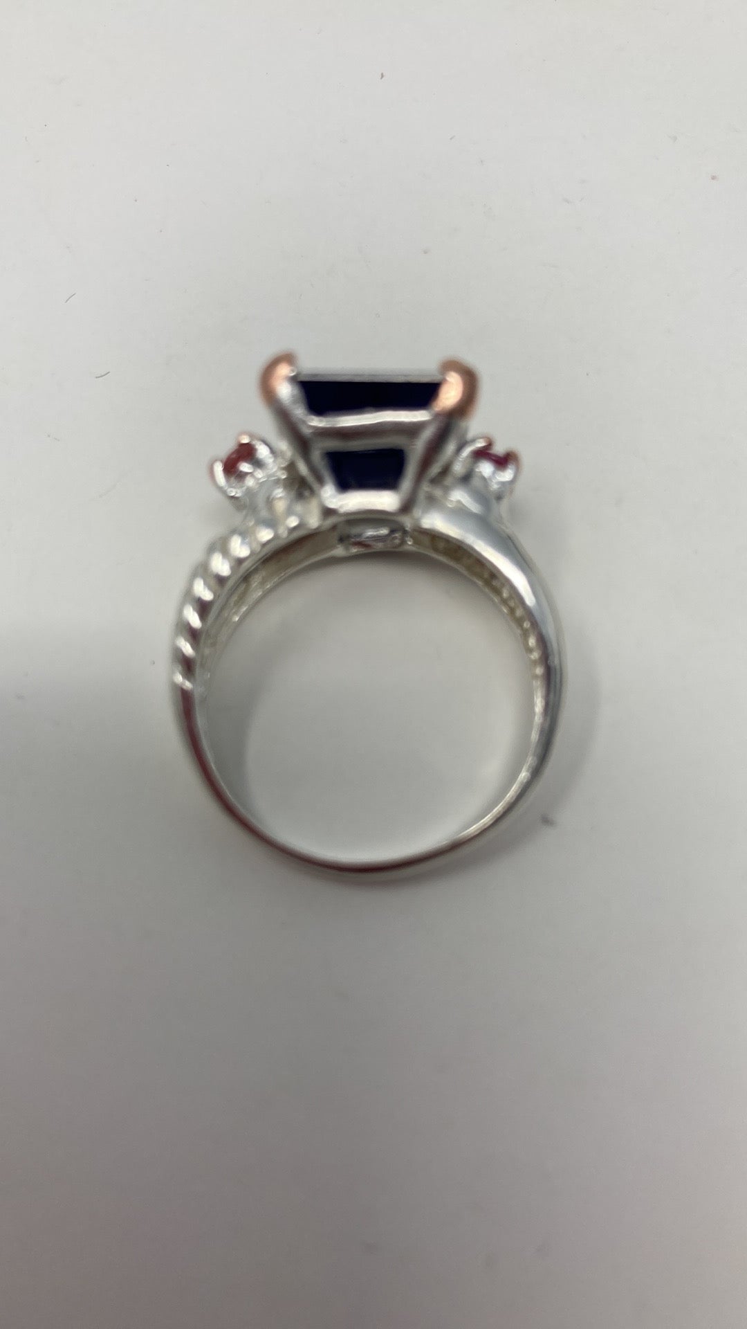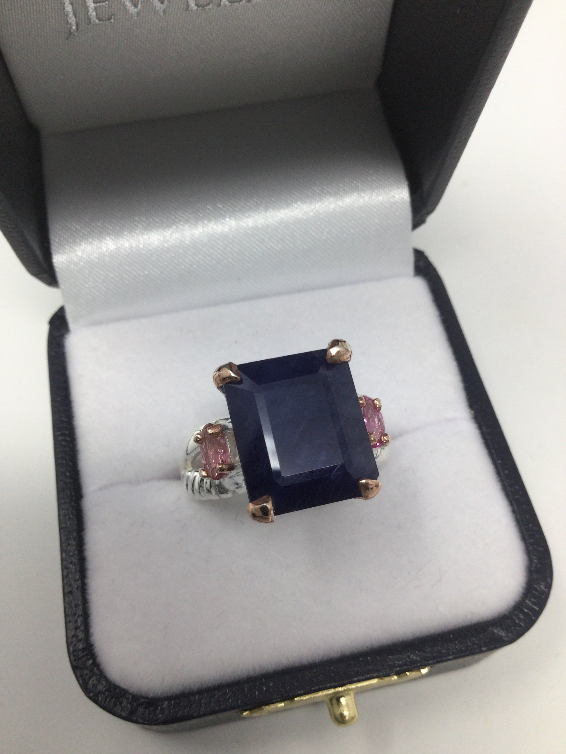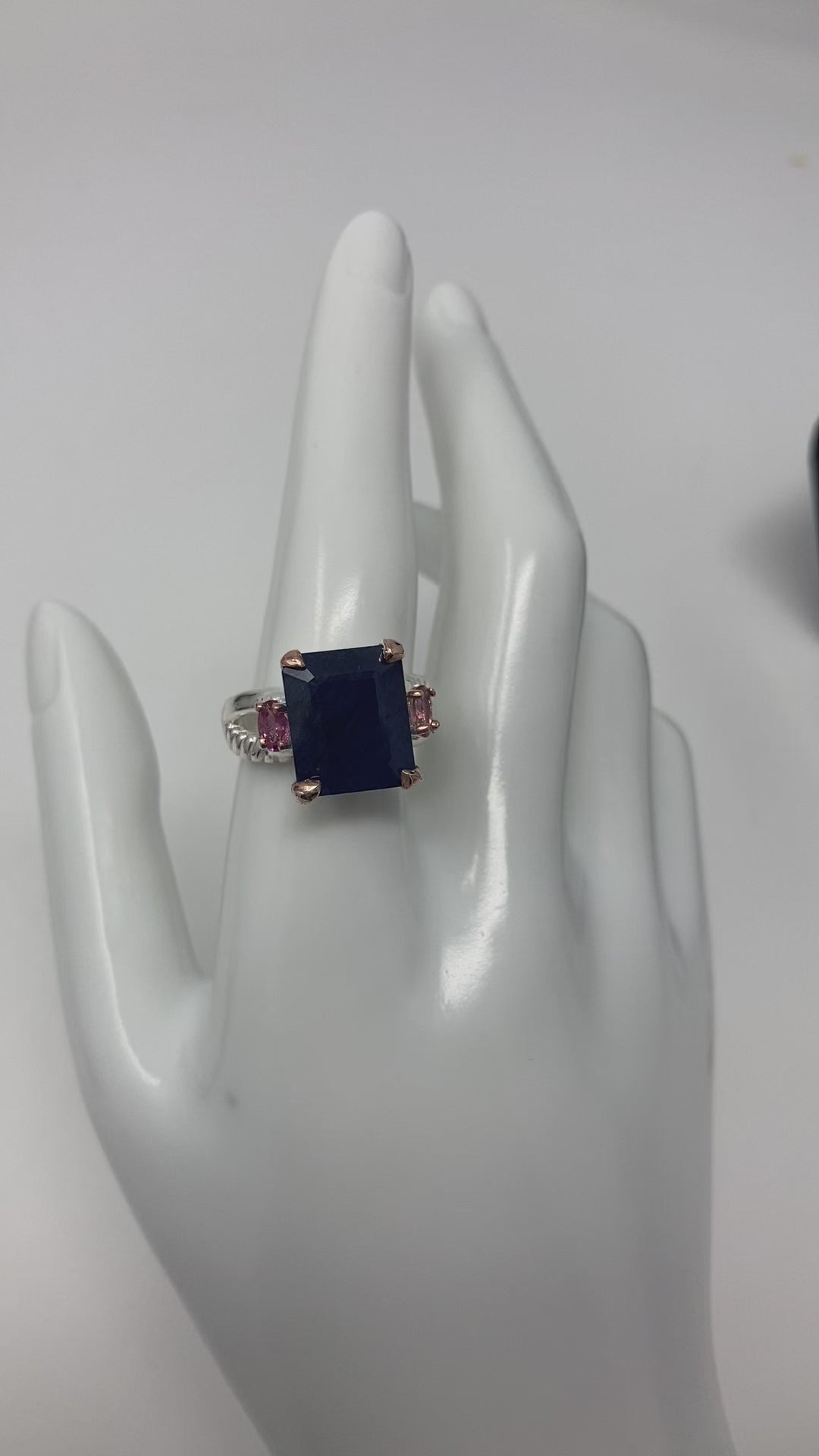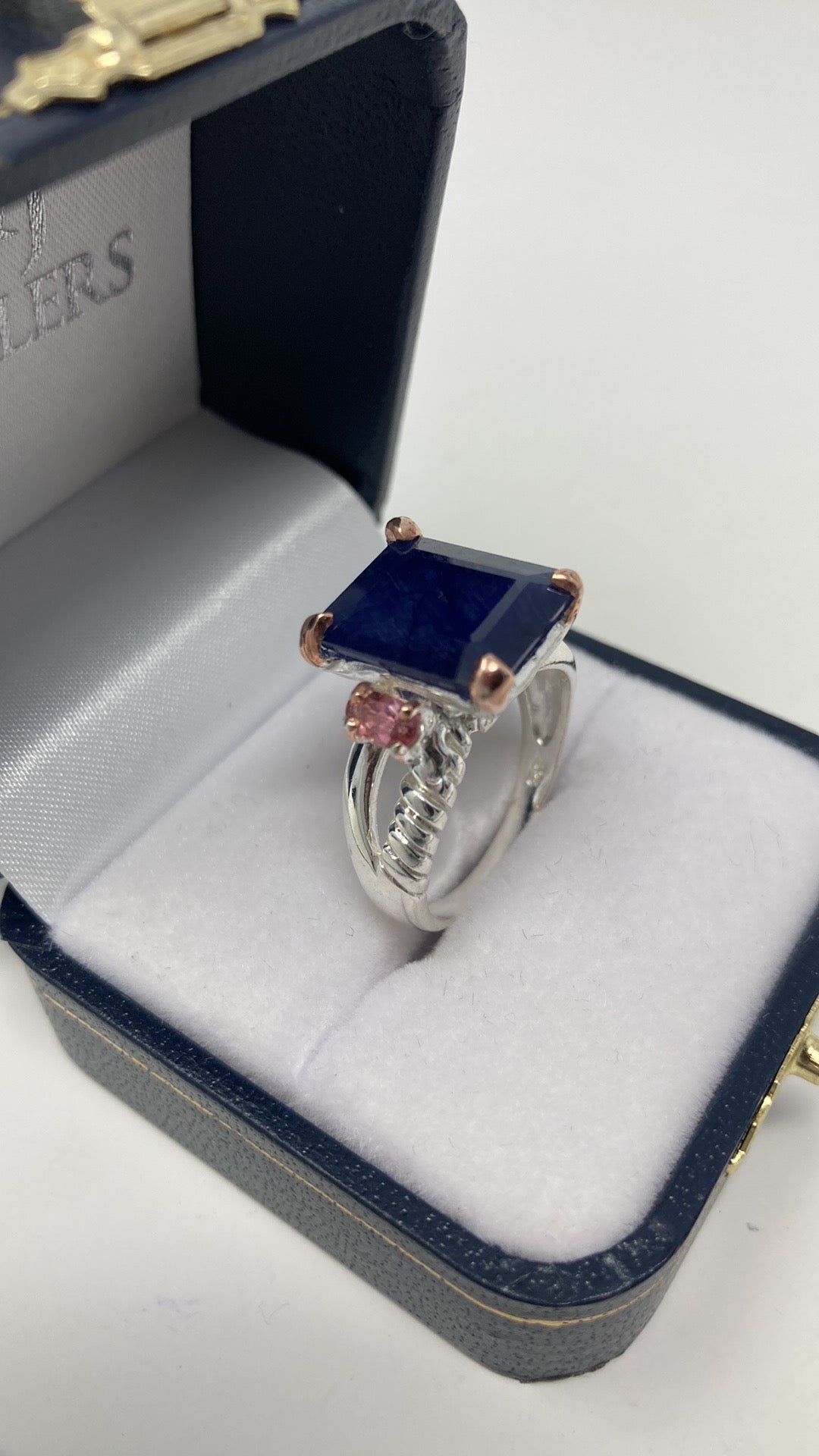 A very desirable, one of a kind 12 CTW genuine Sapphire in a highly desirable faceted emerald cut. The demand is high for an emerald cut but not readily available especially in this size. Flanked by genuine Pink Tourmalines, slightly offset for a artistic, art moderne look. Pink Tourmalines are also becoming rare, this ring was custom made for these hand selected exceptional genuine gemstones. Set in .925 sterling silver with a 14K white gold overlay. It’s a one of a kind, created by my curated artisans that produce unique, one of a kind pieces. Size 8 3/4, Resize at your jeweler or use a ring guard.
