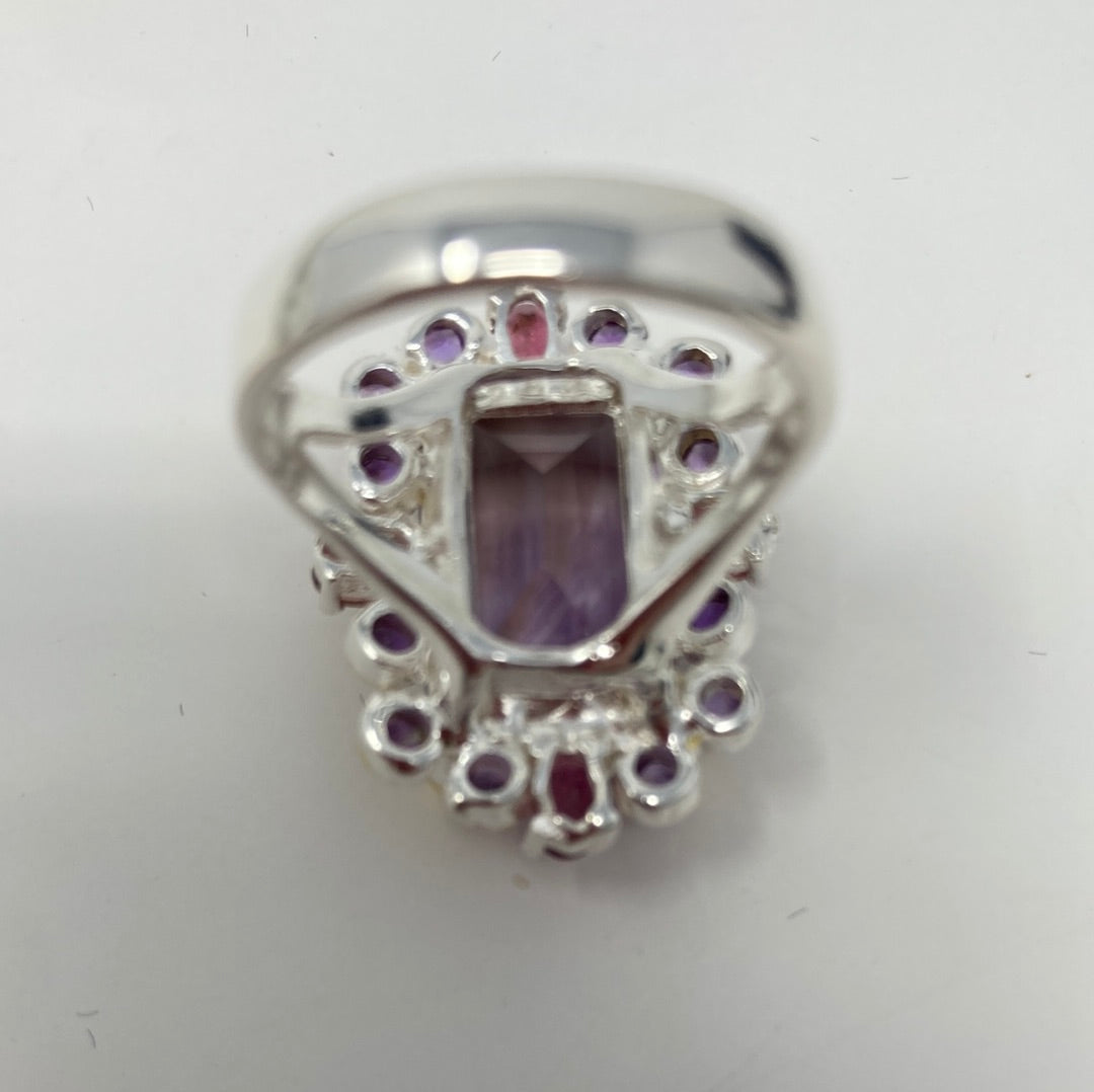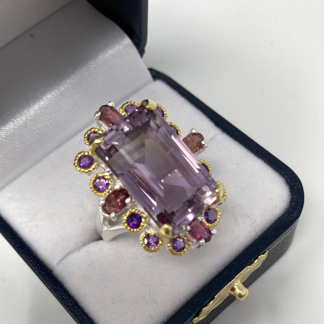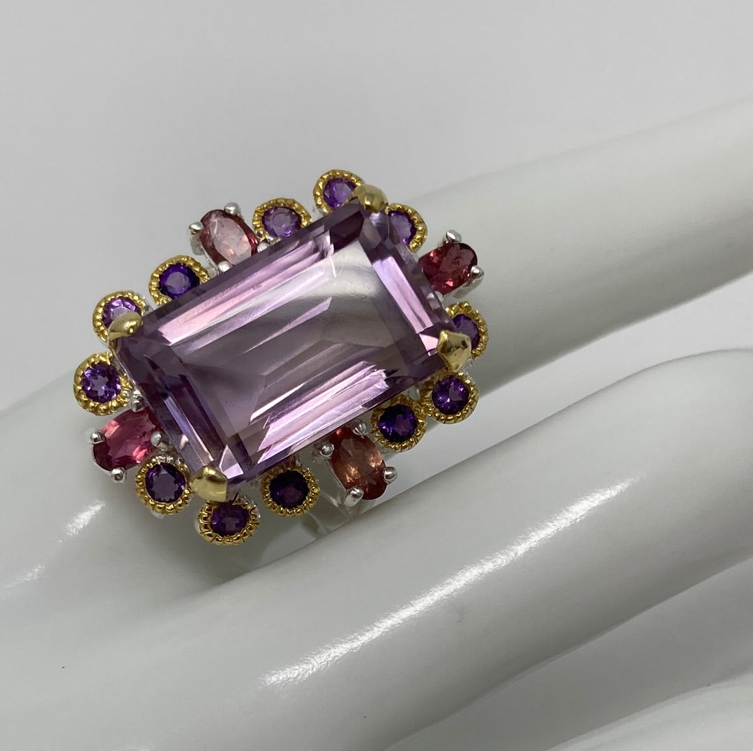 Extremely beautiful genuine Ametrine, in this highly desirable emerald cut faceting. A gemstone like this is a marriage between an Amethyst and a Citrine. The soft colors show the amazing color integration of this gemstone and a nice 15 CTW specimen surrounded by genuine rare Pink Tourmaline and Amethysts. Set in .925 sterling silver with a white gold overlay and yellow gold embellishments. Size 8 1/4, Resize at your jeweler or use a ring guard.
